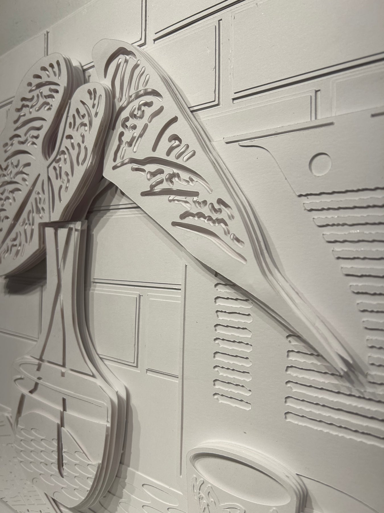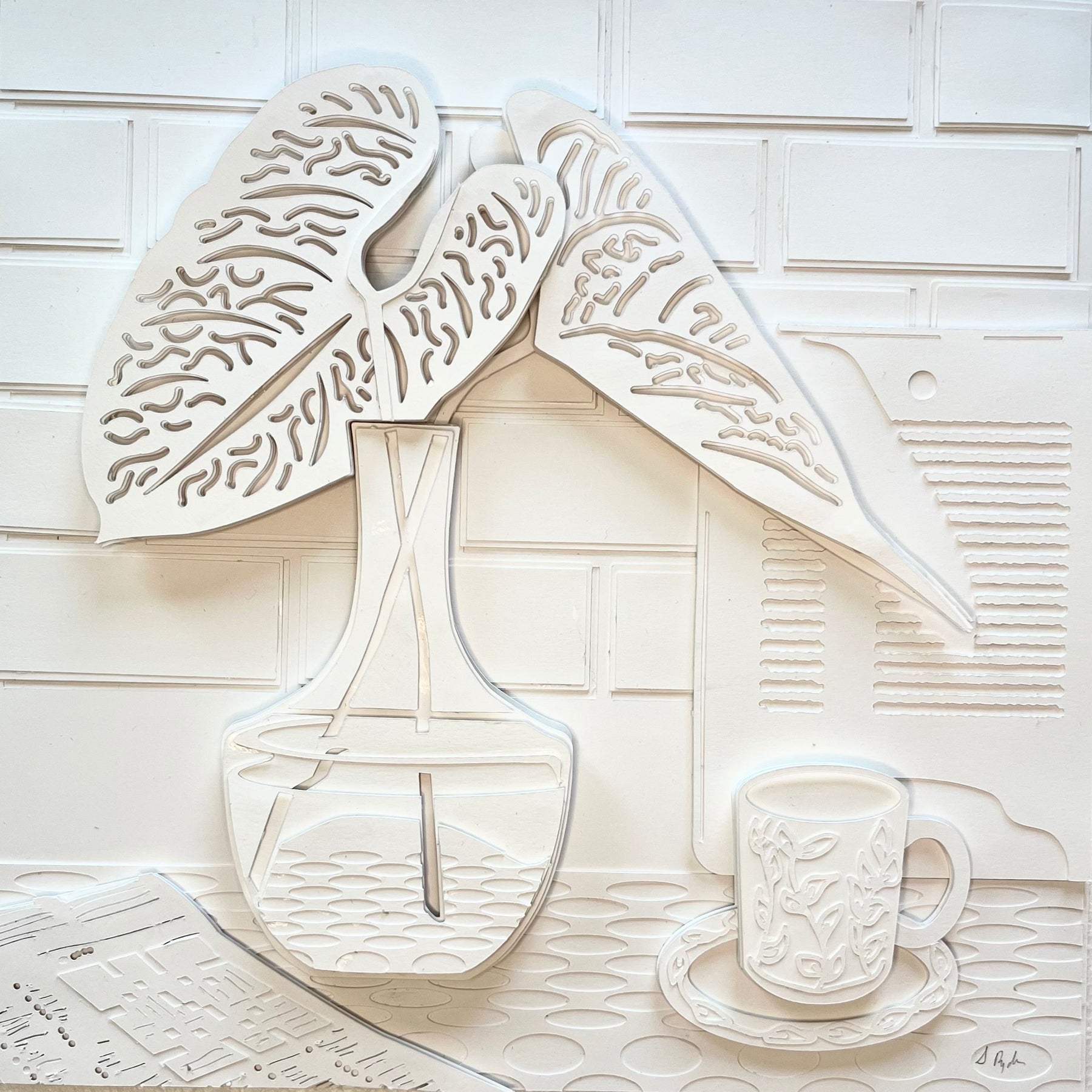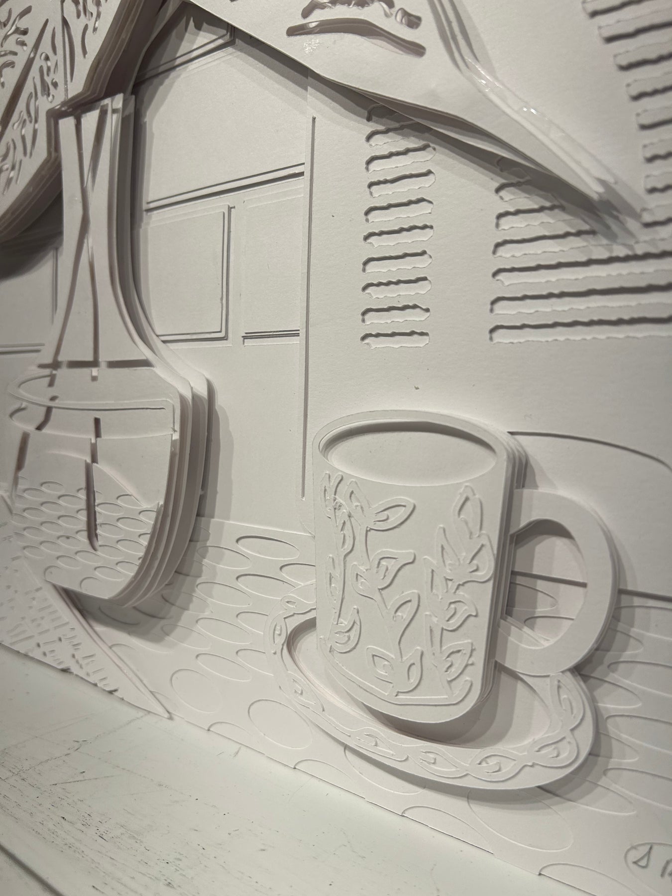 Susan Ryder's art is created by meticulously cutting and layering crisp white paper, distanced just a few millimeters apart. This technique allows for a full spectrum of colors to emerge solely from the shadows. The use of all white paper is important to allow the shadows to exist without distraction. The result is a dynamic sketch, rich with overlapping shadows that shift and change with the movement of light.