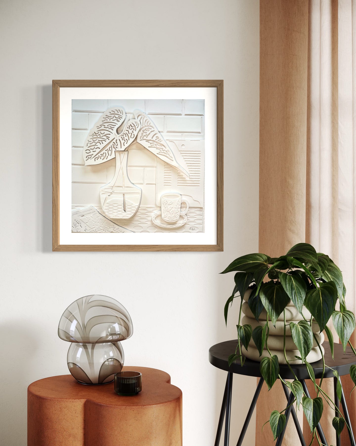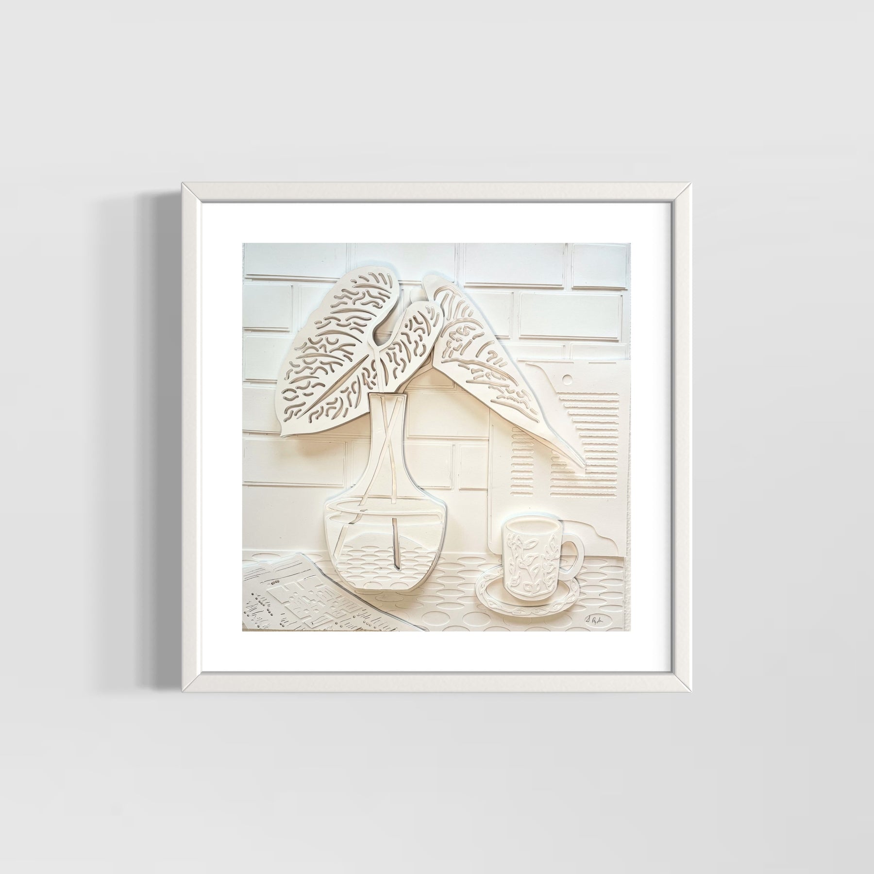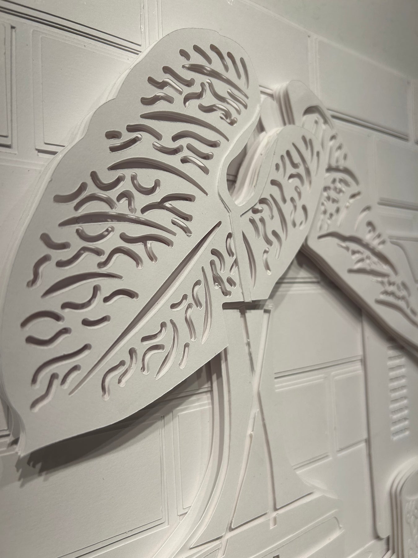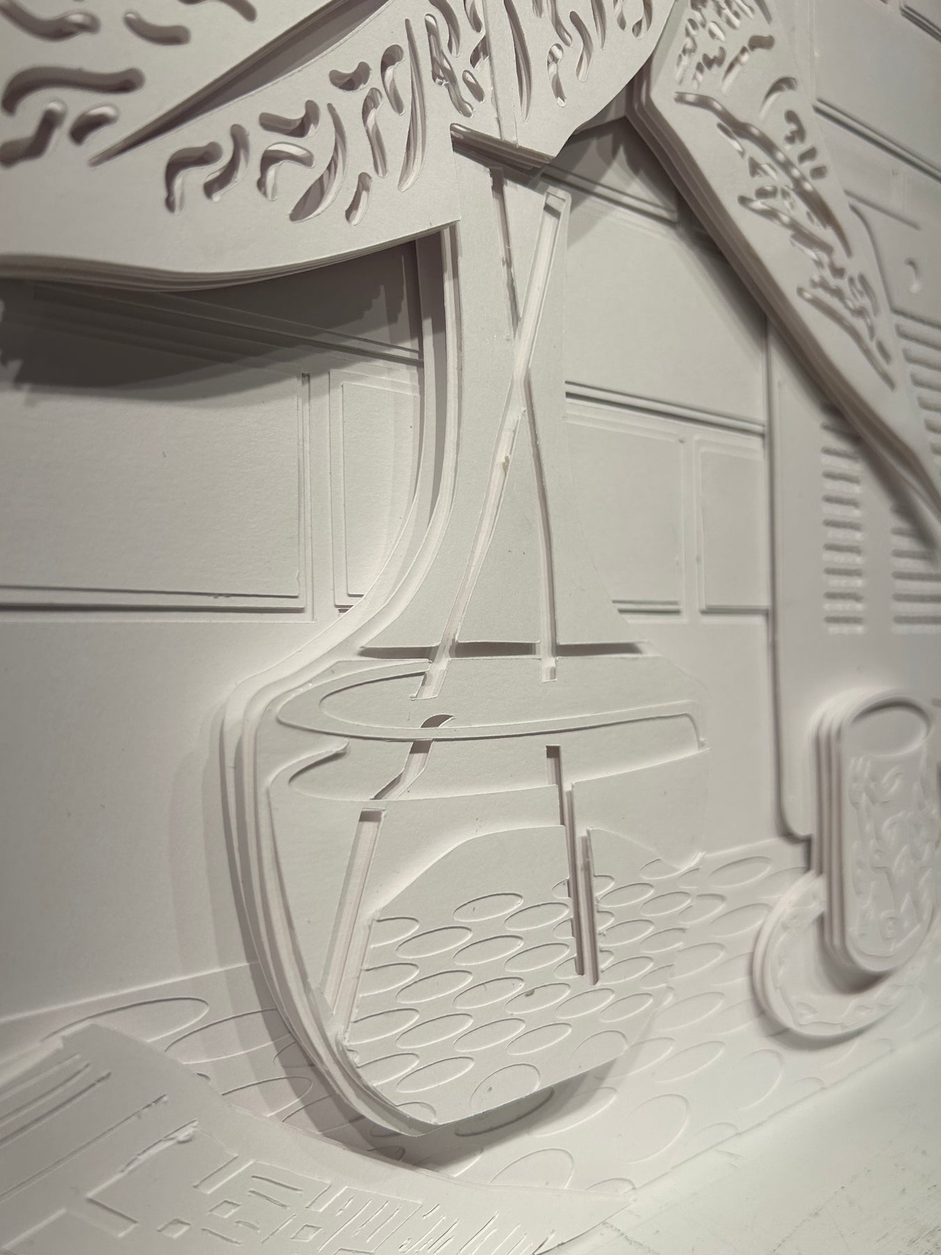 Susan Ryder's art is created by meticulously cutting and layering crisp white paper, distanced just a few millimeters apart. This technique allows for a full spectrum of colors to emerge solely from the shadows. The use of all white paper is important to allow the shadows to exist without distraction. The result is a dynamic sketch, rich with overlapping shadows that shift and change with the movement of light.