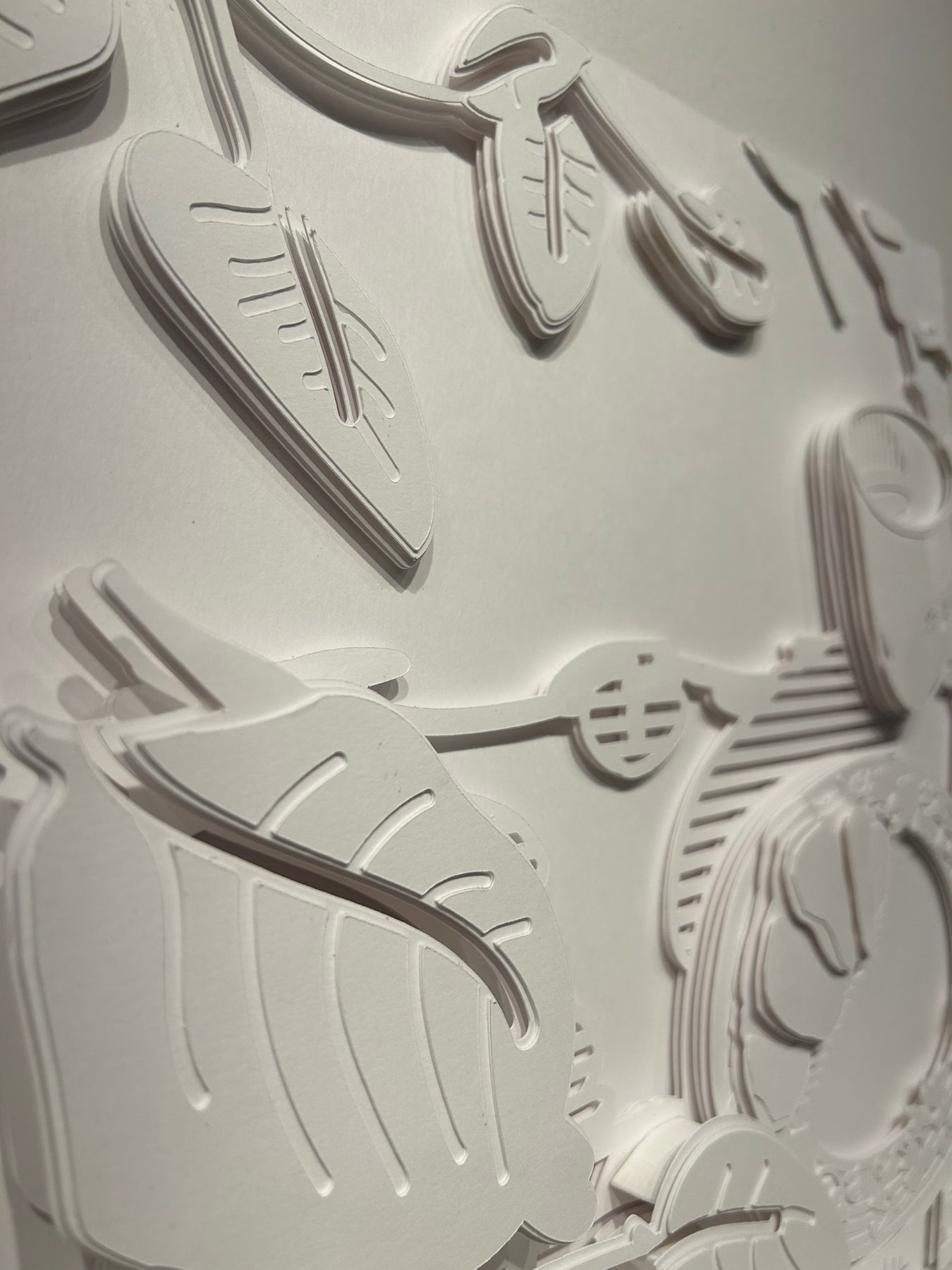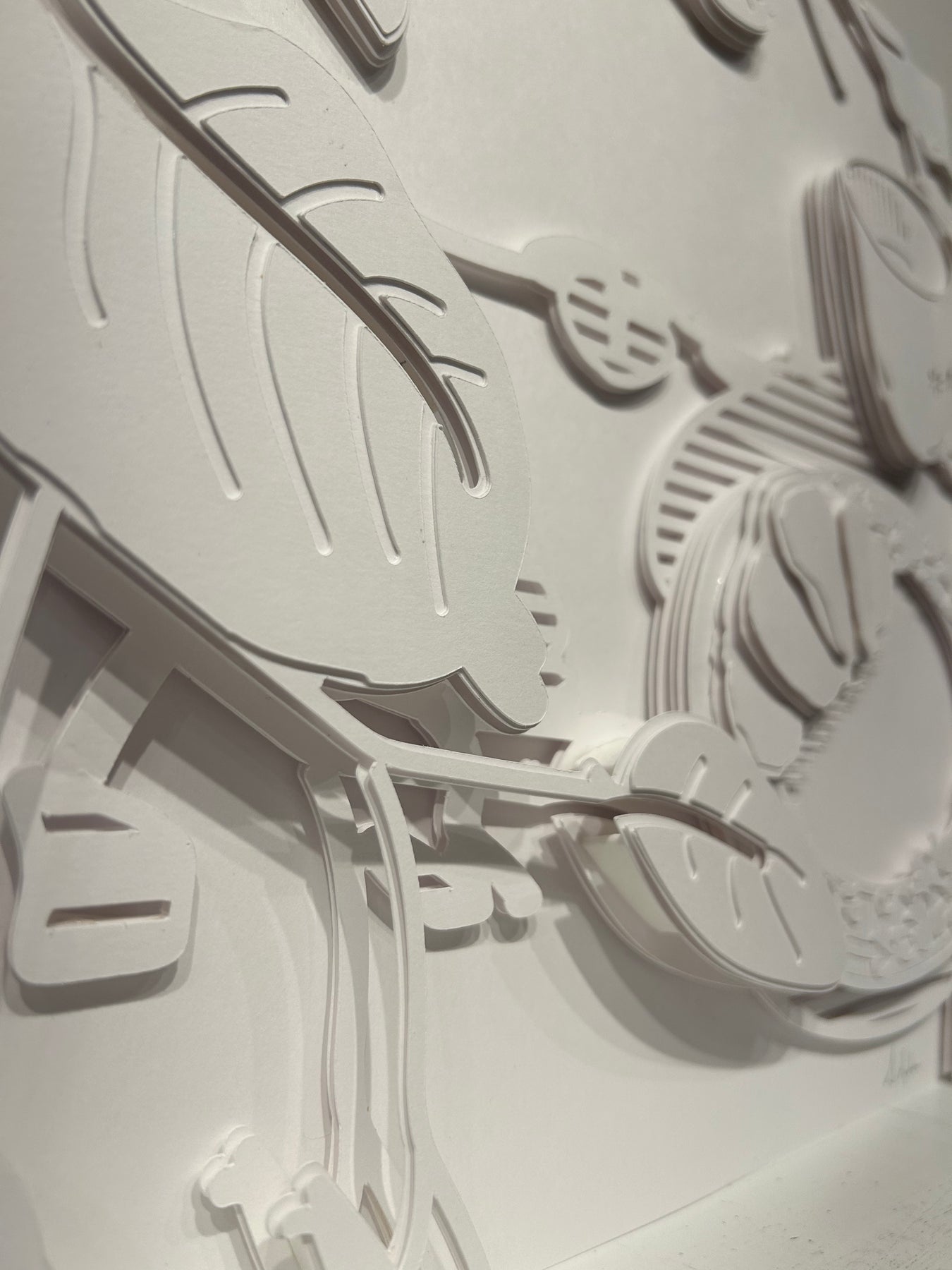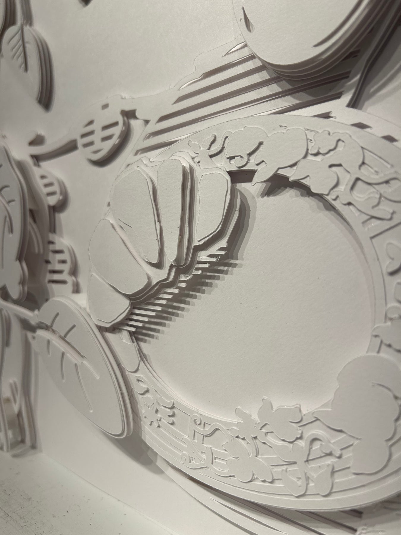 Susan Ryder's art is created by meticulously cutting and layering crisp white paper, distanced just a few millimeters apart. This technique allows for a full spectrum of colors to emerge solely from the shadows. The use of all white paper is important to allow the shadows to exist without distraction. The result is a dynamic sketch, rich with overlapping shadows that shift and change with the movement of light.