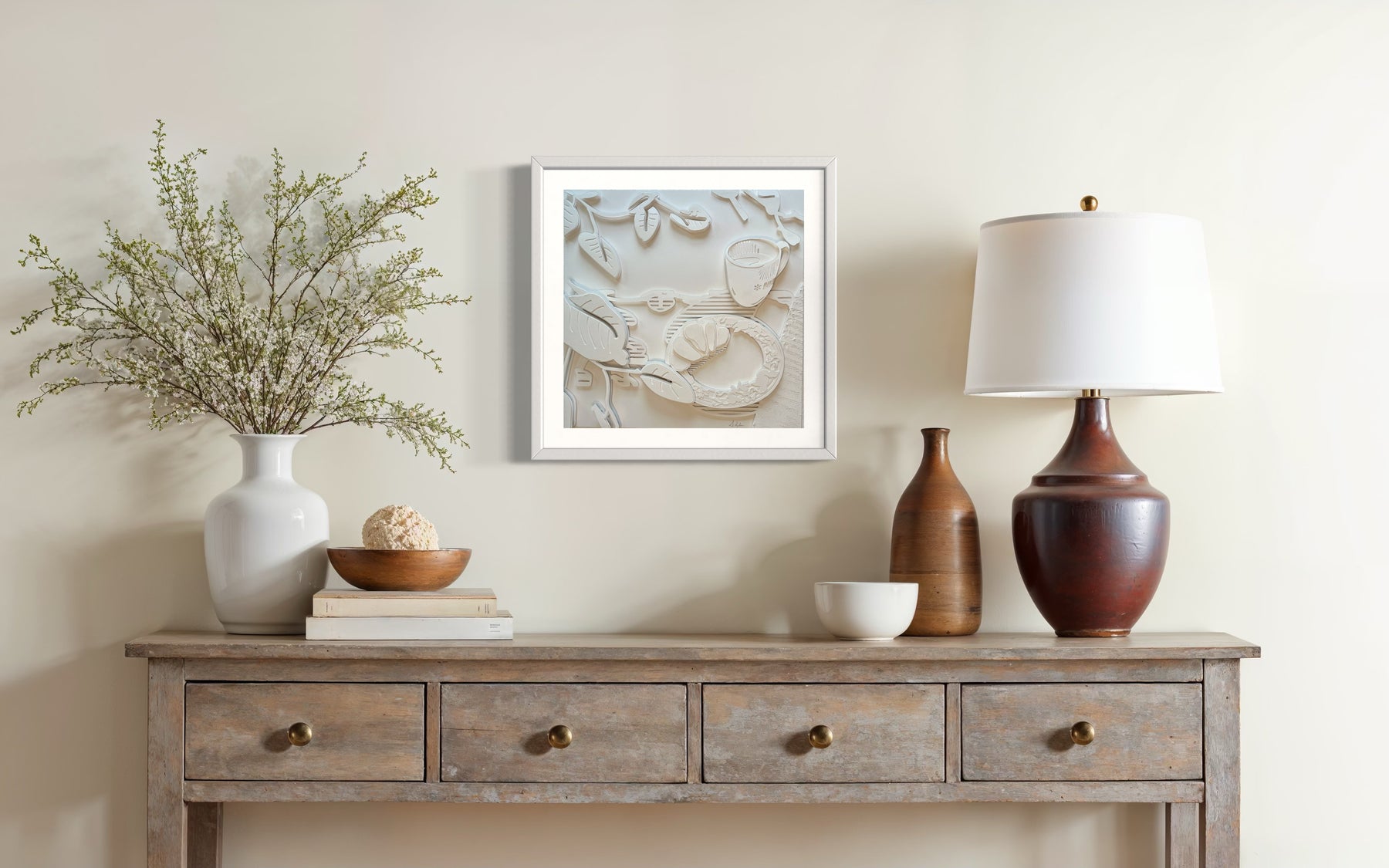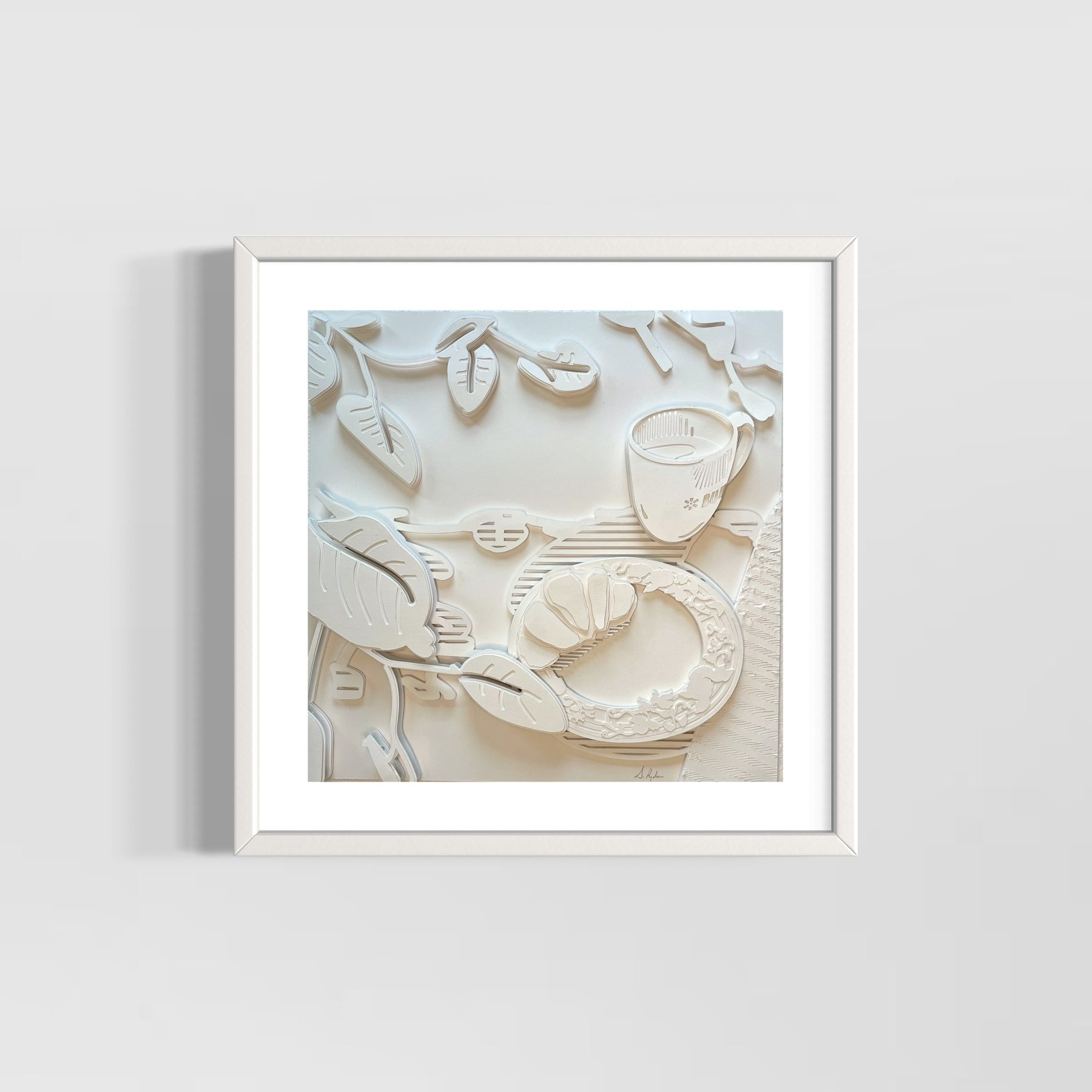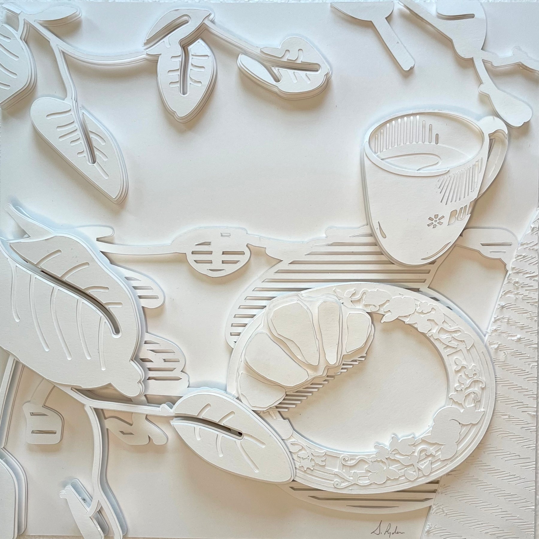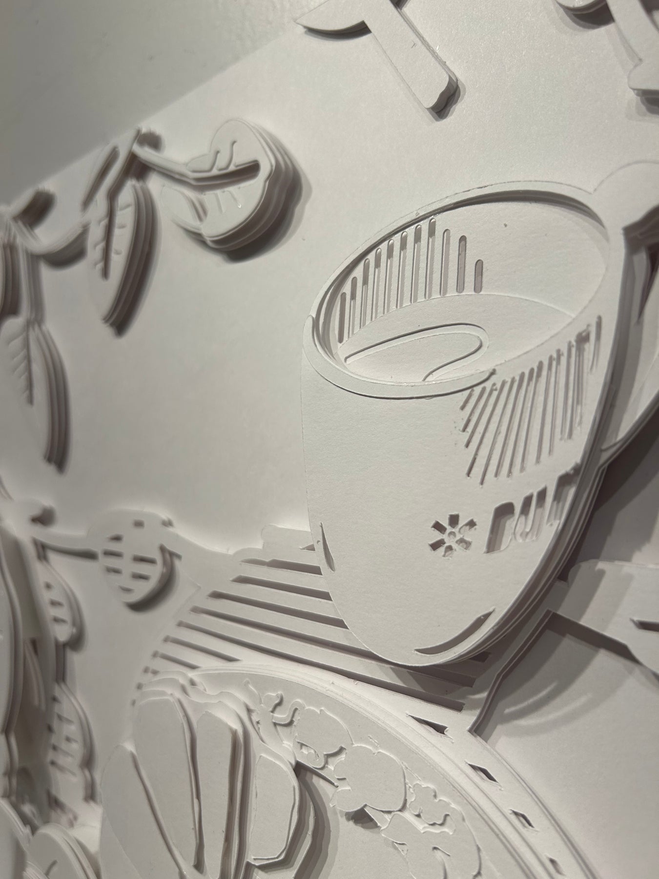 Susan Ryder's art is created by meticulously cutting and layering crisp white paper, distanced just a few millimeters apart. This technique allows for a full spectrum of colors to emerge solely from the shadows. The use of all white paper is important to allow the shadows to exist without distraction. The result is a dynamic sketch, rich with overlapping shadows that shift and change with the movement of light.