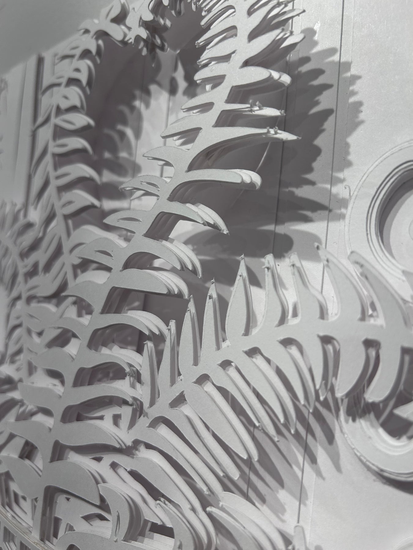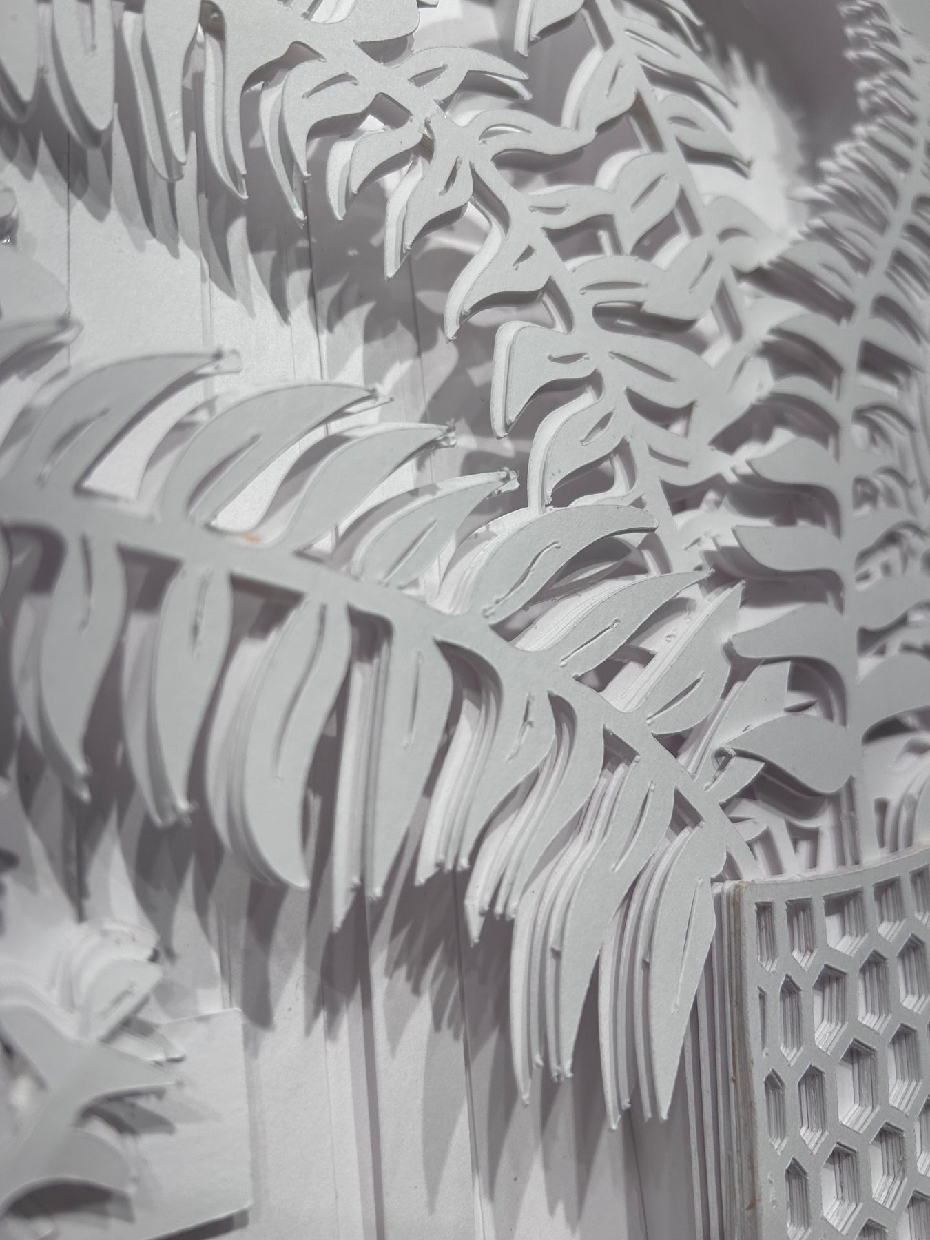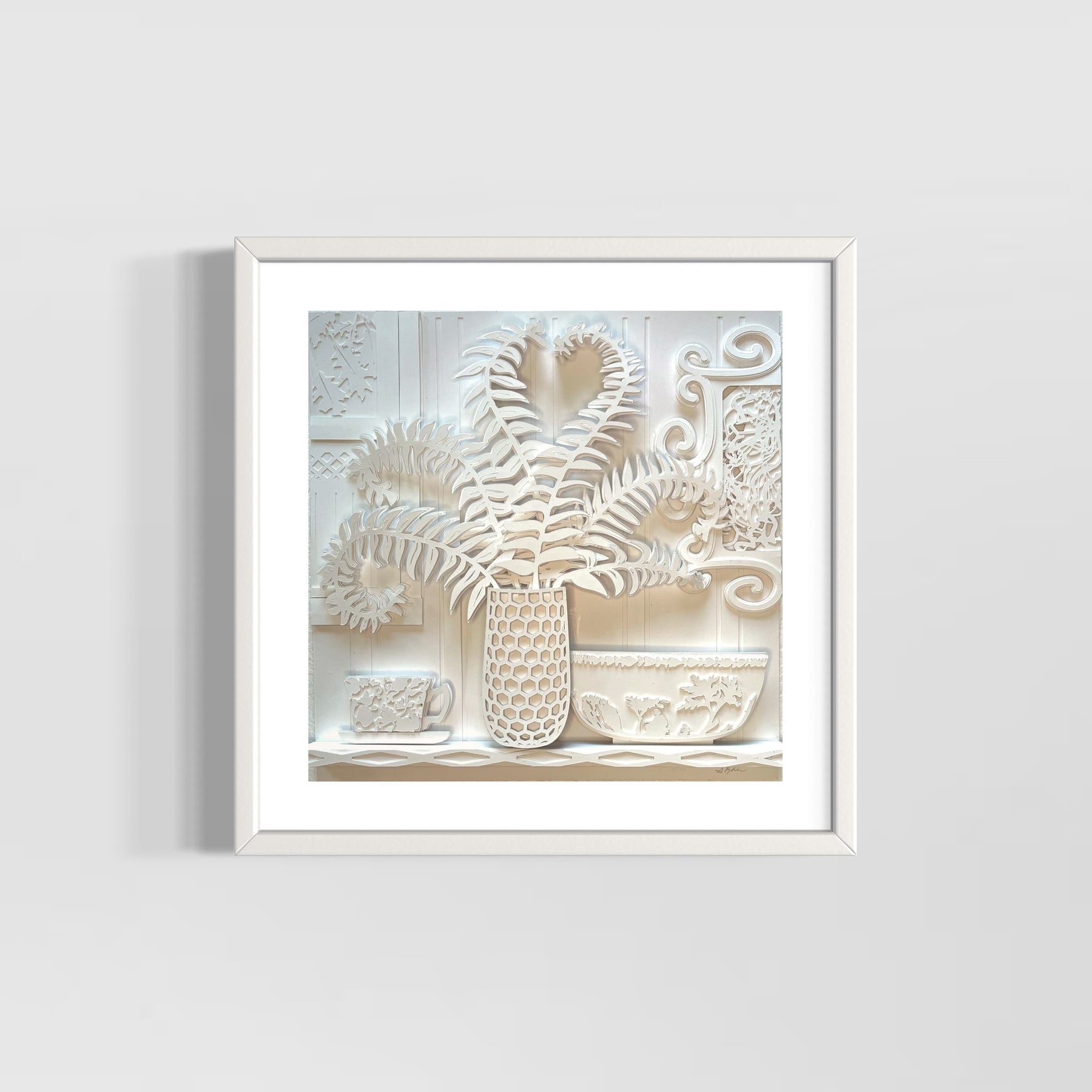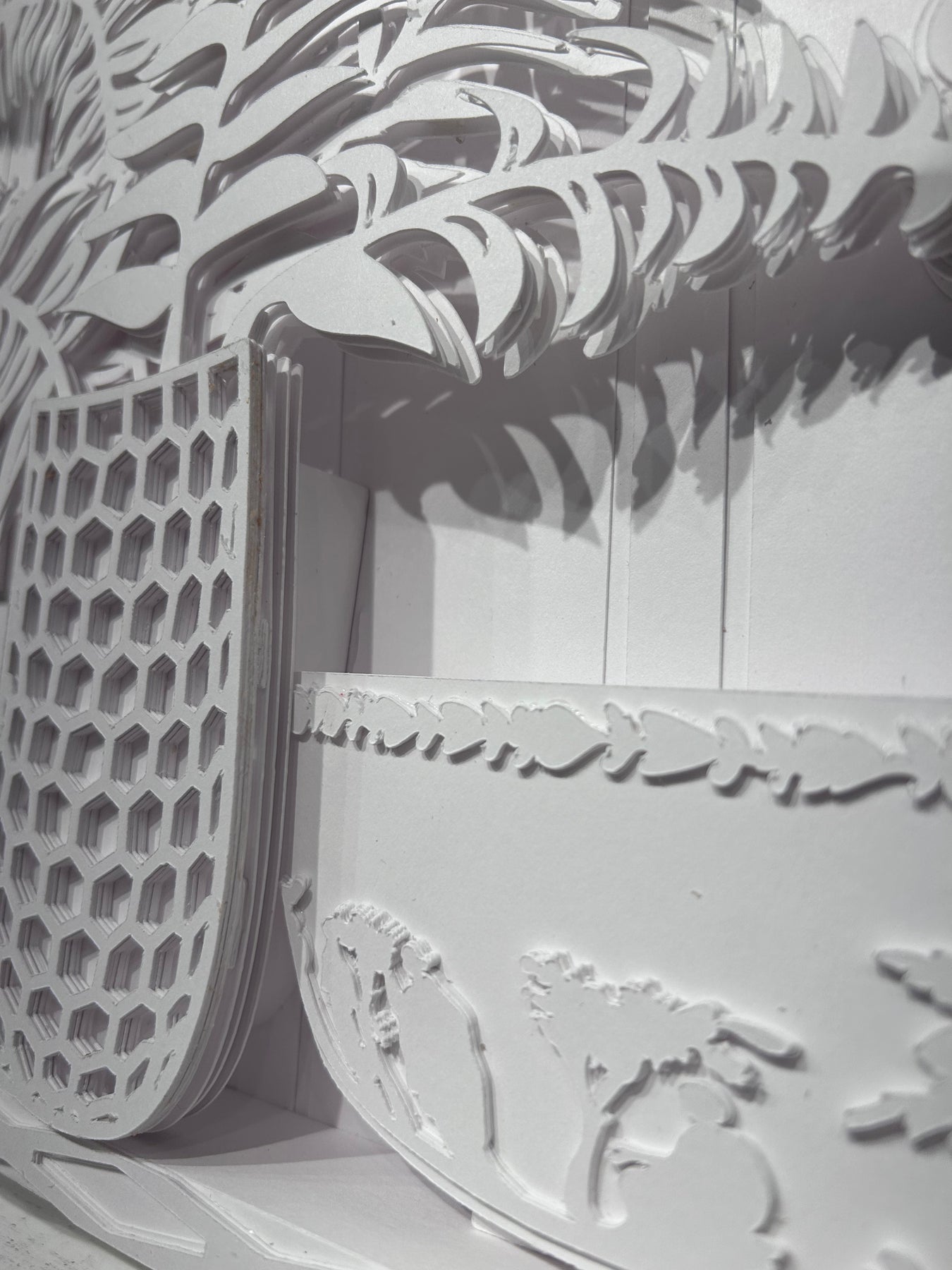 Susan Ryder's art is created by meticulously cutting and layering crisp white paper, distanced just a few millimeters apart. This technique allows for a full spectrum of colors to emerge solely from the shadows. The use of all white paper is important to allow the shadows to exist without distraction. The result is a dynamic sketch, rich with overlapping shadows that shift and change with the movement of light.