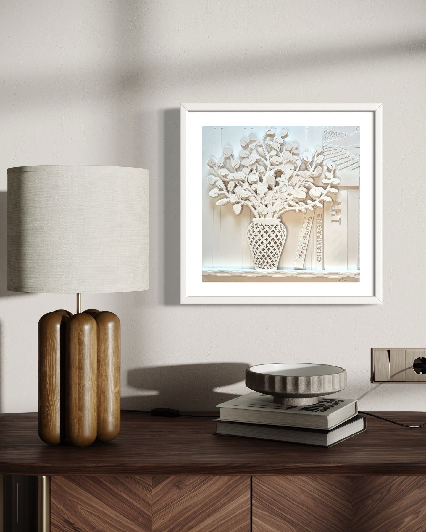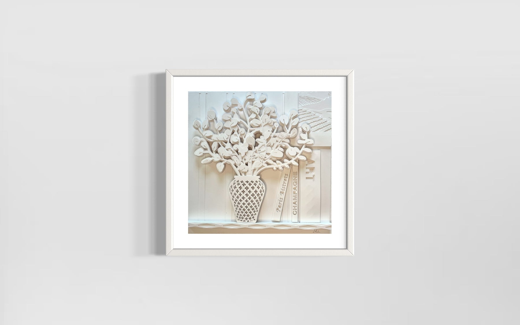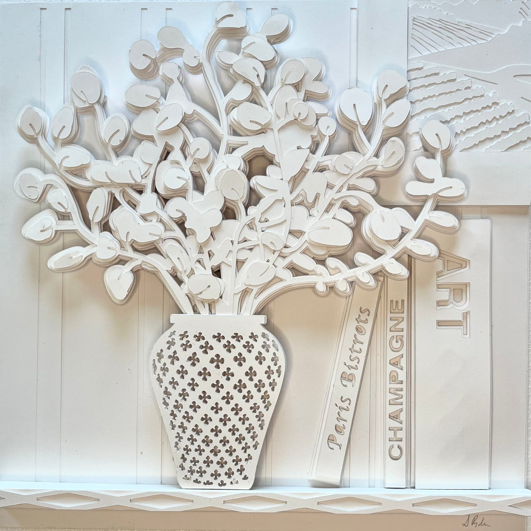 14"x14" layered white paper forming a vase with a eucalyptus over a wall.