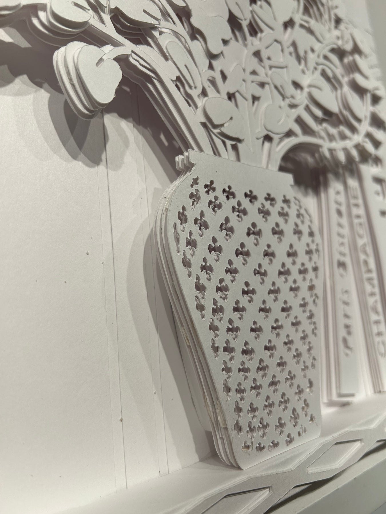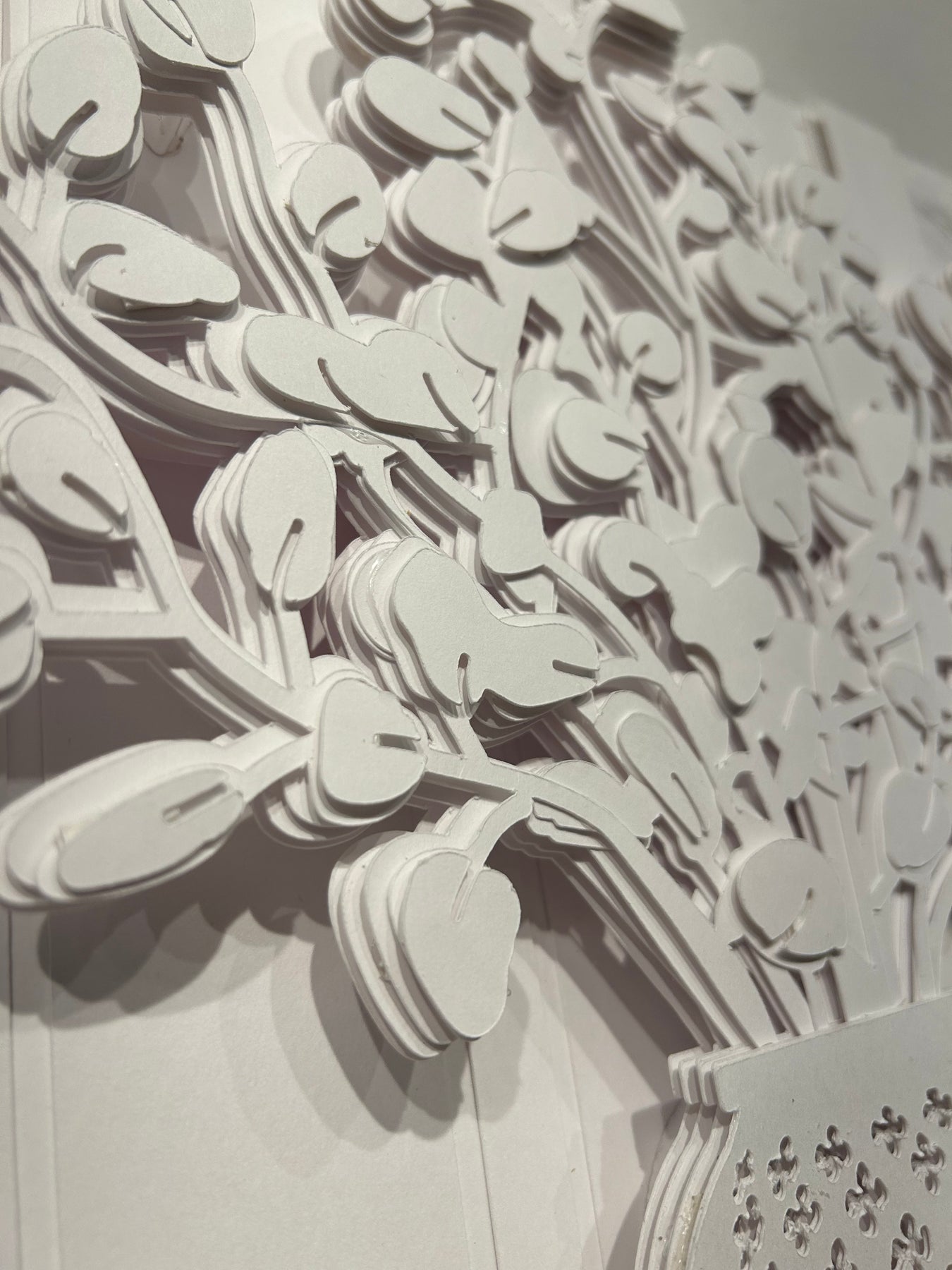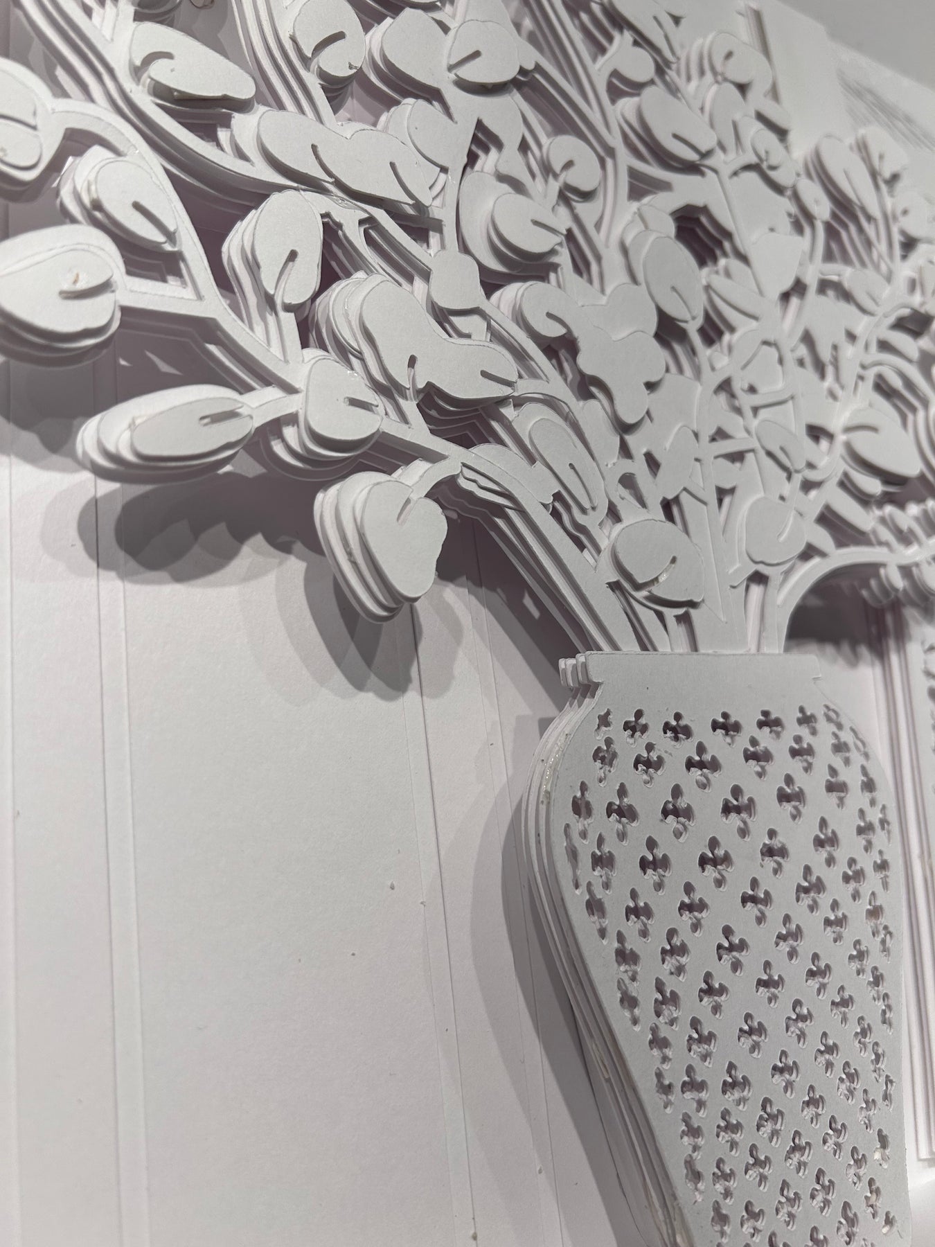 14"x14" layered white paper forming a vase with a fern over a wall.