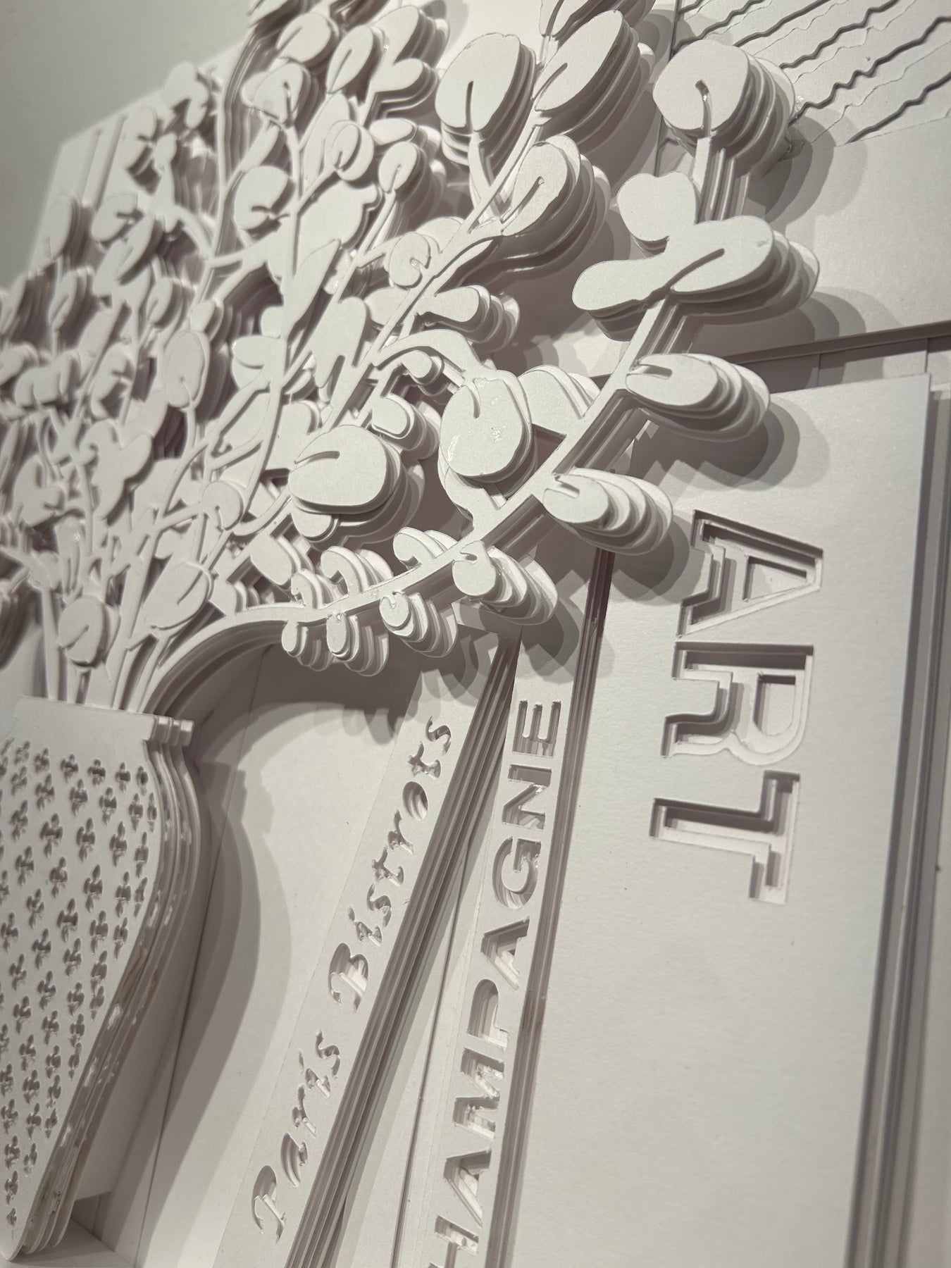 Susan Ryder's art is created by meticulously cutting and layering crisp white paper, distanced just a few millimeters apart. This technique allows for a full spectrum of colors to emerge solely from the shadows. The use of all white paper is important to allow the shadows to exist without distraction.  The result is a dynamic sketch, rich with overlapping shadows that shift and change with the movement of light.