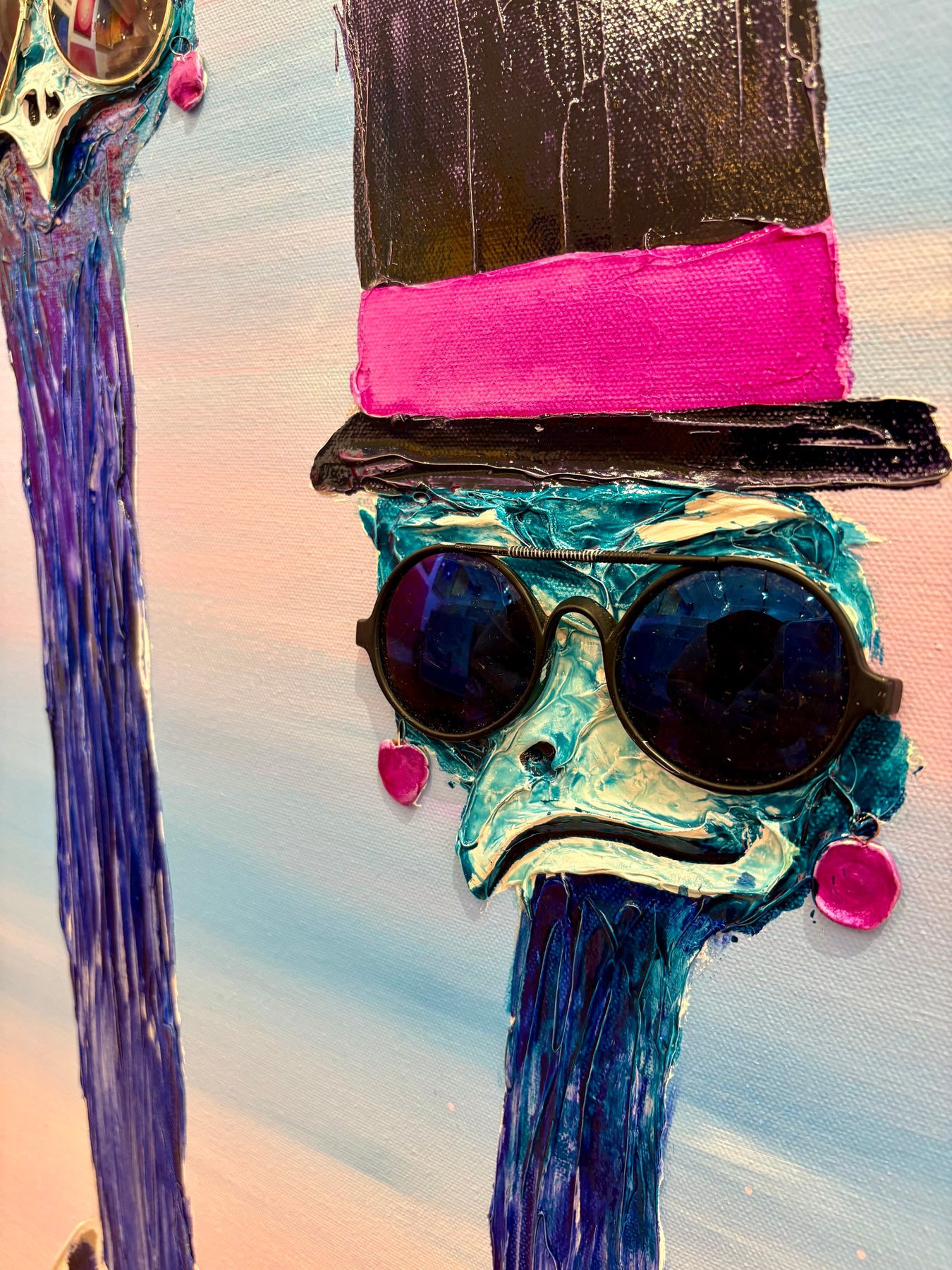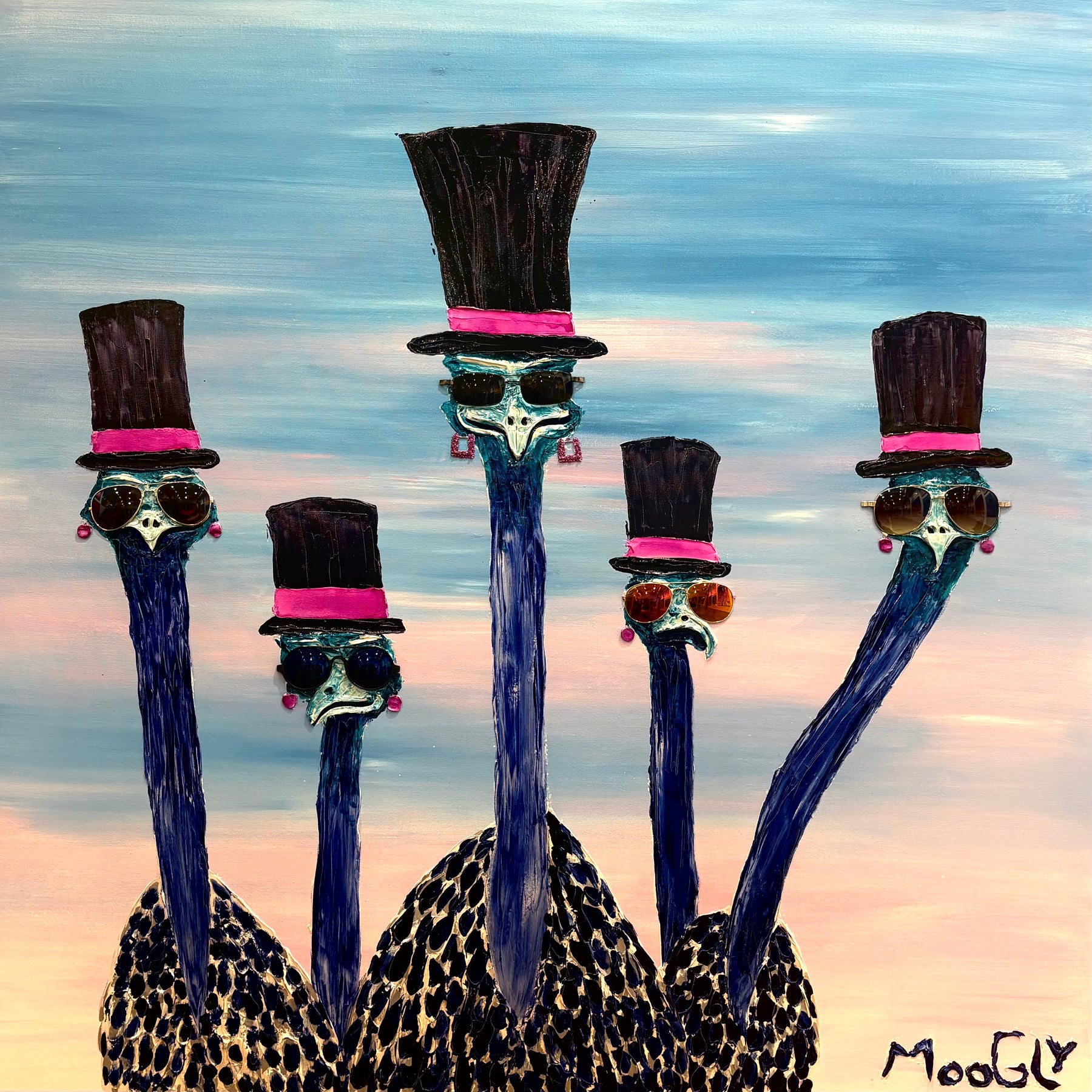 French graphic designer, illustrator, and painter Moogly creates semi-abstract "humanimal" portraits. His textured, splattered animals have oddly complex human expressions from bewilderment to apathy. Using acrylic, lacquer, and resin, he positions the monochromatic characters against a black void, allowing the eyes, marked by two machine washers, to speak. Moogly is deeply ashamed of the environmental harm caused by humans, so he allows animals to reflect this emotional damage back at us.