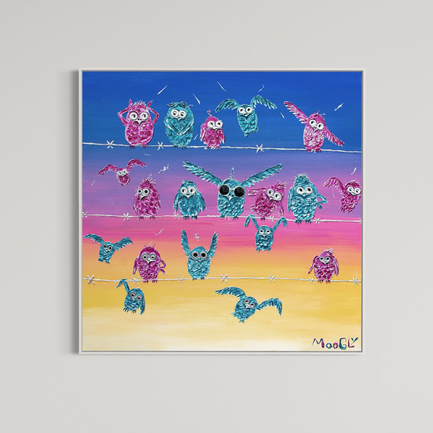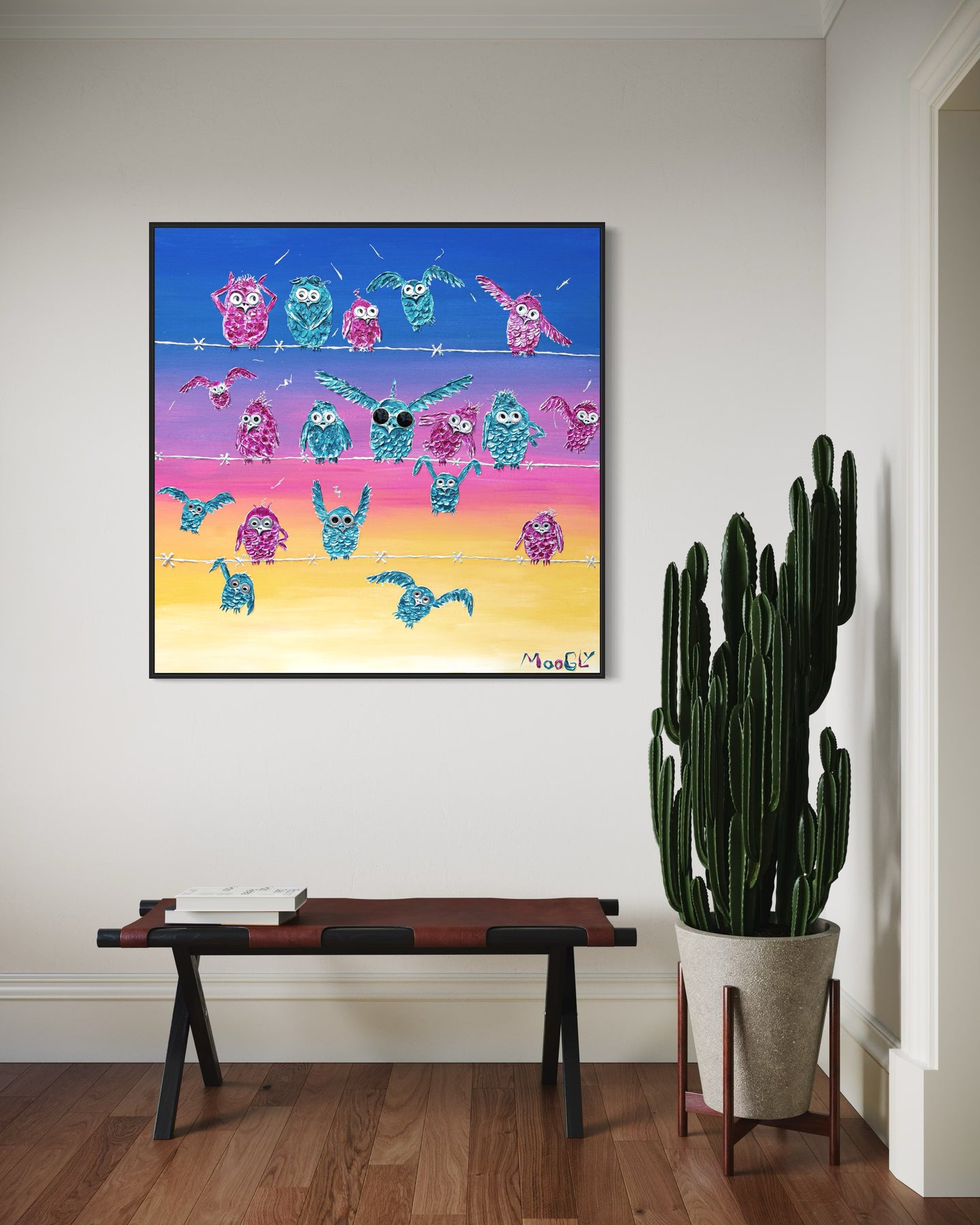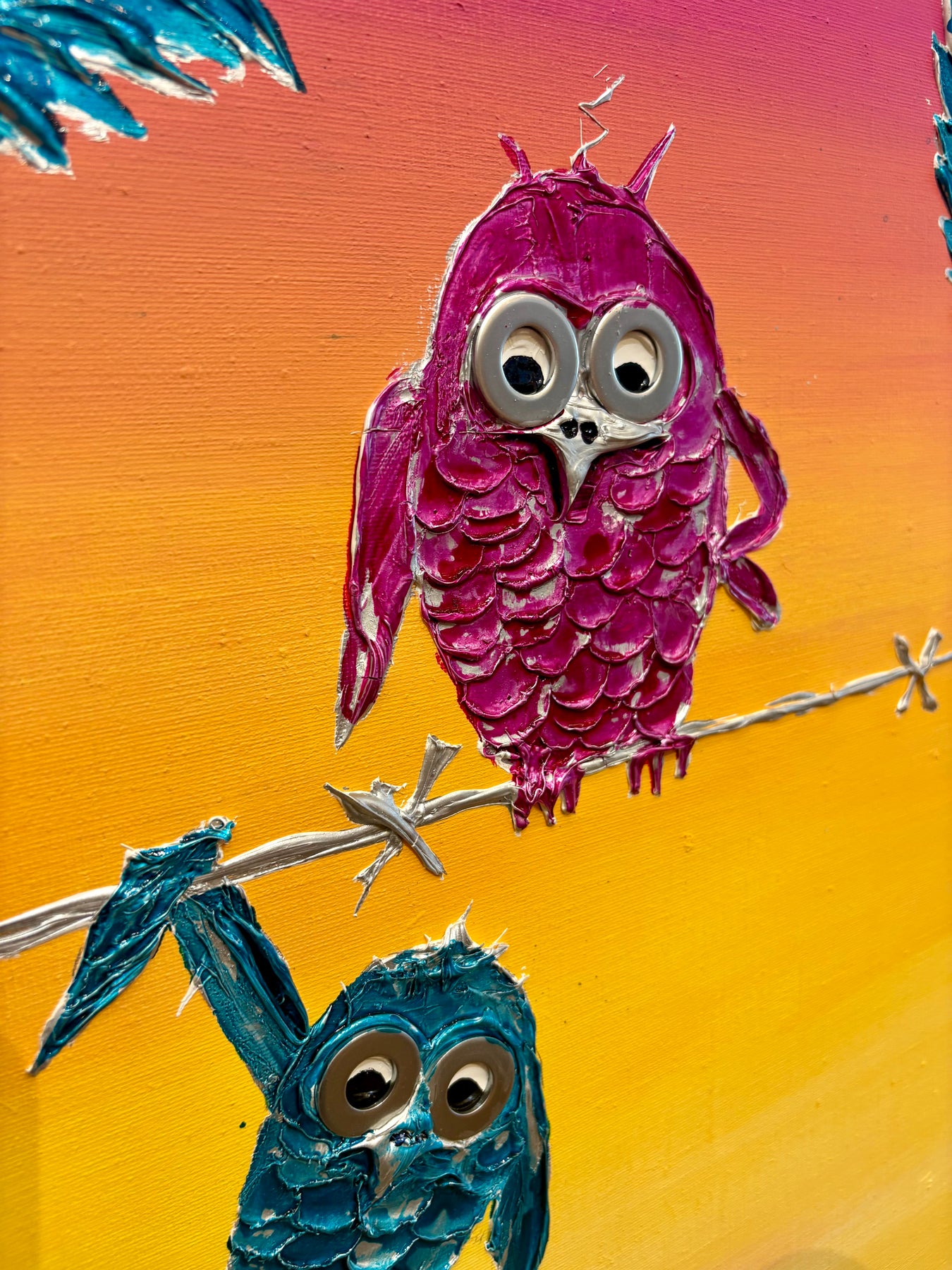 48" x 48" acrylic on canvas painting of pink and blue birds on barbed wire over a yellow-pink-blue gradient background.