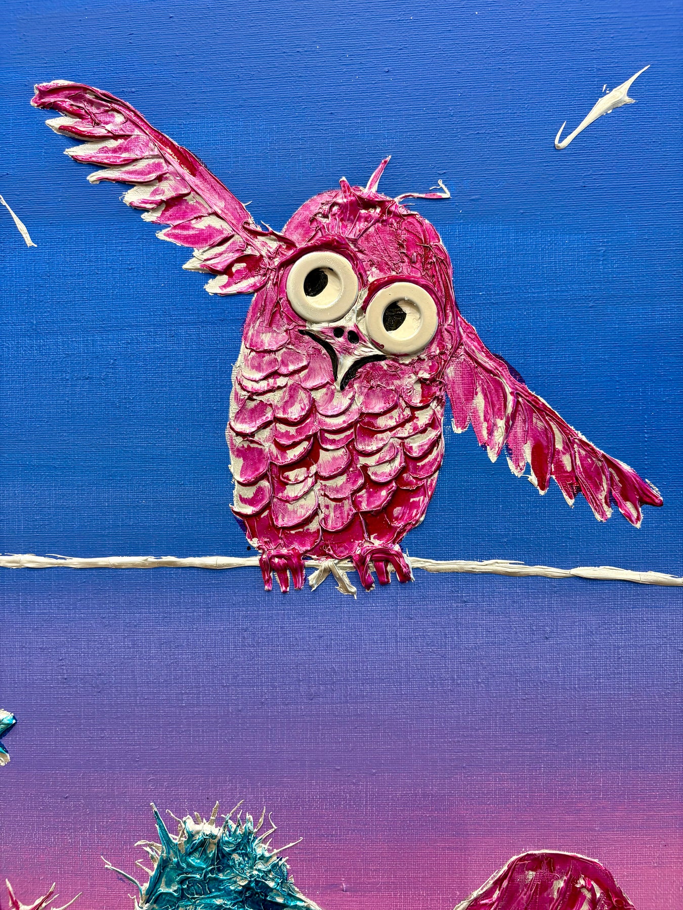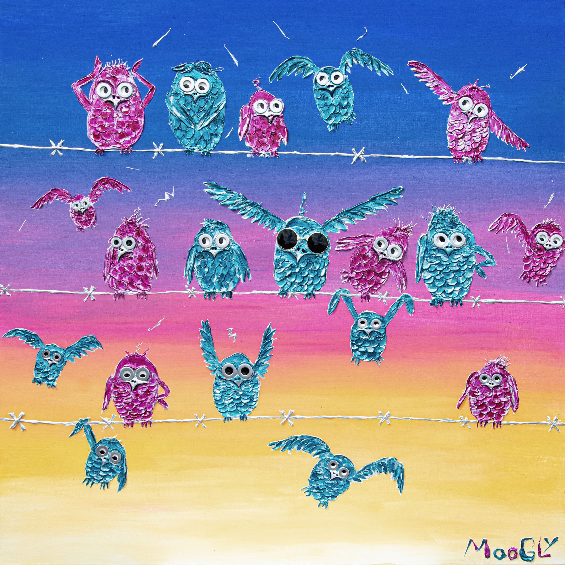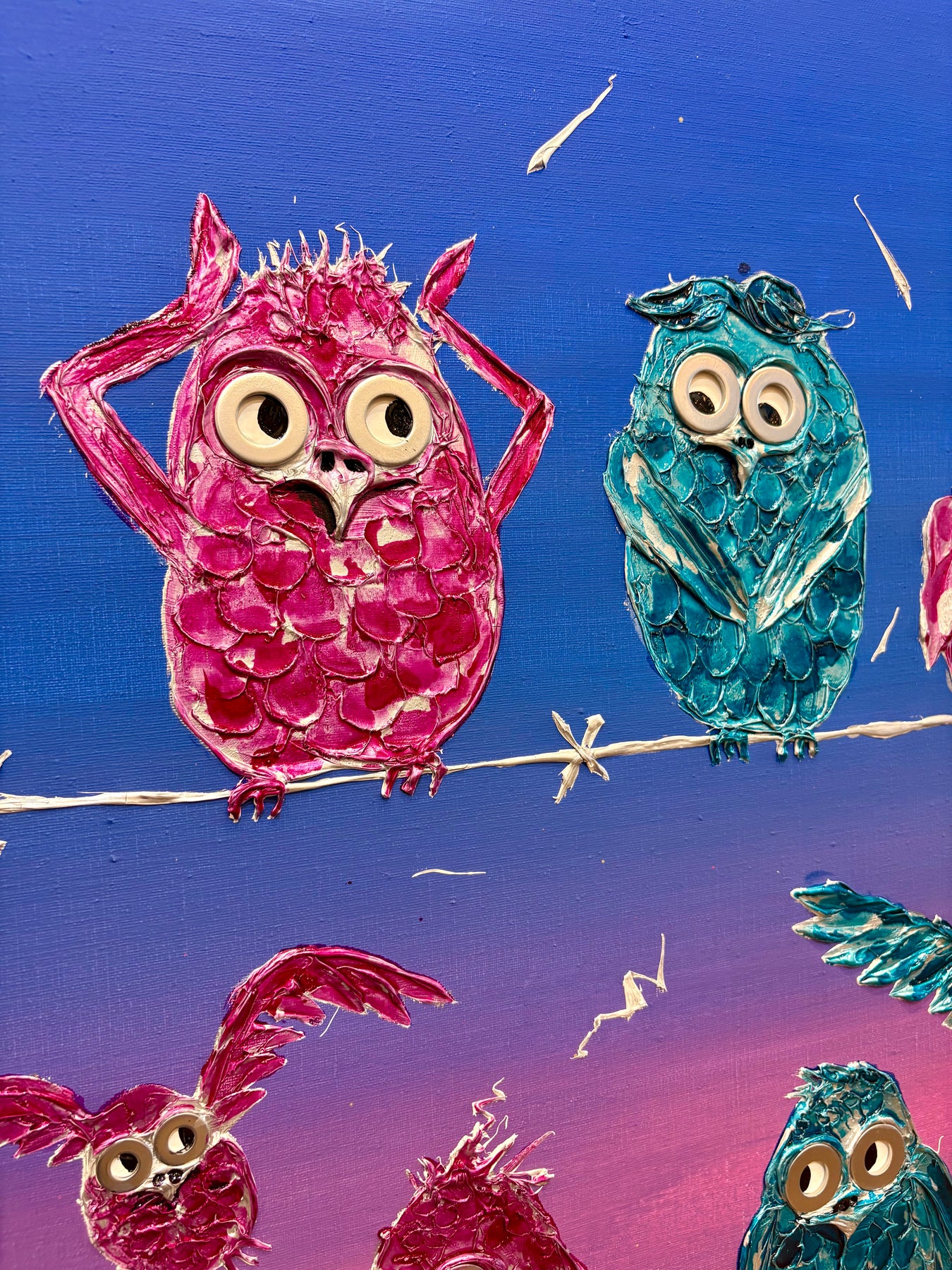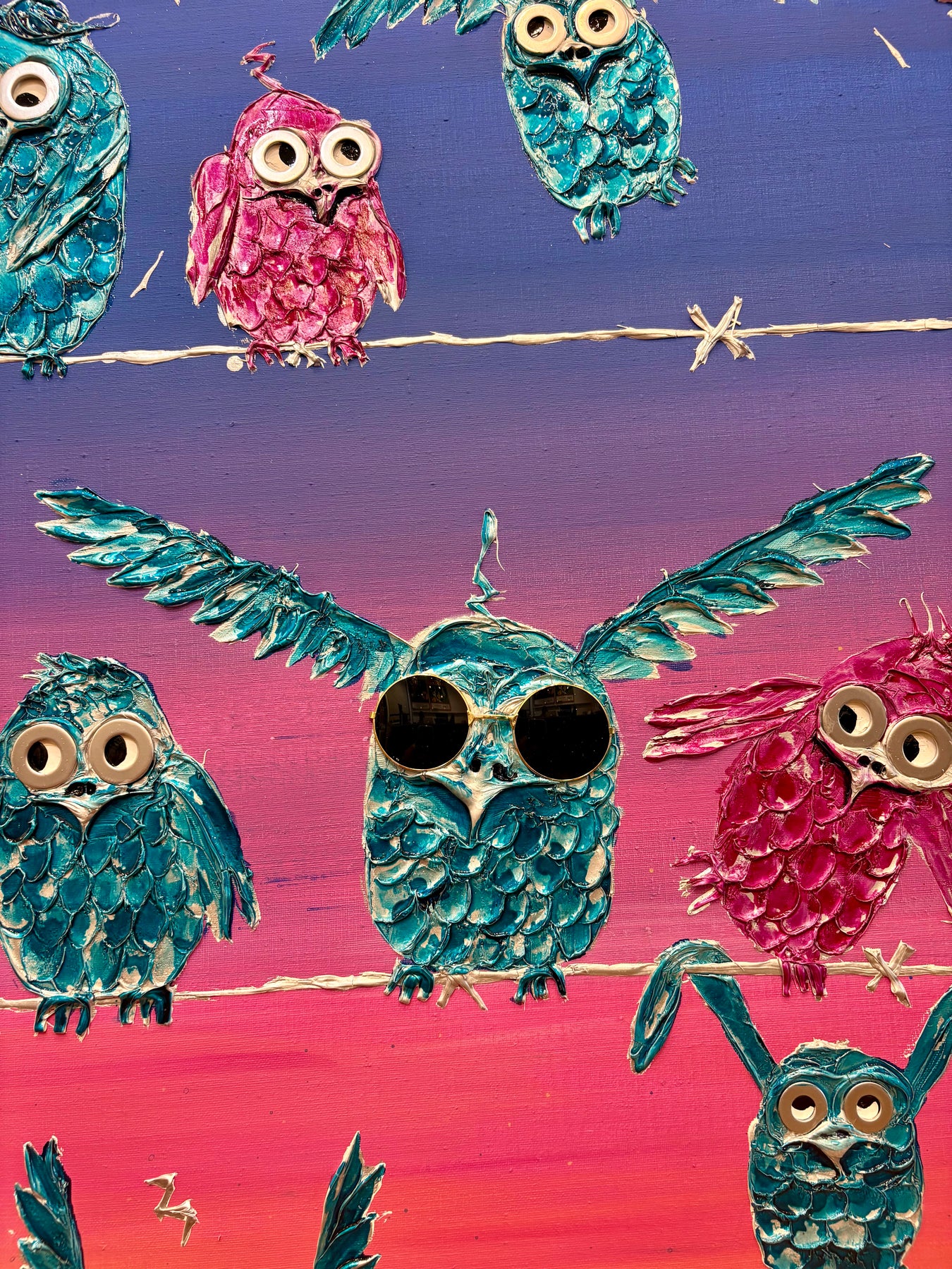 48" x 48" acrylic on canvas painting of pink and blue birds on barbed wire over a yellow-pink-blue gradient background.