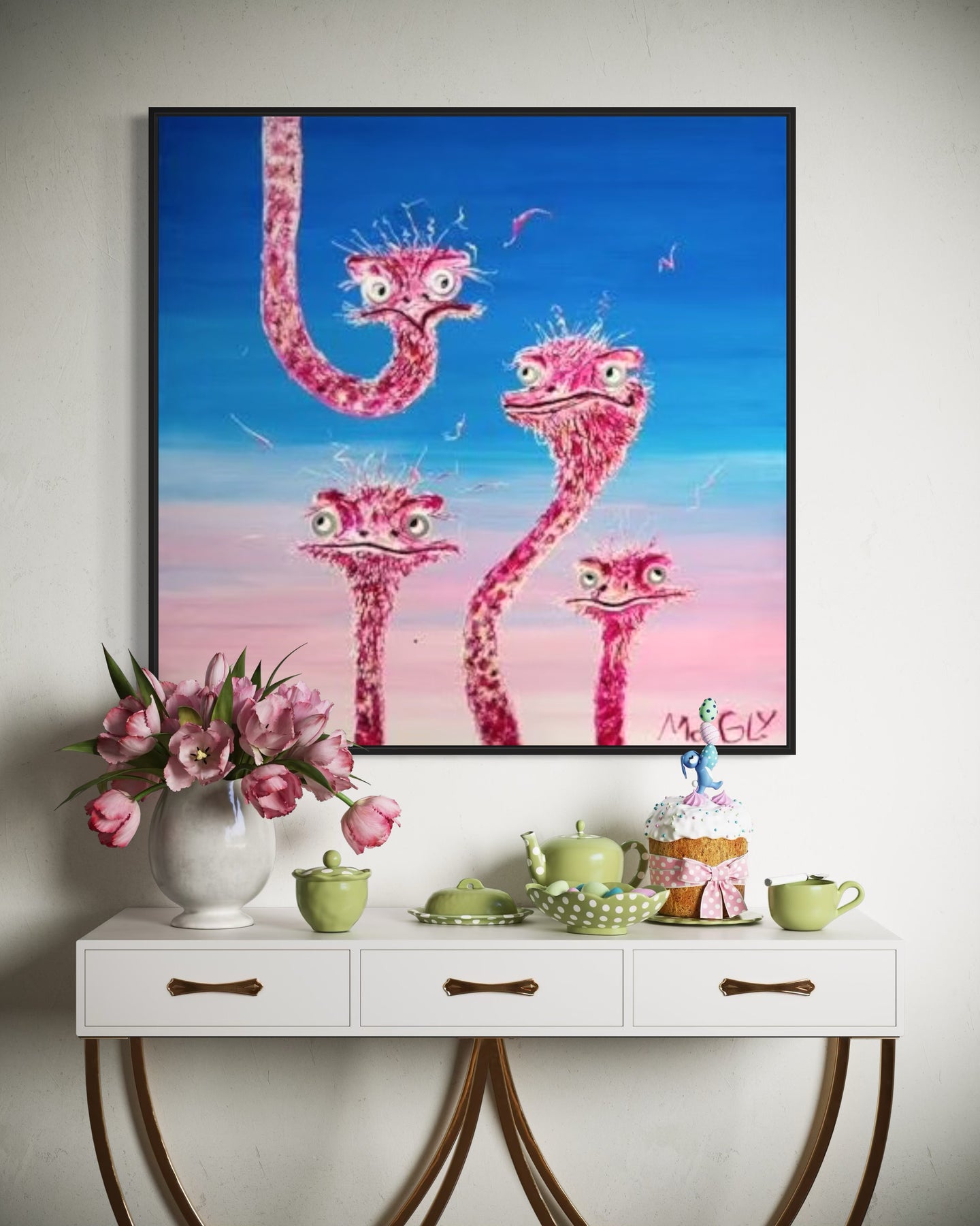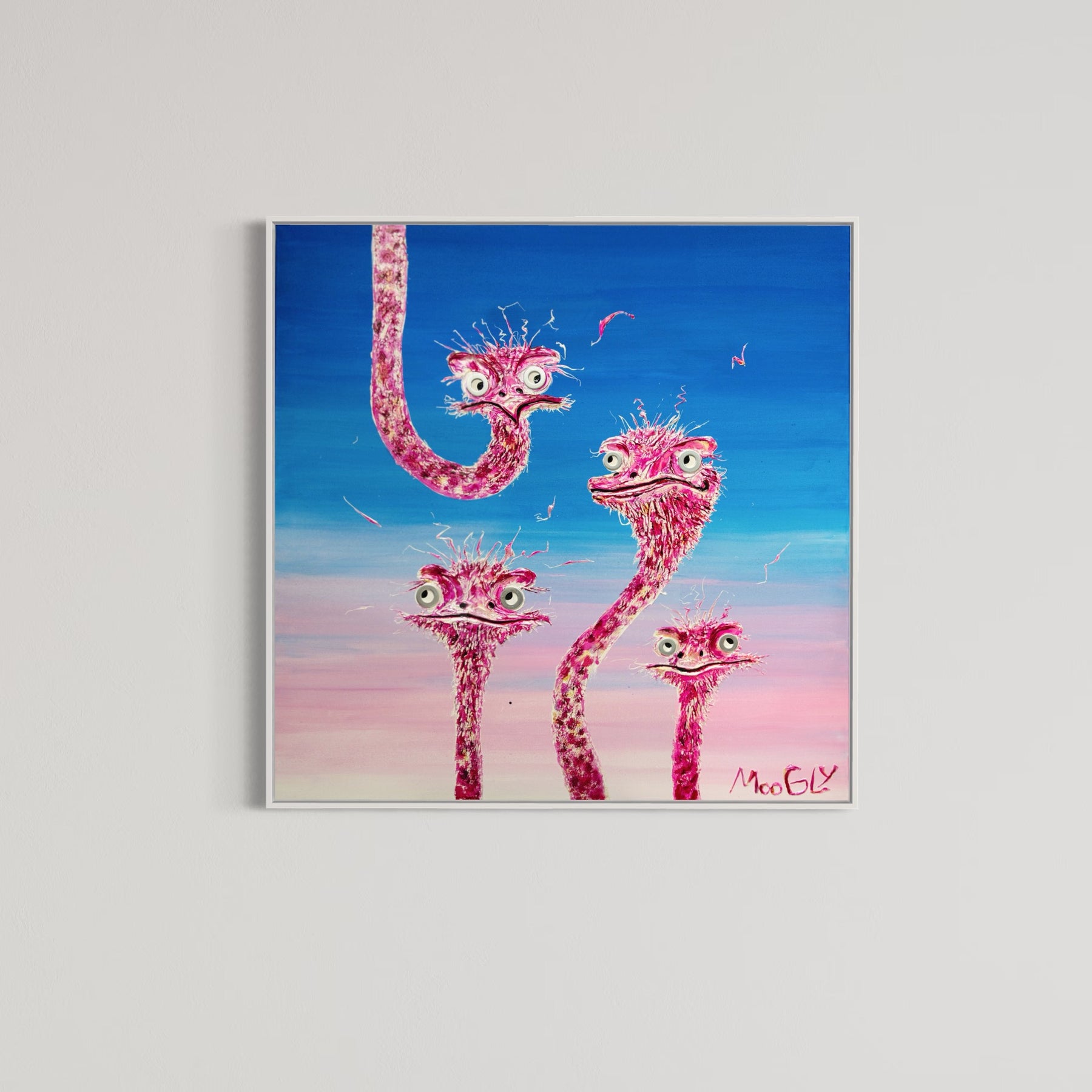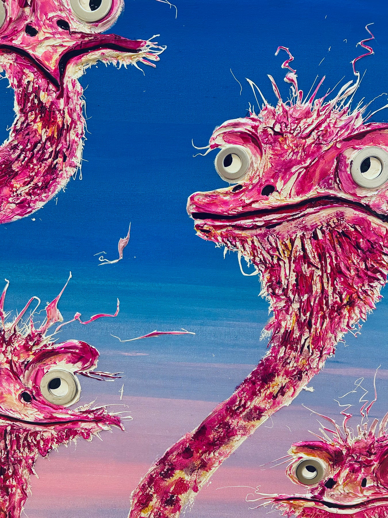 40" x 40" acrylic on canvas painting of a family of pink flamingos over a blue-pink gradient background. Washers used as eyes.