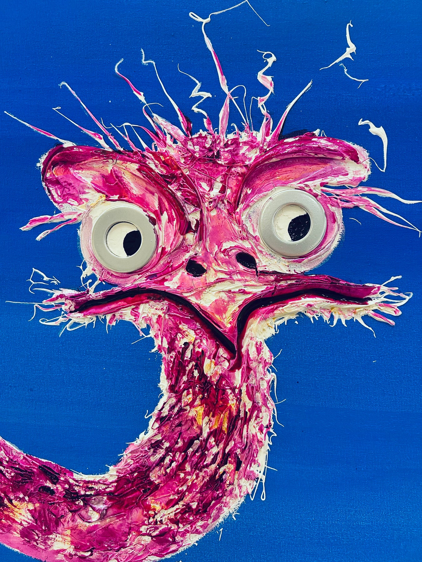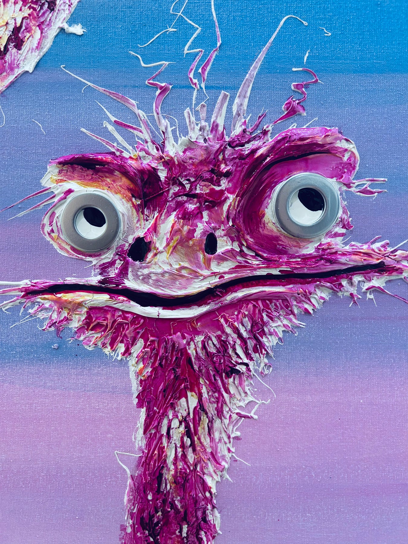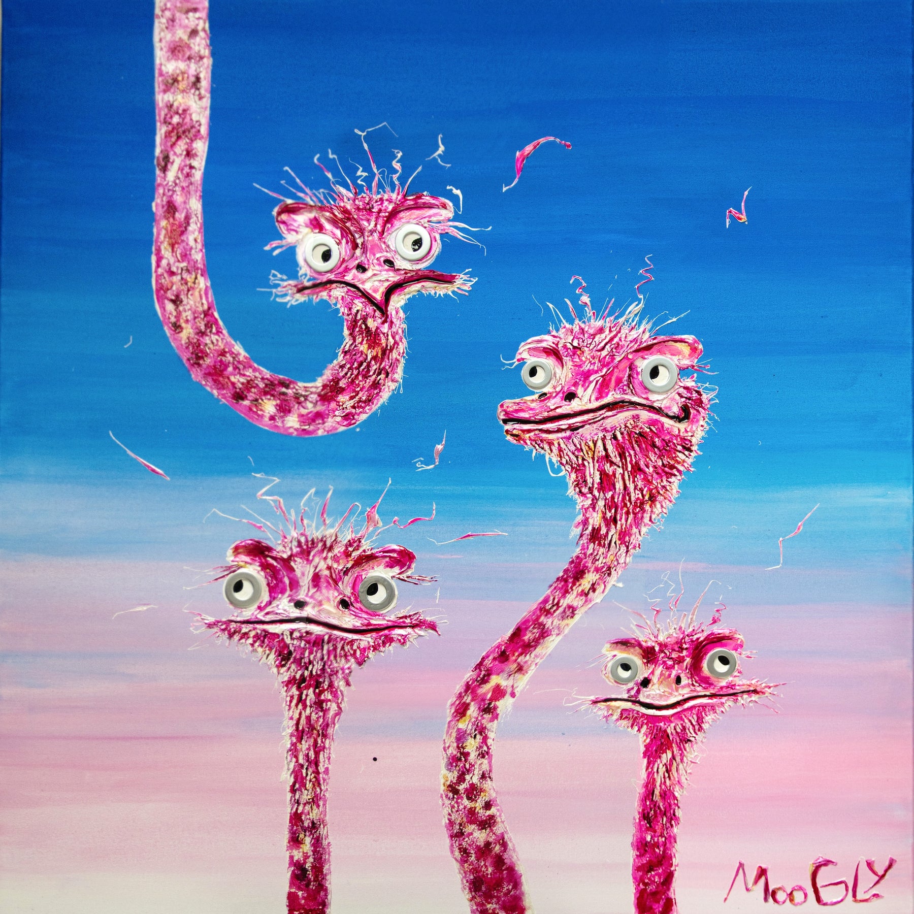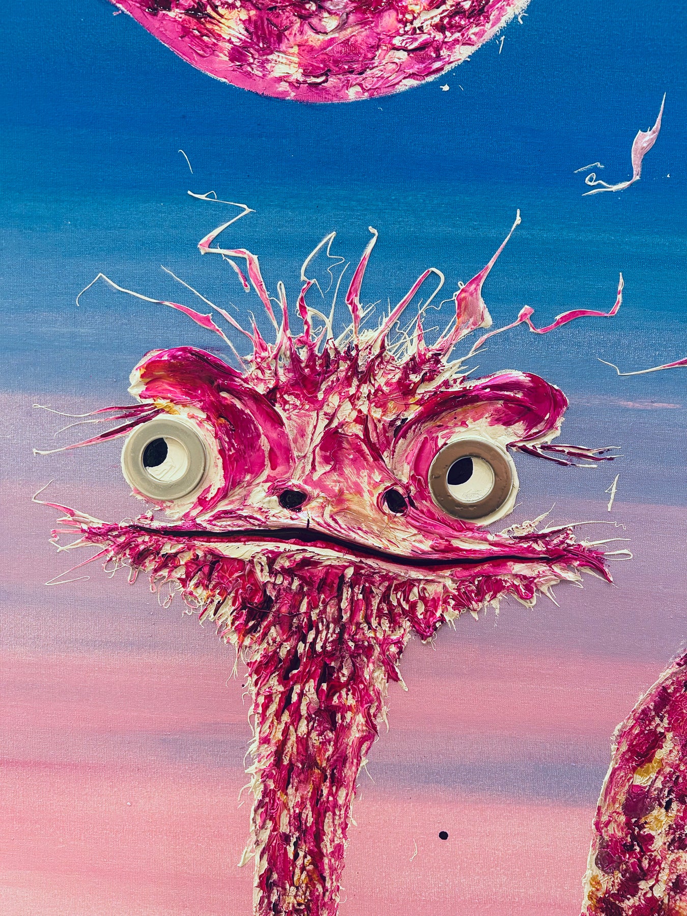 40" x 40" acrylic on canvas painting of a family of pink flamingos over a blue-pink gradient background. Washers used as eyes.