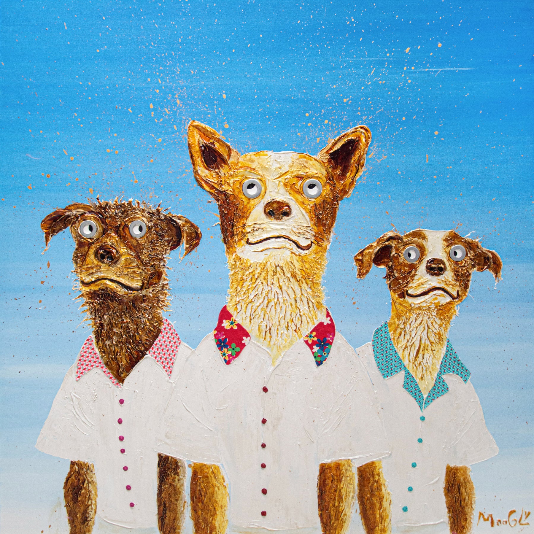 French graphic designer, illustrator, and painter Moogly creates semi-abstract "humanimal" portraits. His textured, splattered animals have oddly complex human expressions from bewilderment to apathy. Using acrylic, lacquer, and resin, he positions the monochromatic characters against a black void, allowing the eyes, marked by two machine washers, to speak. Moogly is deeply ashamed of the environmental harm caused by humans, so he allows animals to reflect this emotional damage back at us.
