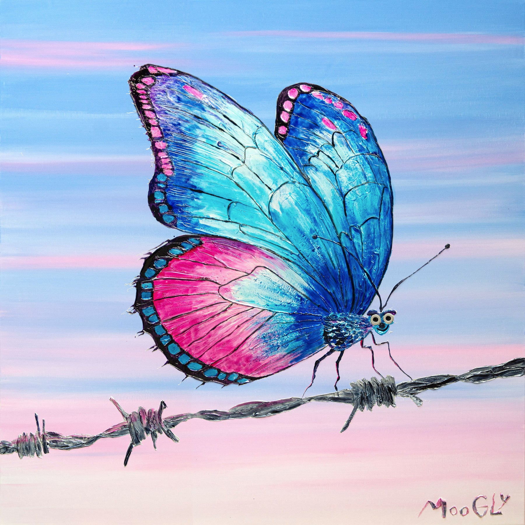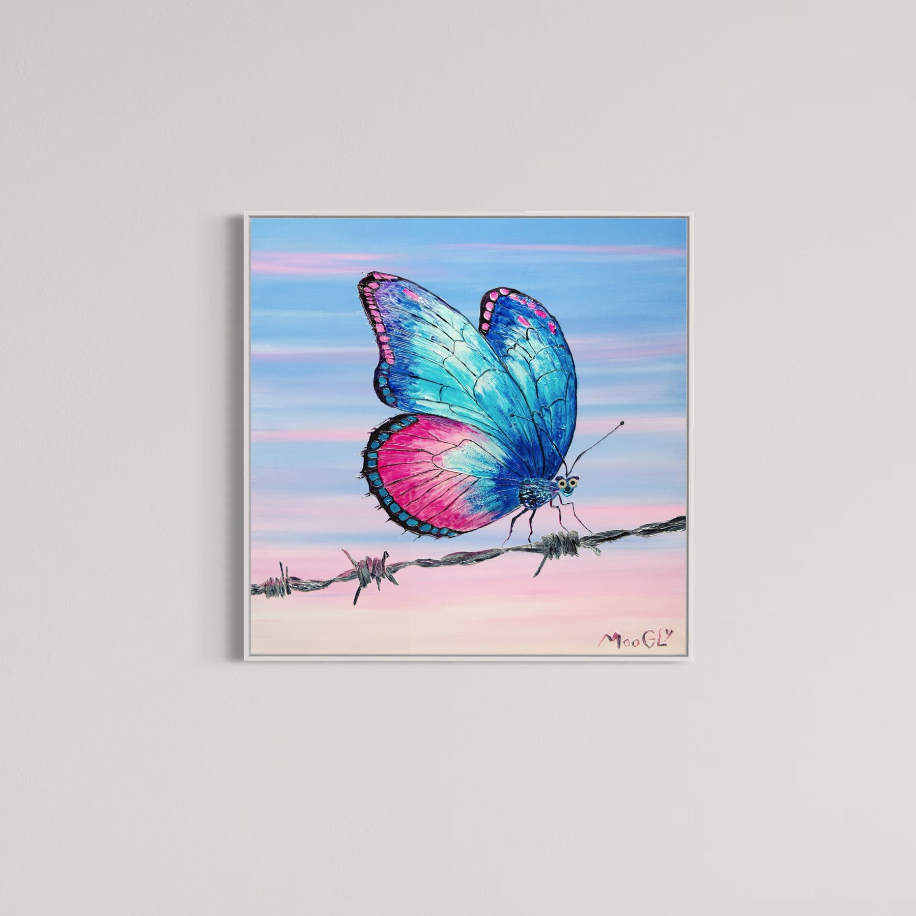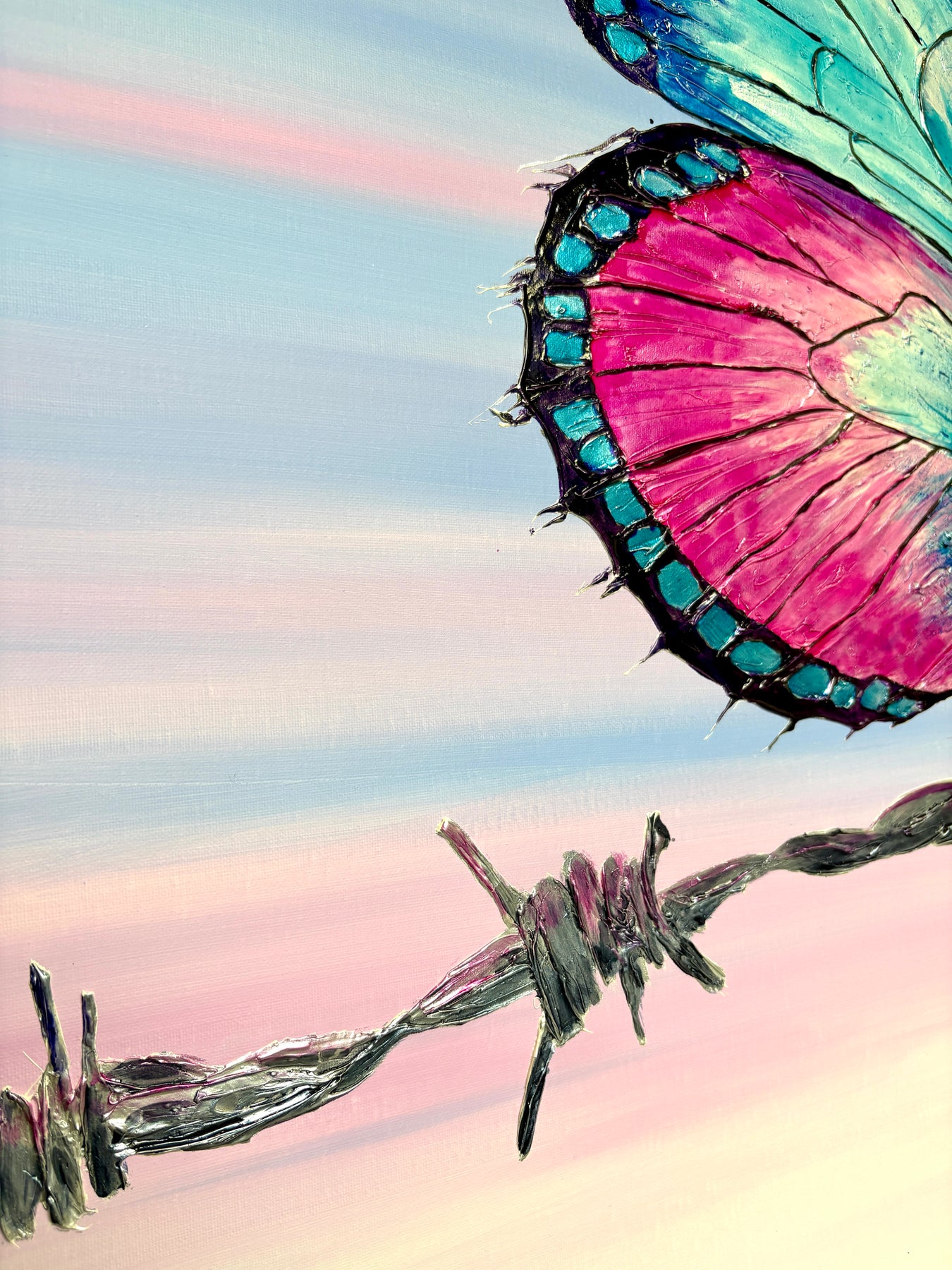 36" x 36" acrylic on canvas painting of a blue and pink butterfly resting on barbed wire over a pink and blue gradient background.
