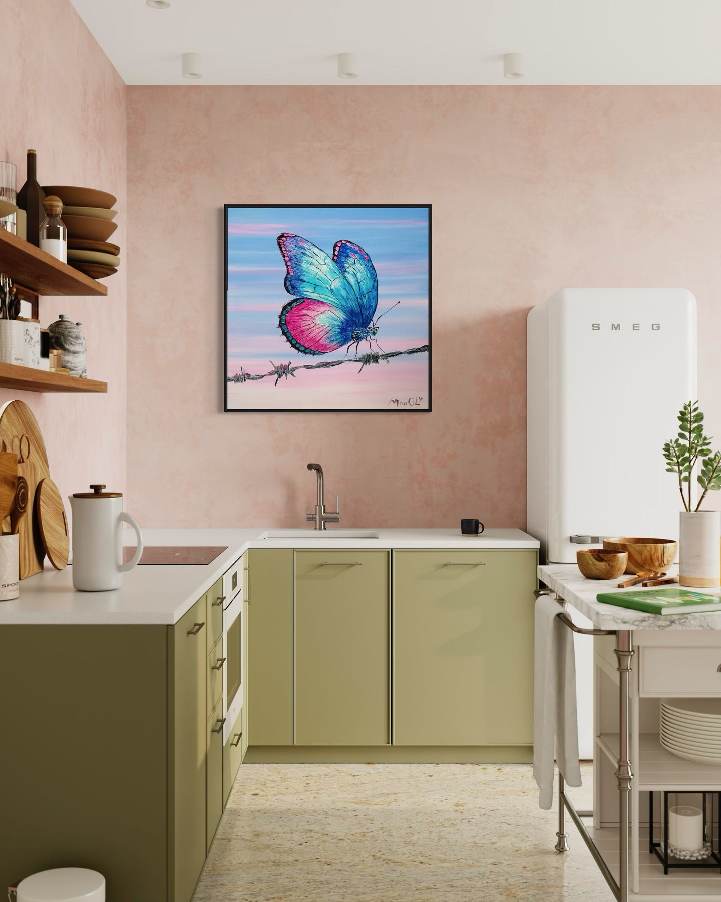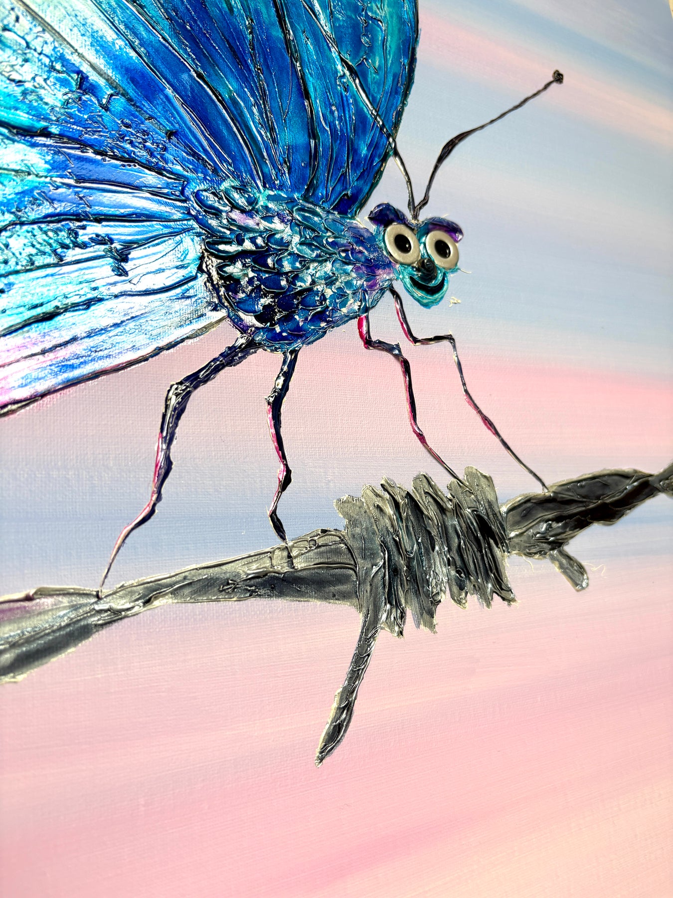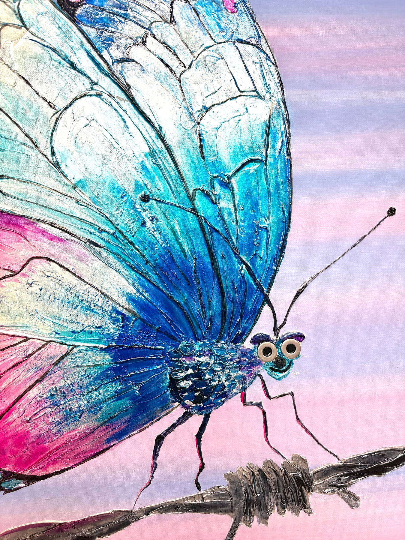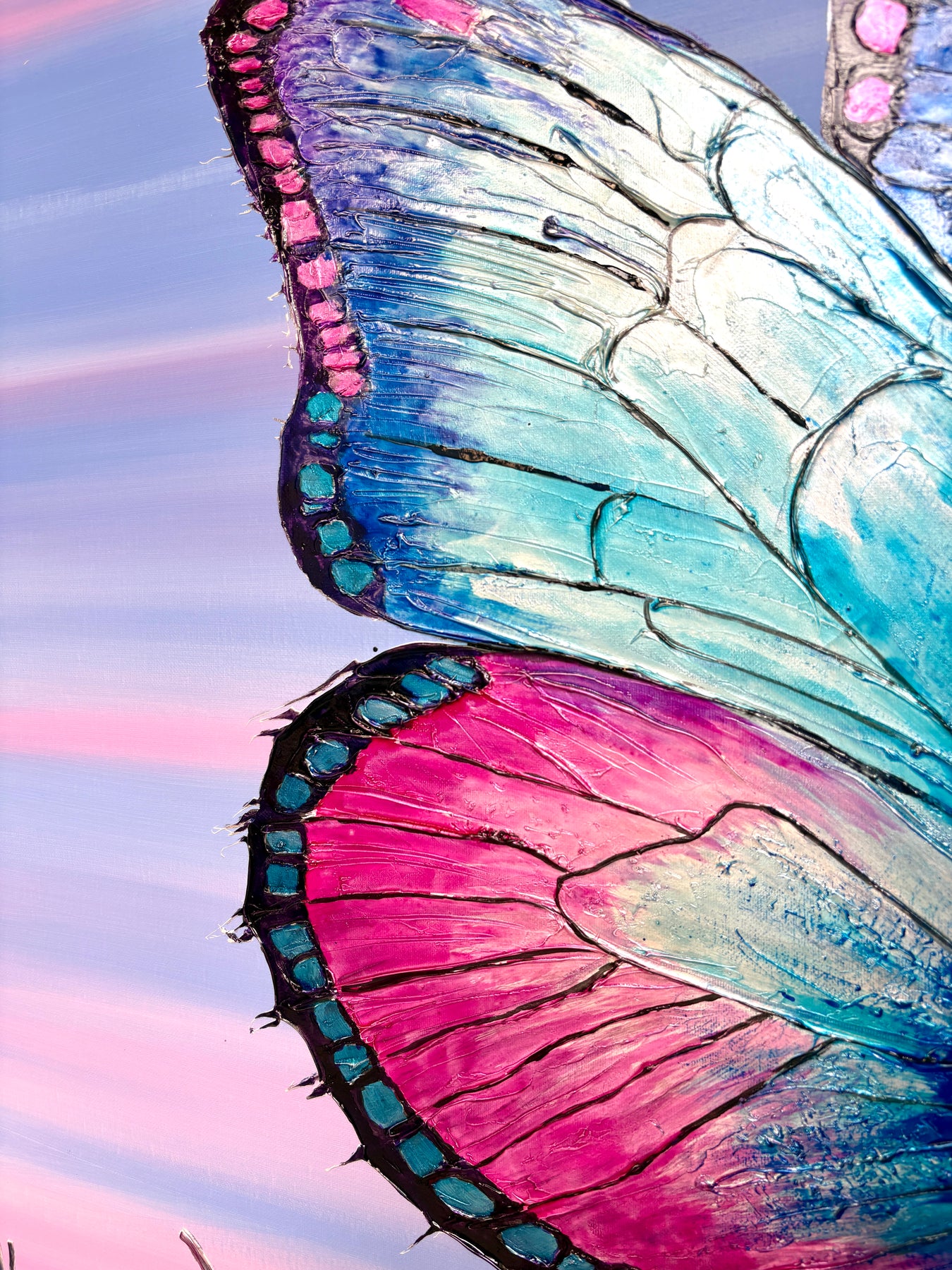 36" x 36" acrylic on canvas painting of a blue and pink butterfly resting on barbed wire over a pink and blue gradient background.