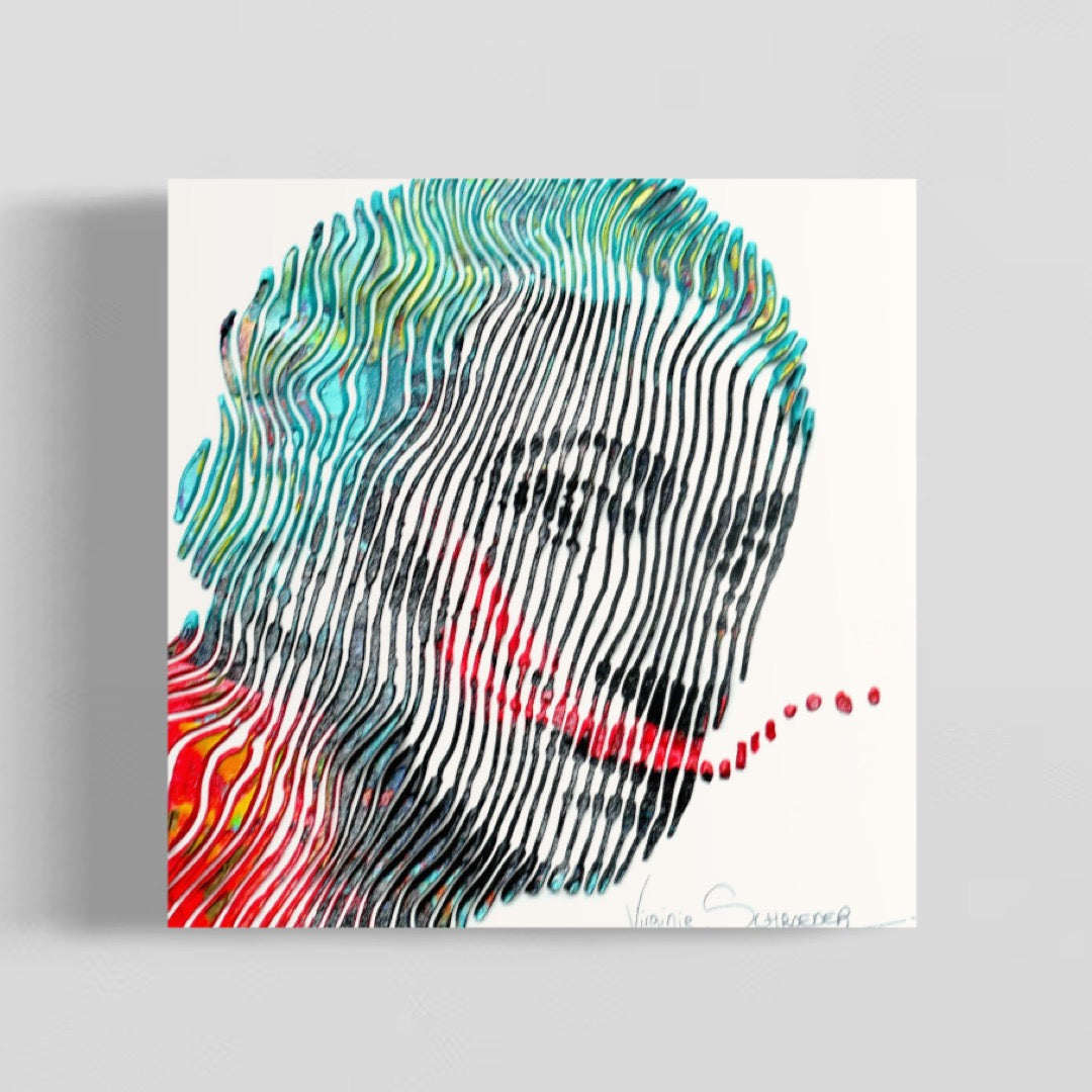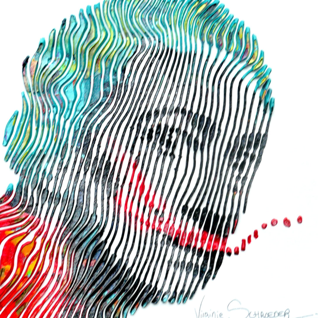 Virginie Schroeder's work is a mix of pop, street, and kinetic art that pays homage to contemporary icons. Her paints are applied with a knife, brush, and syringe that are delicately blended to bring out colorful details full of depth. Her work is conceived line by line; painted, and sculpted with patience and a lot of passion. This series is inspired by the kinetic art movement which allows us to experience the work from several angles.