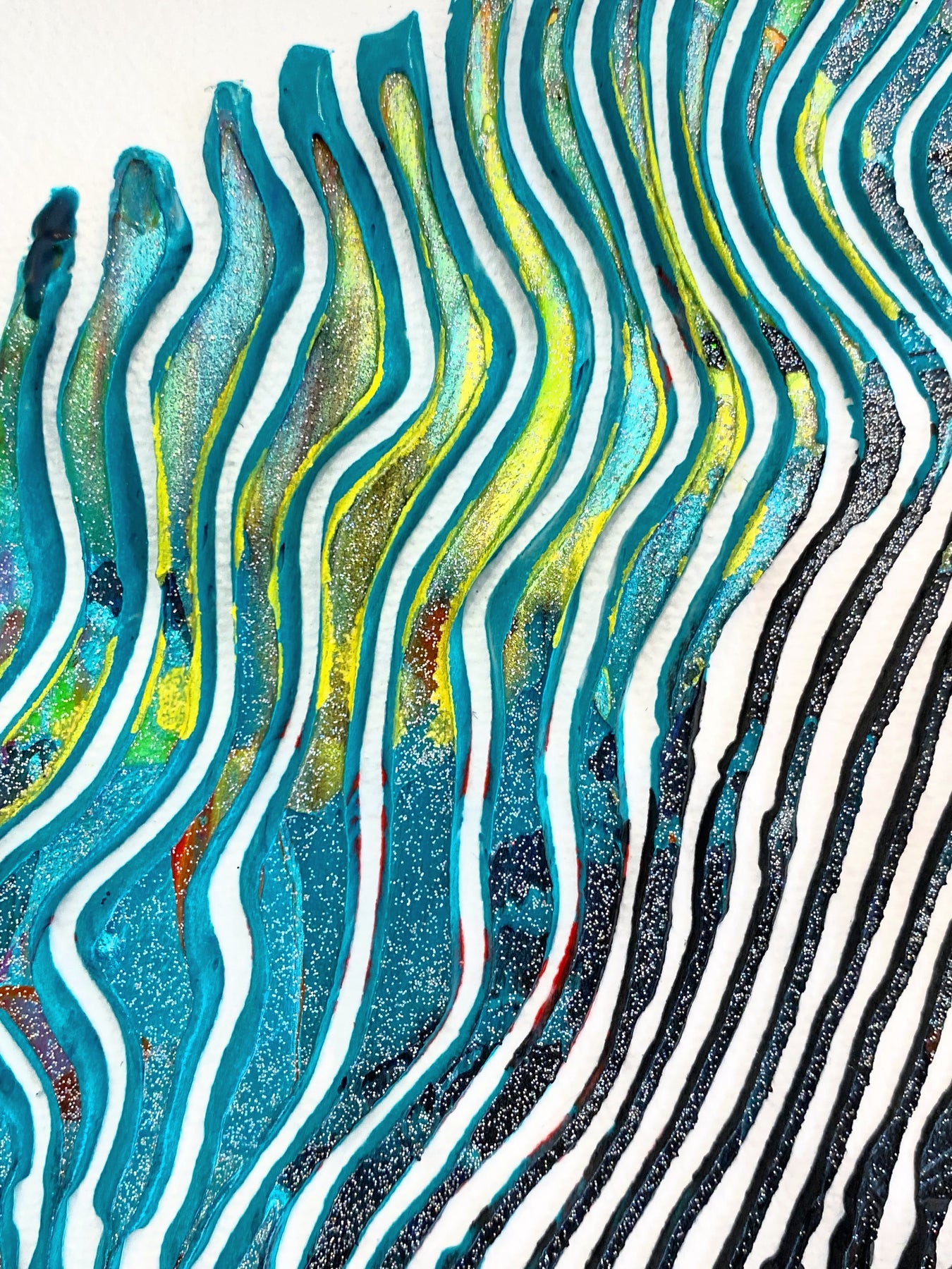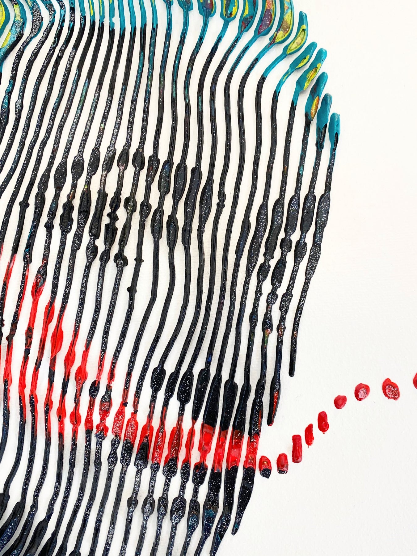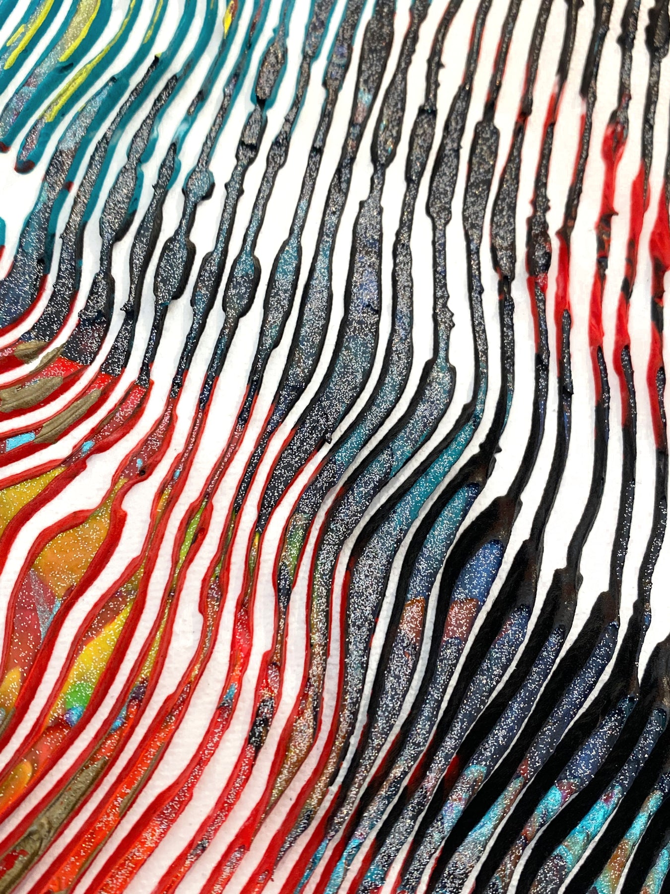 Detail of Virginie Schroeder "I Love Dali Forever", 10" x 10" white and multicolor abstract painting. Acrylic and oil on canvas.