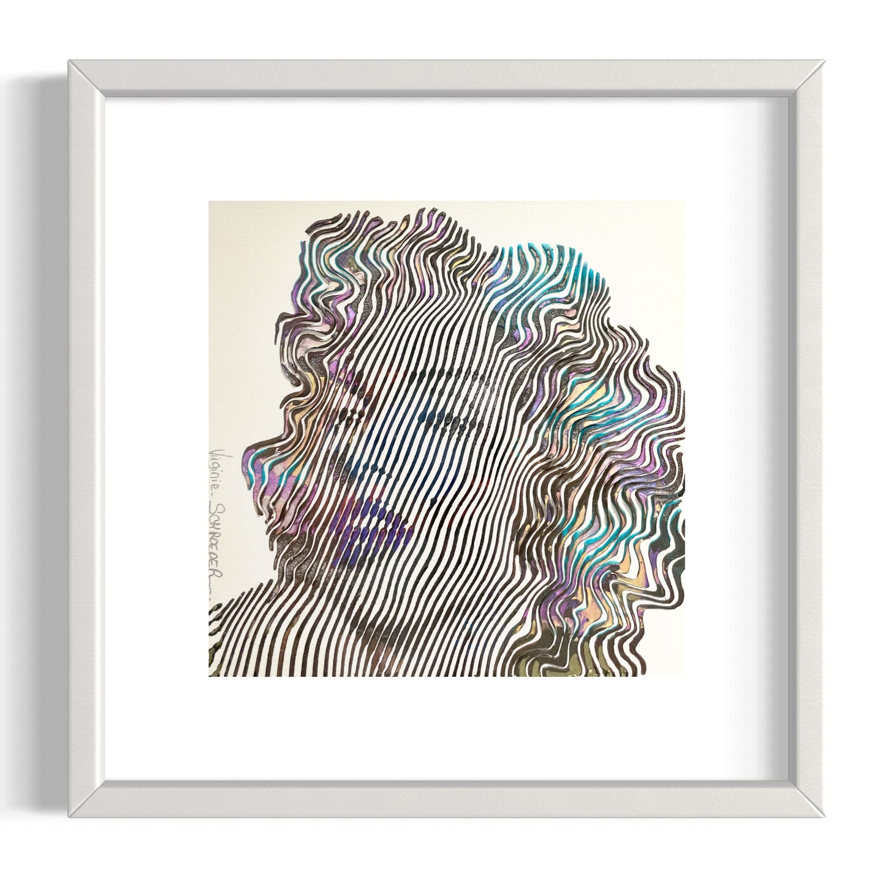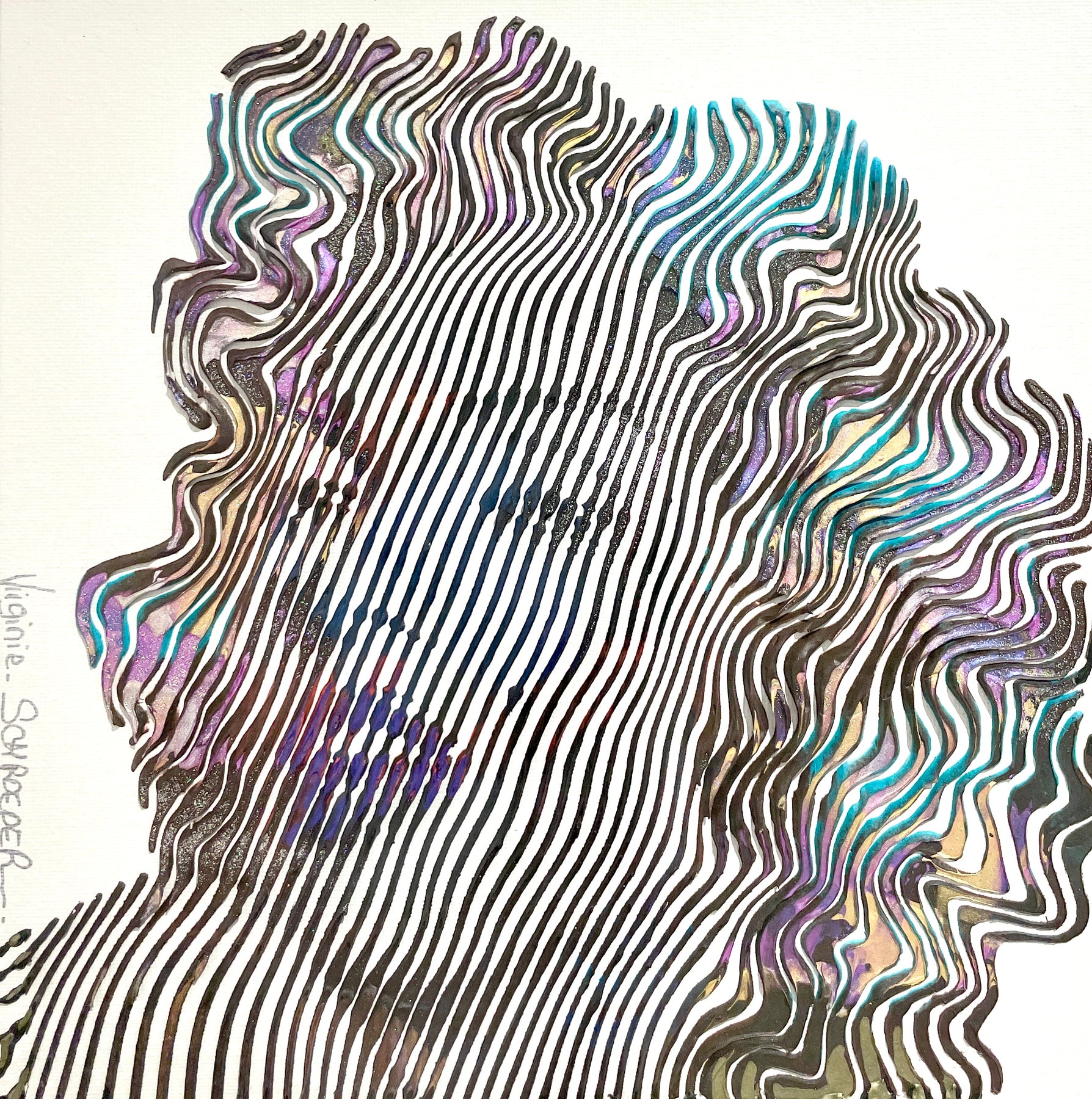 Virginie Schroeder's work is a mix of pop, street, and kinetic art that pays homage to contemporary icons. Her paints are applied with a knife, brush, and syringe that are delicately blended to bring out colorful details full of depth. Her work is conceived line by line; painted, and sculpted with patience and a lot of passion. This series is inspired by the kinetic art movement which allows us to experience the work from several angles.