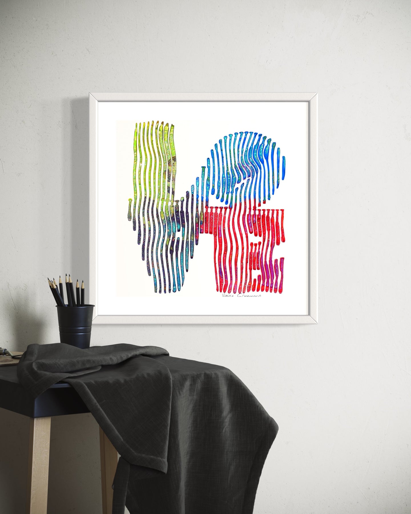 14"x14" acrylic and oil paint on canvas board image of the word LOVE.