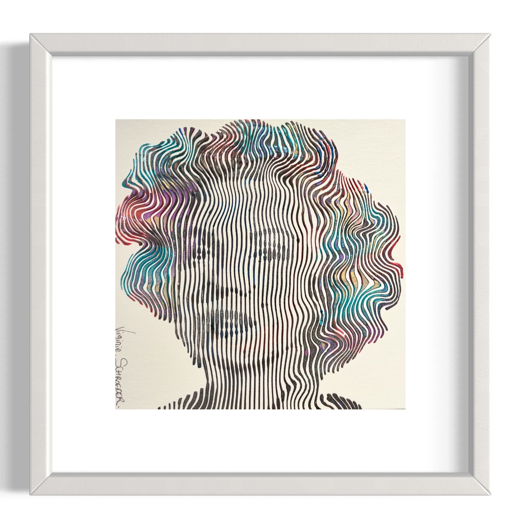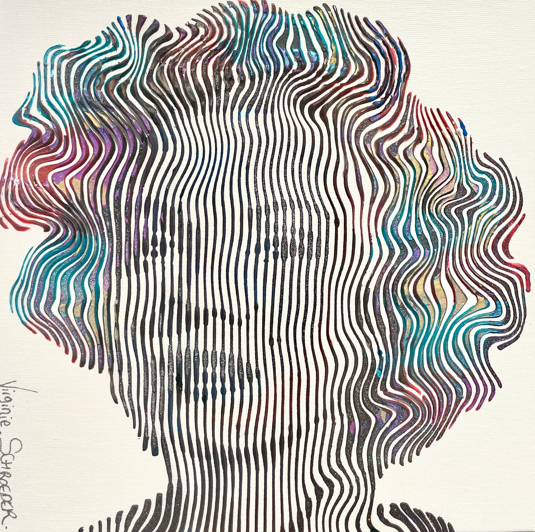 Virginie Schroeder's work is a mix of pop, street, and kinetic art that pays homage to contemporary icons. Her paints are applied with a knife, brush, and syringe that are delicately blended to bring out colorful details full of depth. Her work is conceived line by line; painted, and sculpted with patience and a lot of passion. This series is inspired by the kinetic art movement which allows us to experience the work from several angles.