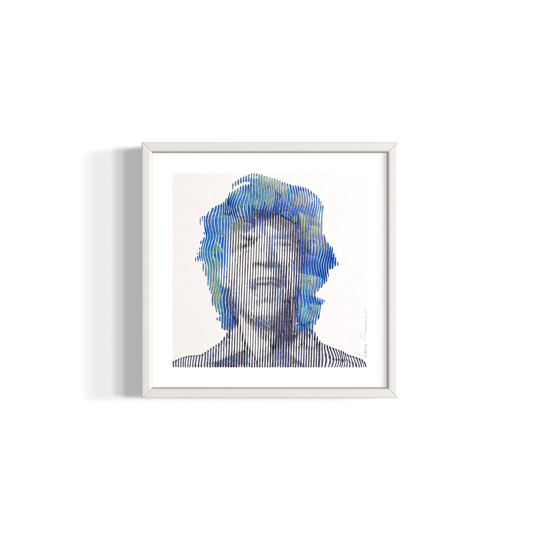 Mick Jagger front portrait figurative painting vertical lines in blue and green