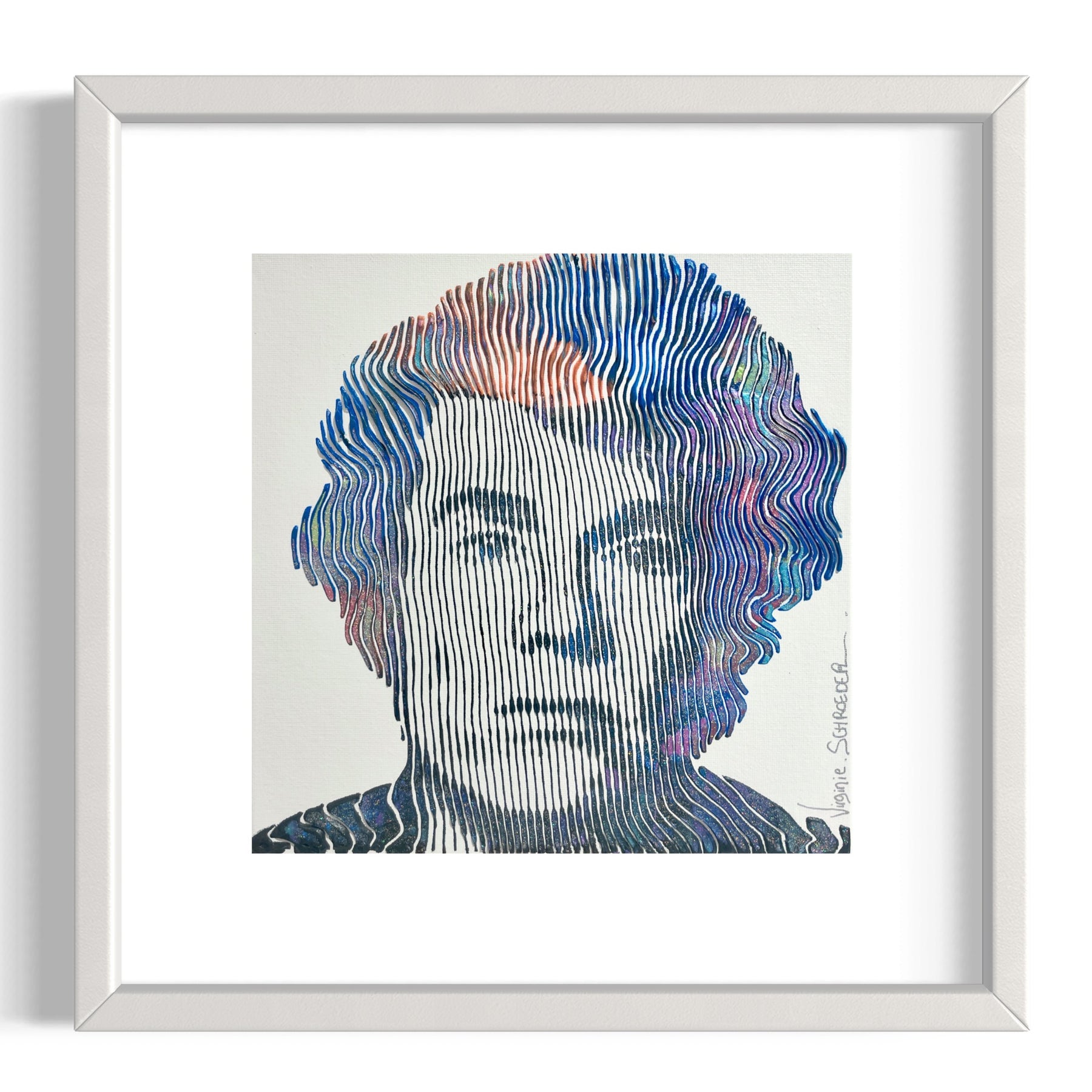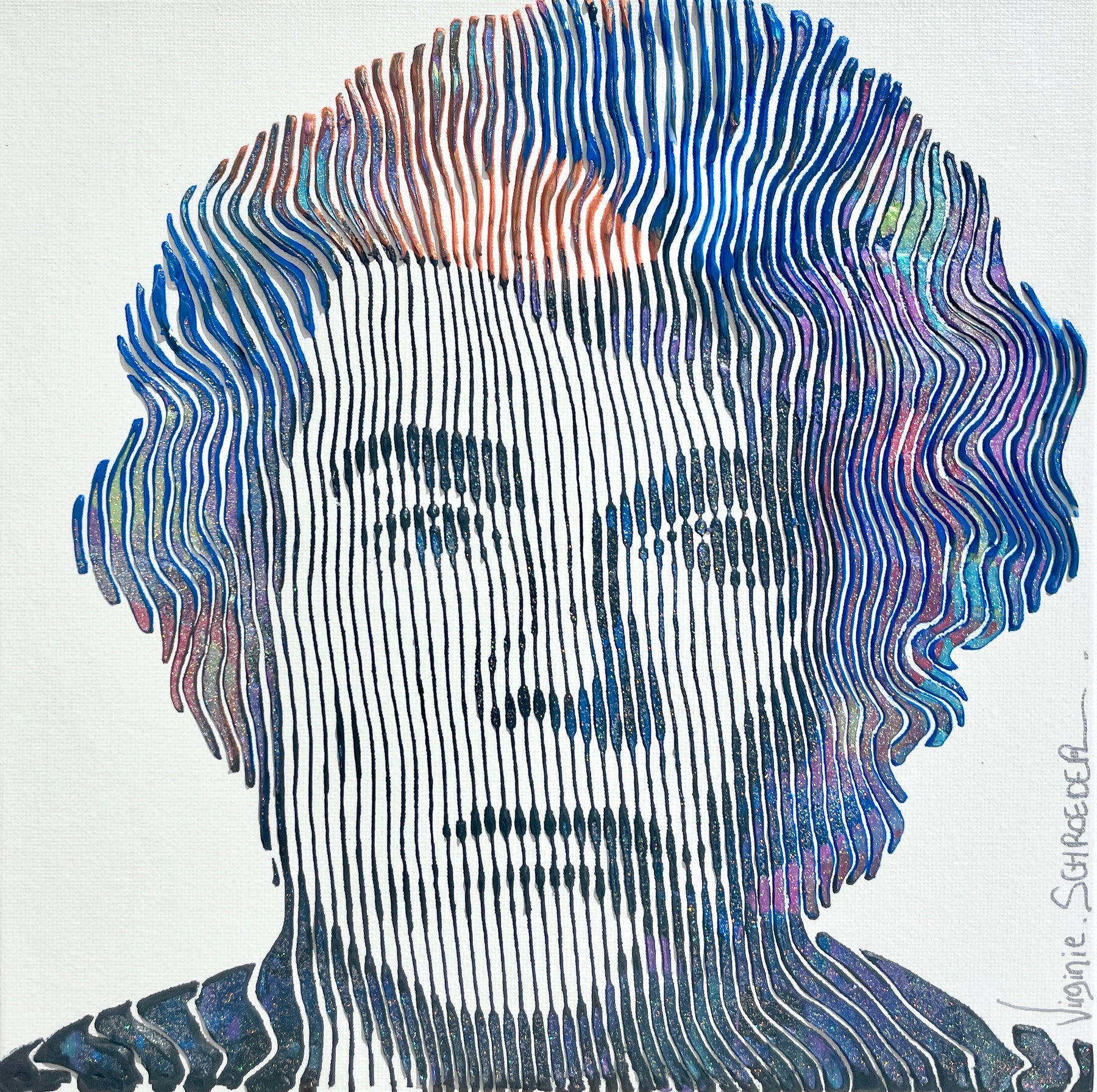 Virginie Schroeder's work is a mix of pop, street, and kinetic art that pays homage to contemporary icons. Her paints are applied with a knife, brush, and syringe that are delicately blended to bring out colorful details full of depth. Her work is conceived line by line; painted, and sculpted with patience and a lot of passion. This series is inspired by the kinetic art movement which allows us to experience the work from several angles.