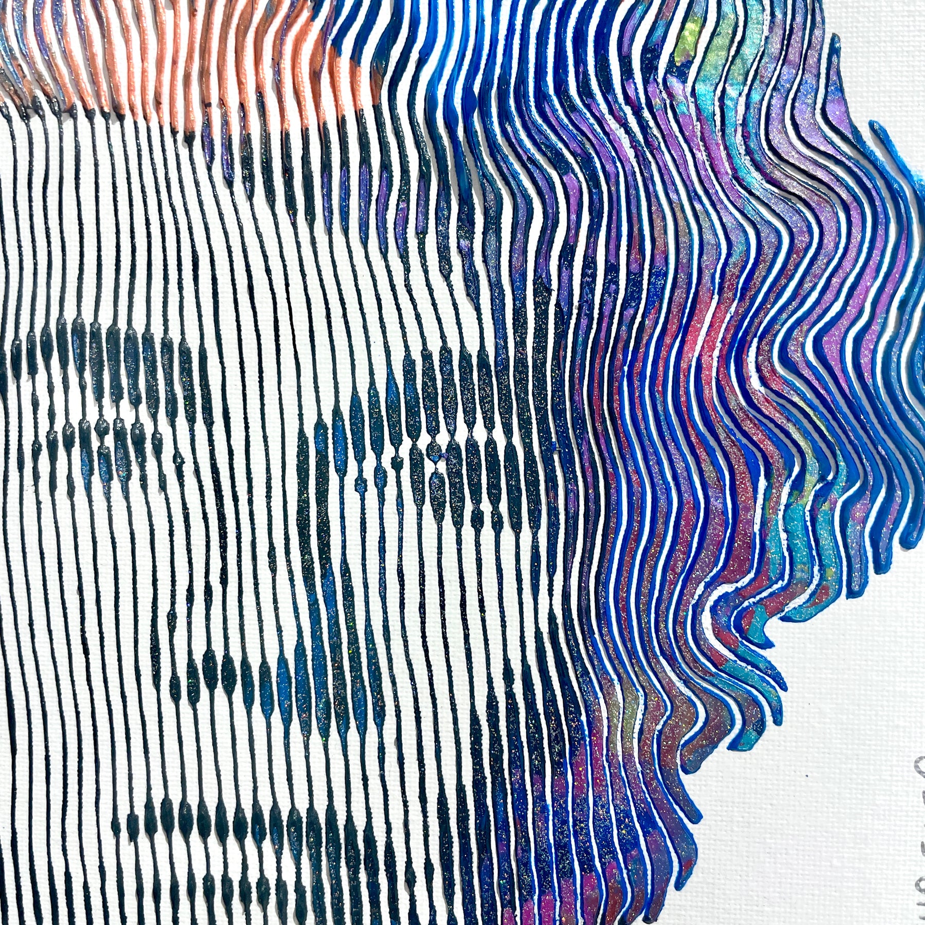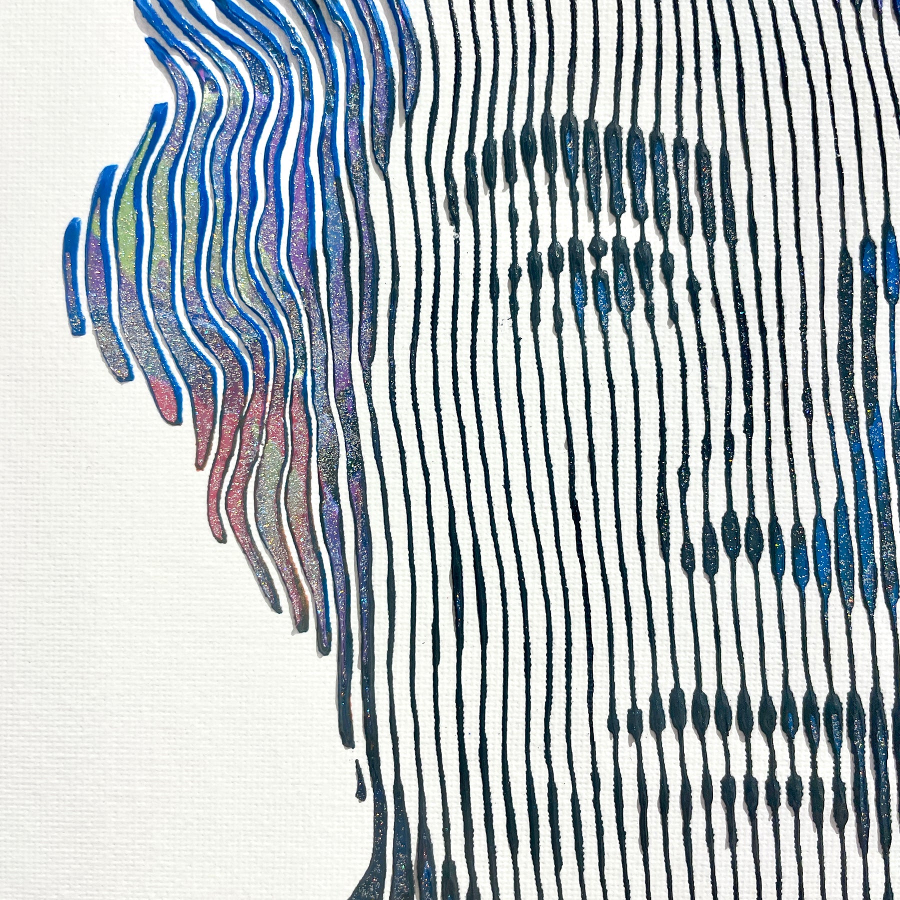 - Acrylic and oil on canvas panel applied line by line with a knife, brush, and syringe to create 3-dimensional works.