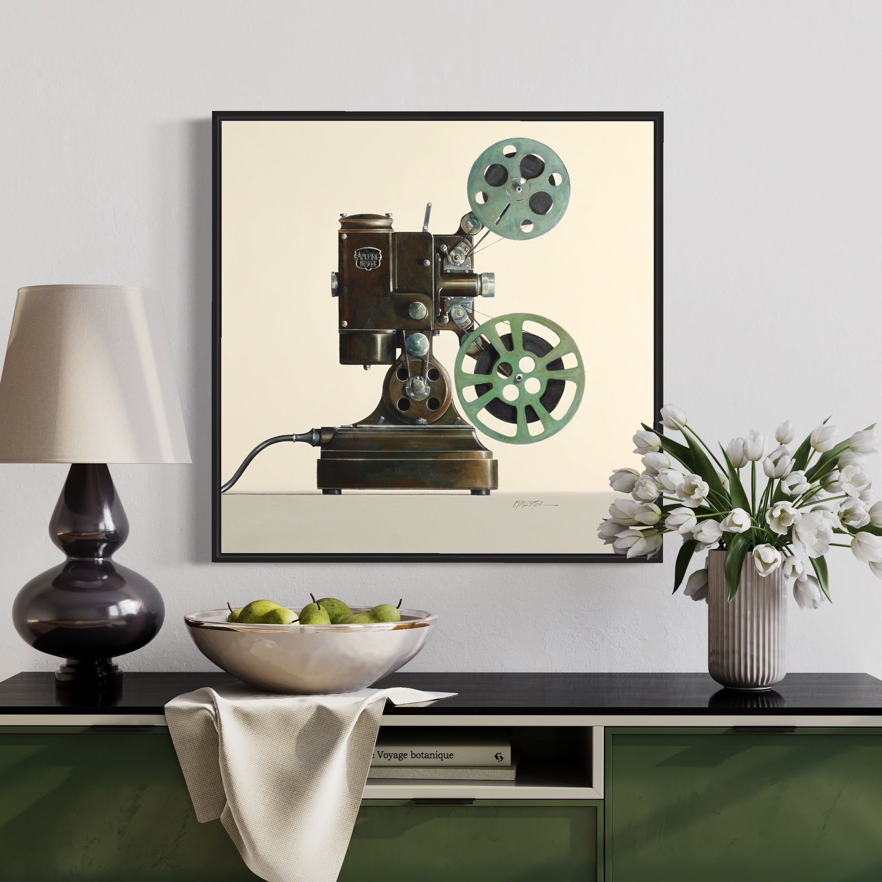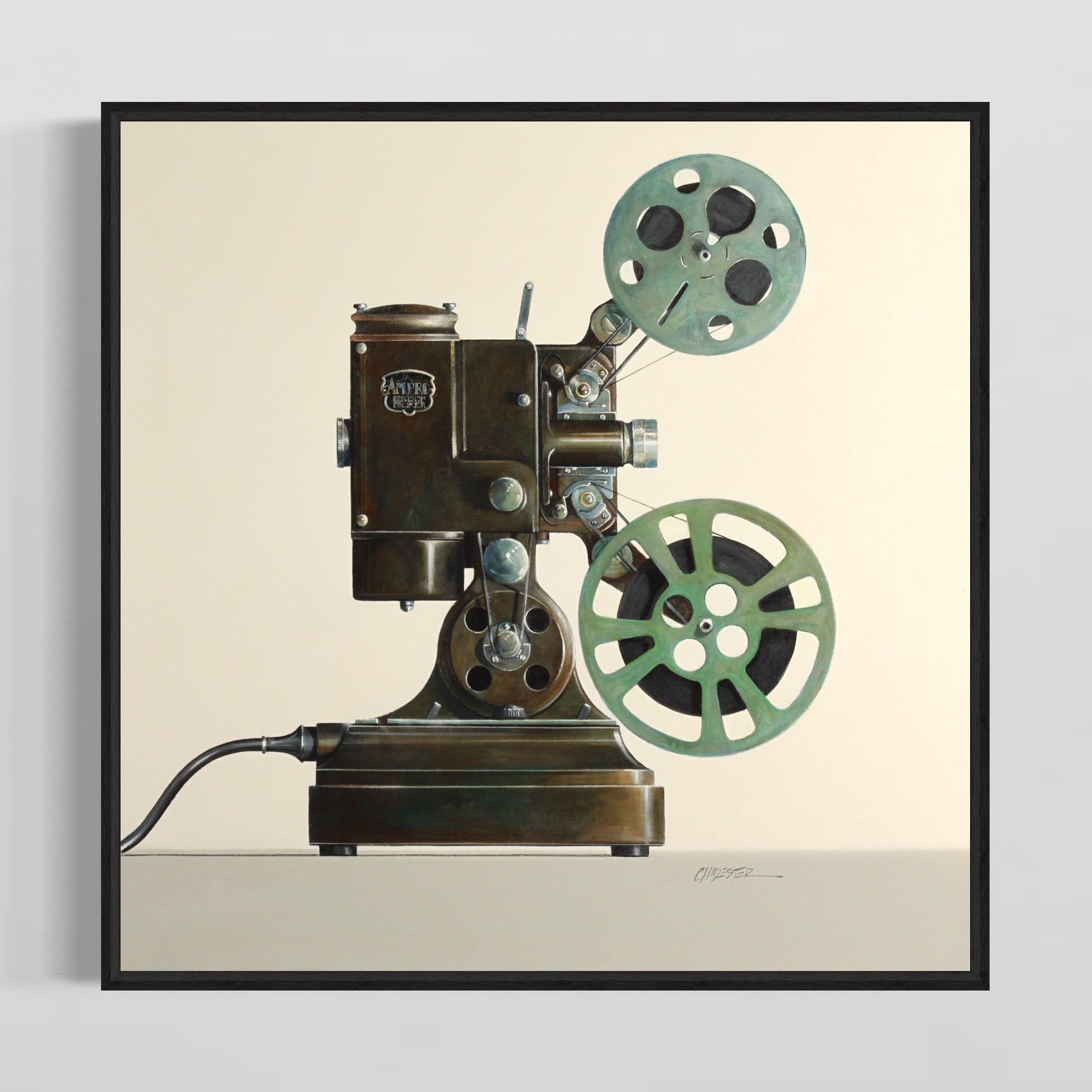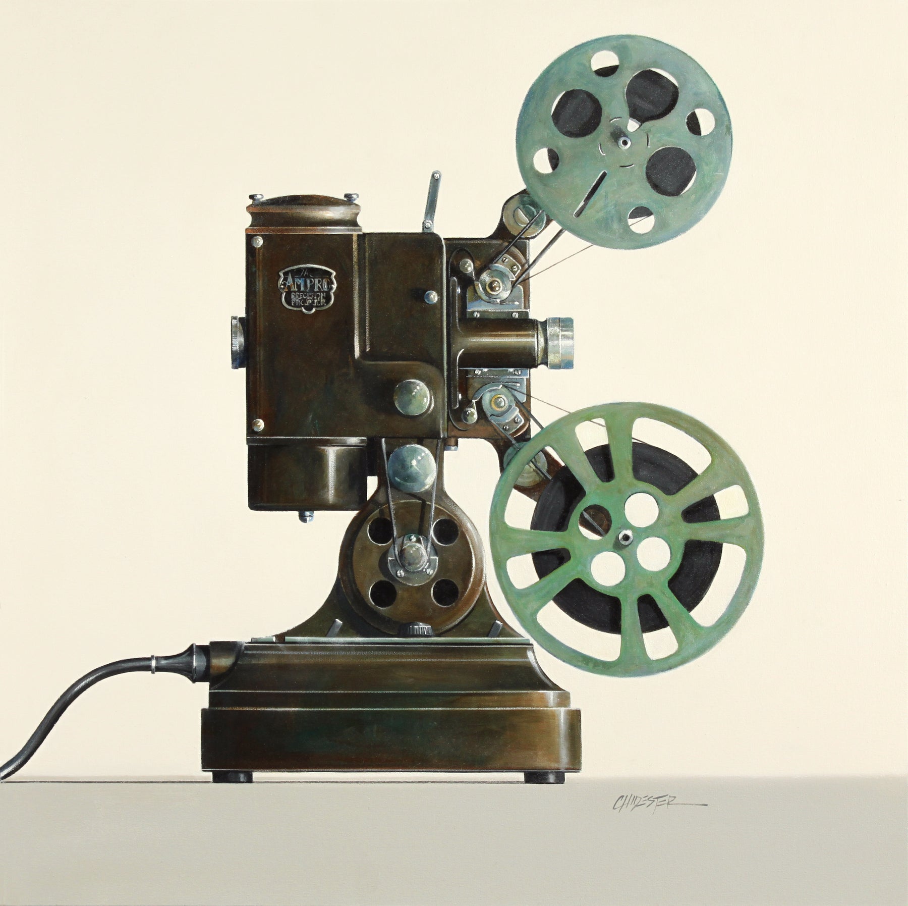 In her gorgeous photo-realistic still-lifes, American oil painter Wendy Chidester pays homage to lost relics of the past. Artifacts like vintage cameras and projectors, 40’s trunk luggage, bubblegum machines, childrens’ pedal cars and tricycles, and old telephones and typewriters are represented nostalgically in her work. She frames these objects as icons, memorializing the color and ingenuity of the past.