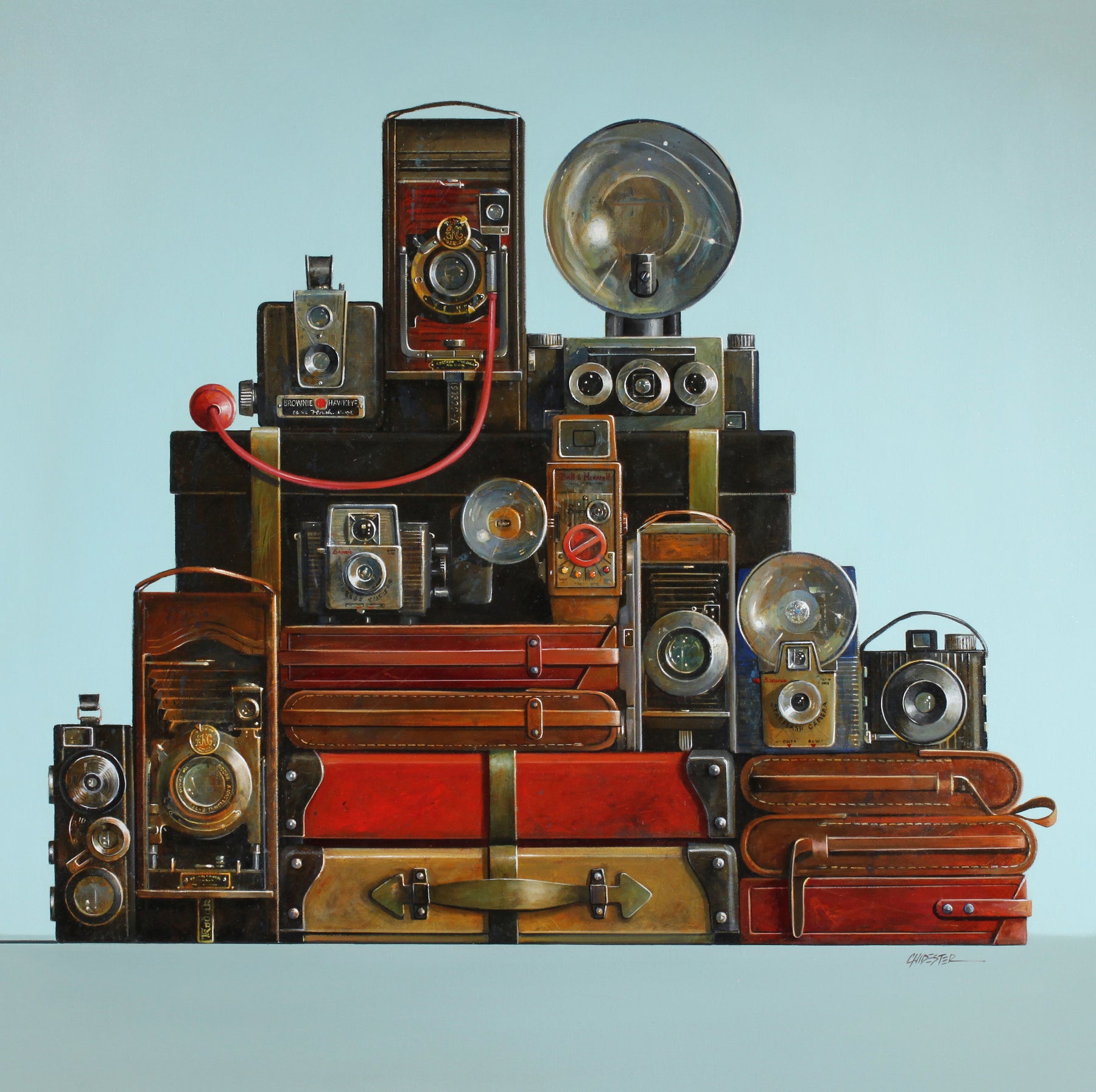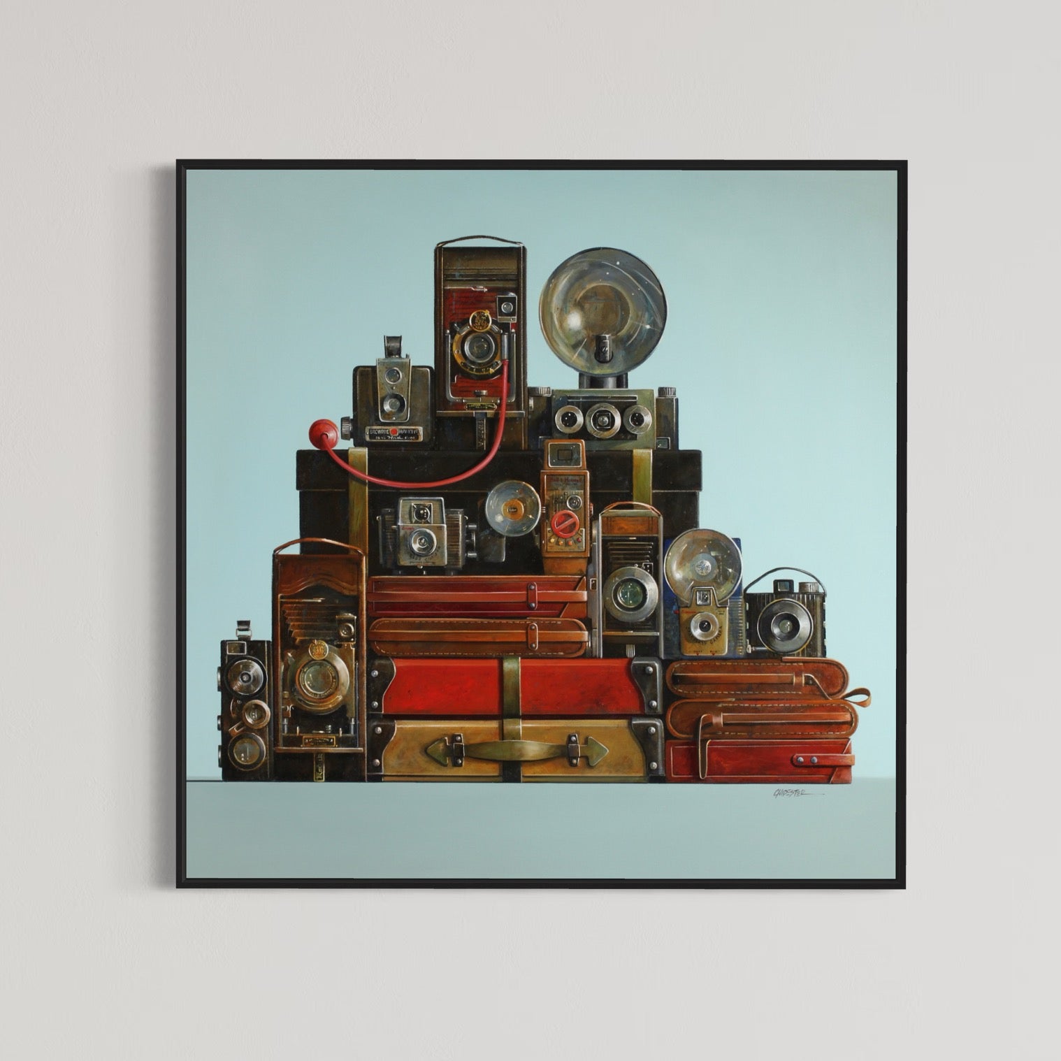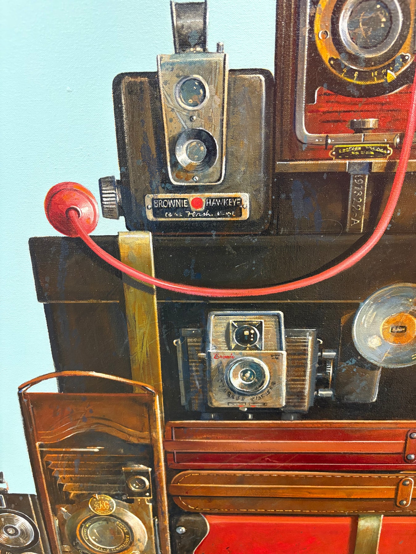 Realistic painting of a collection of vintage cameras and suitcases. 40"X40" oil on canvas. Minimalist light blue background.