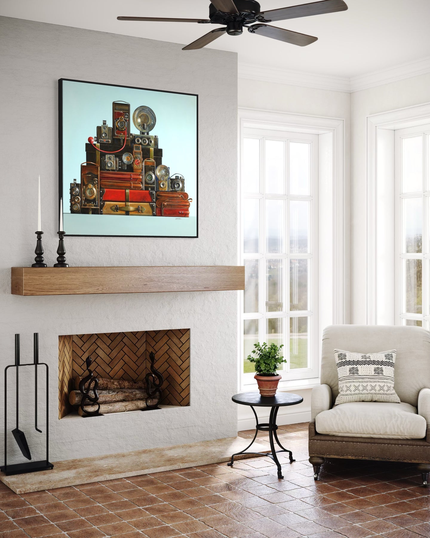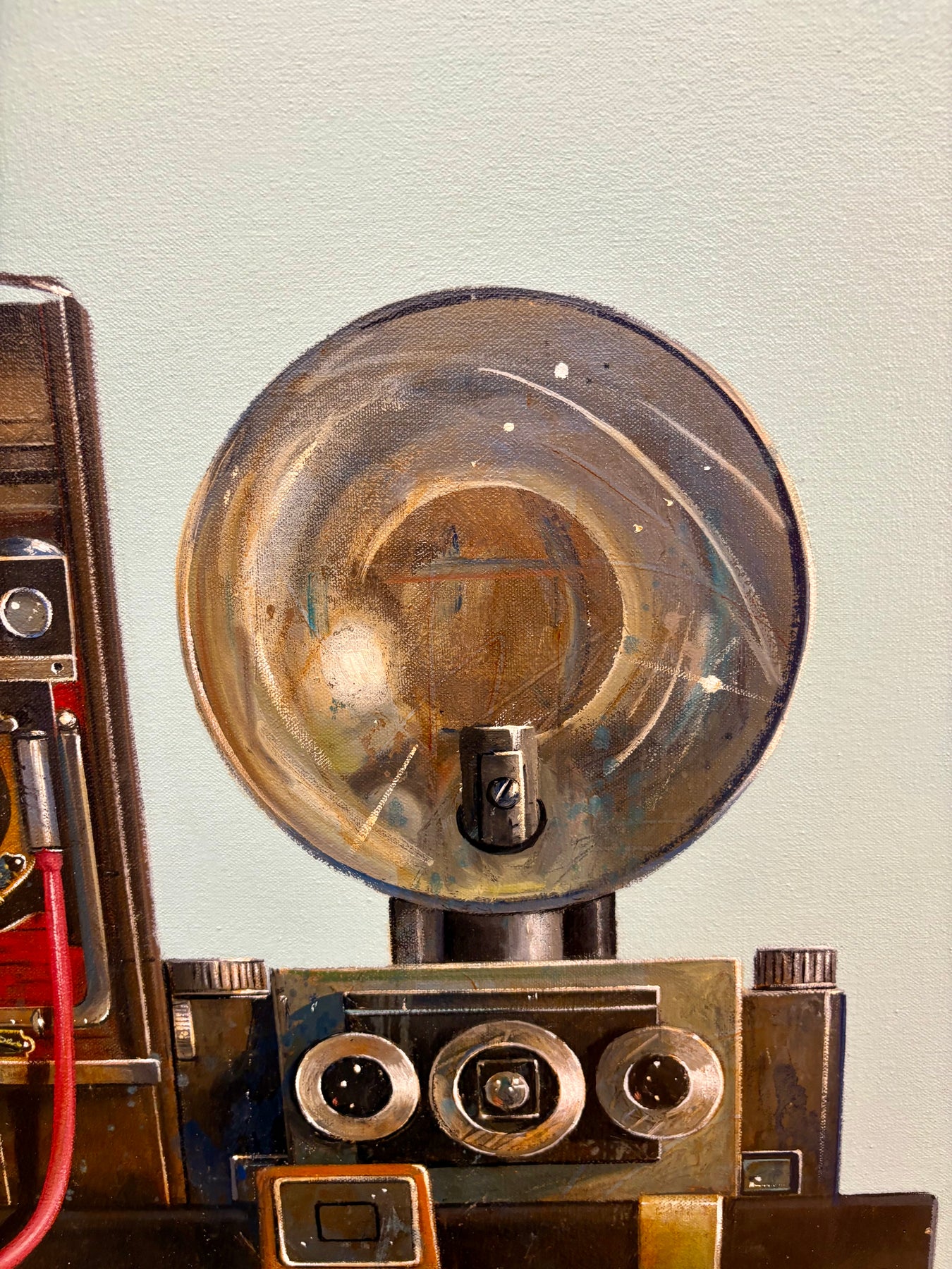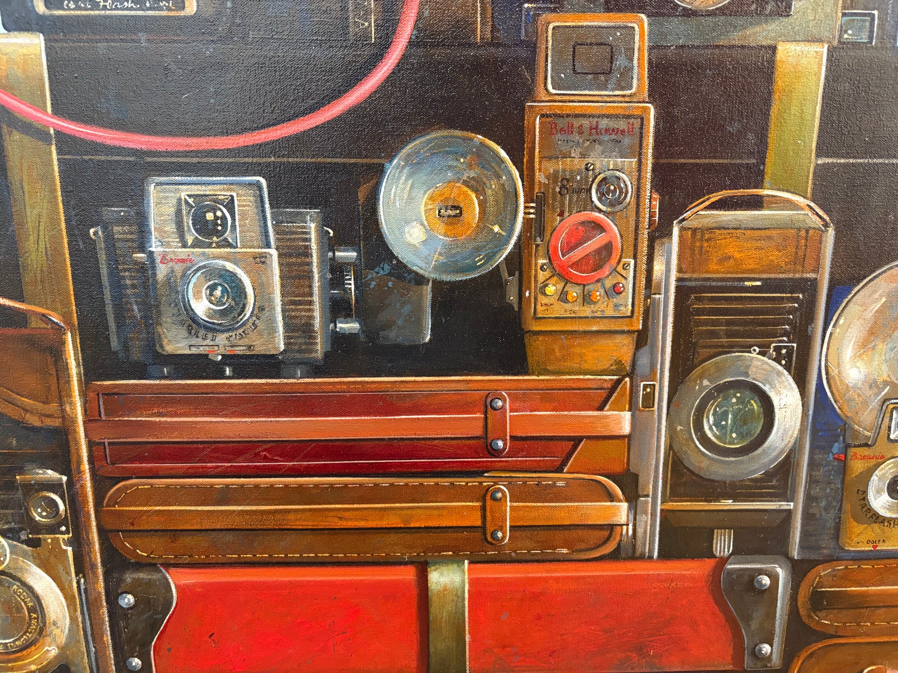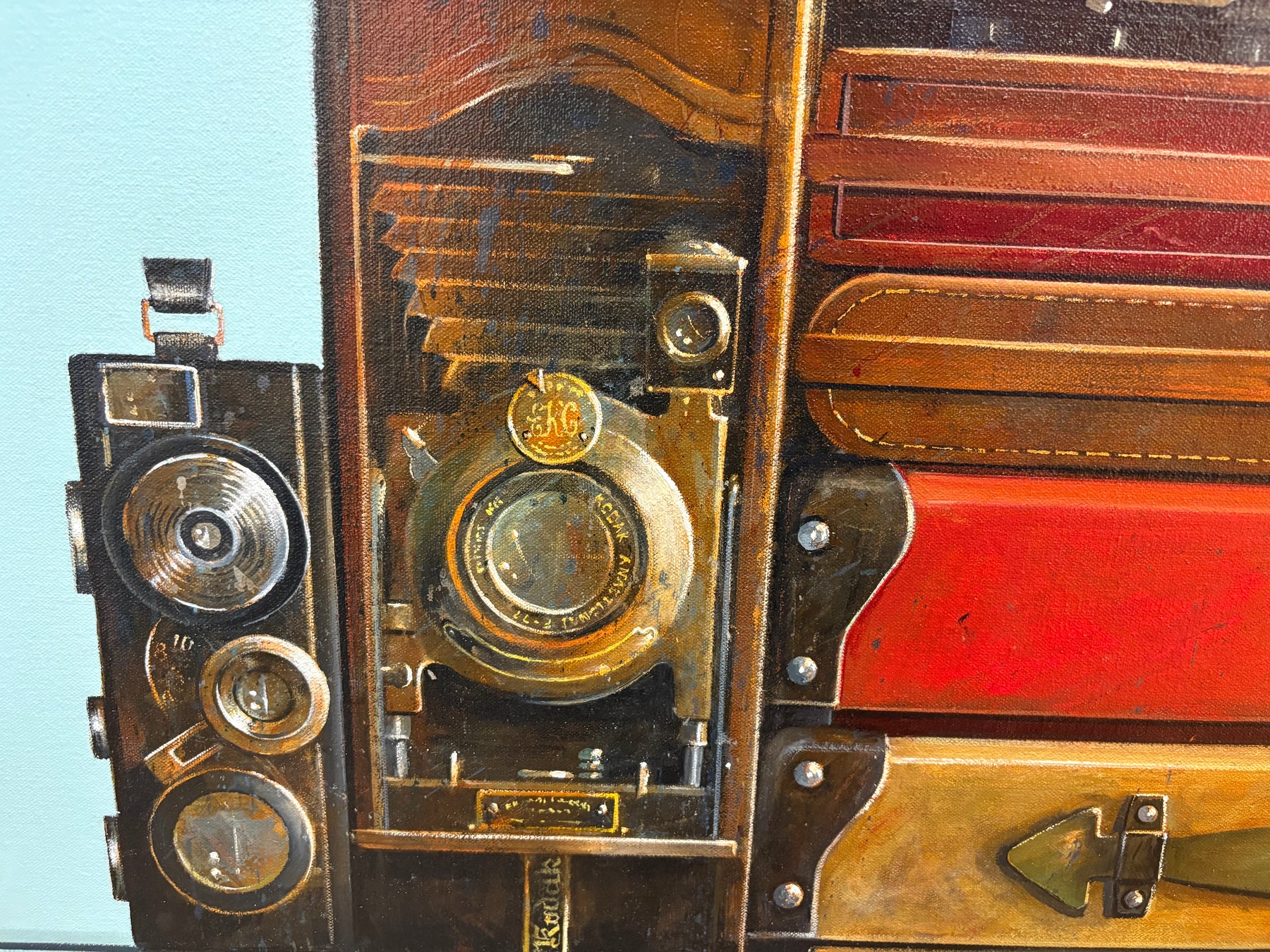 Realistic painting of a collection of vintage cameras and suitcases. 40"X40" oil on canvas. Minimalist light blue background.
