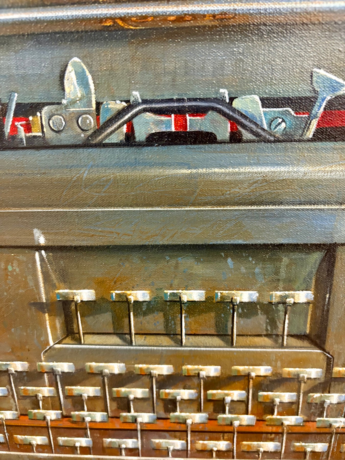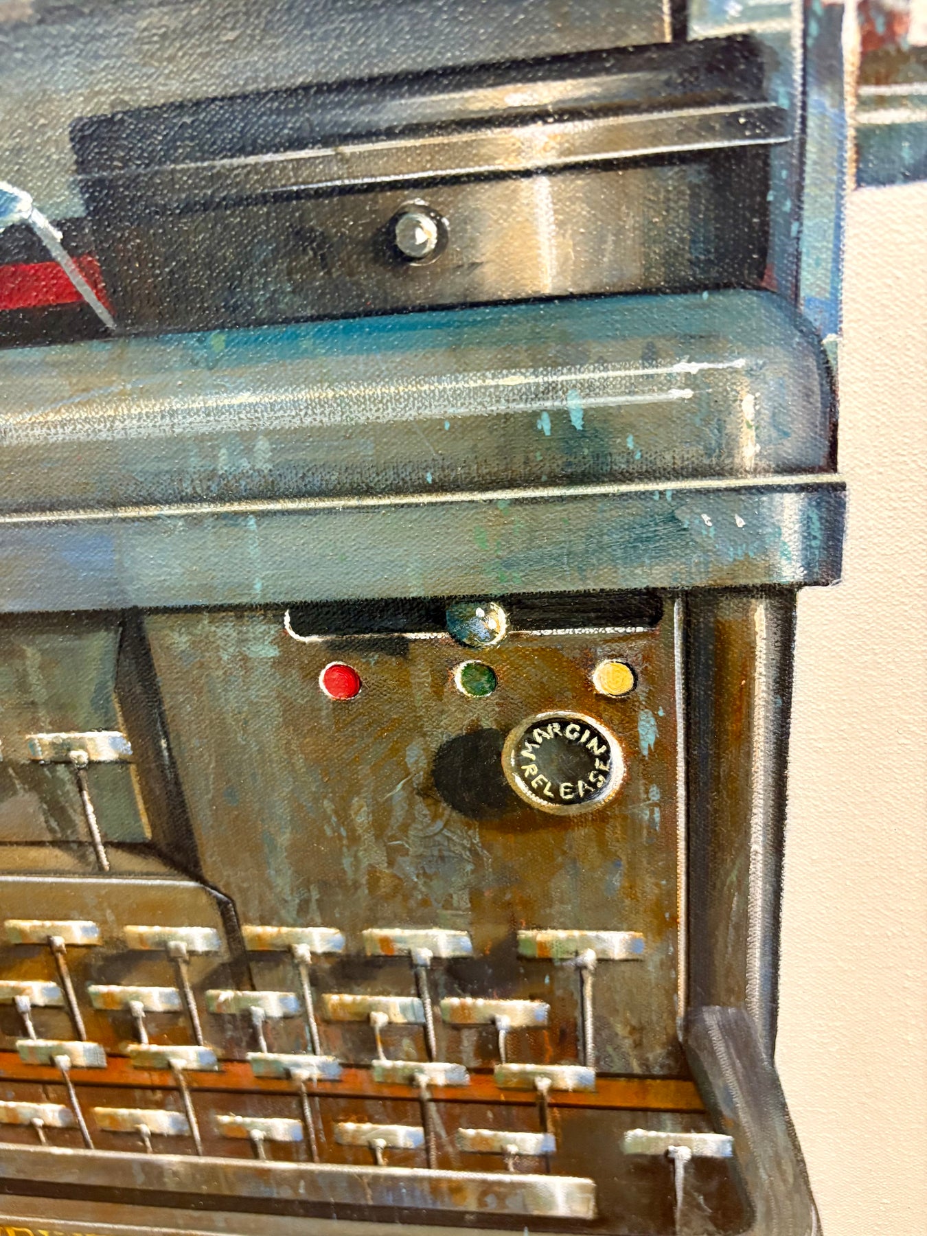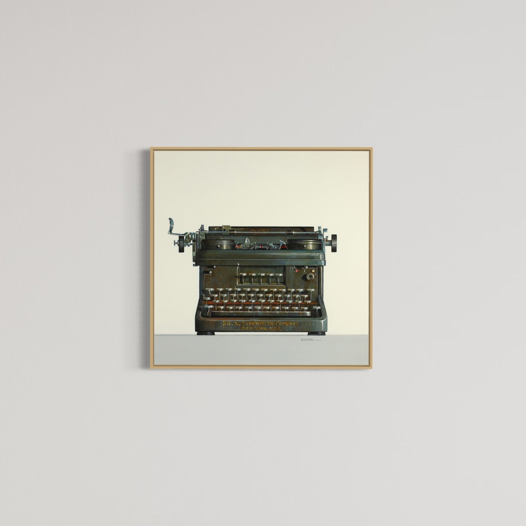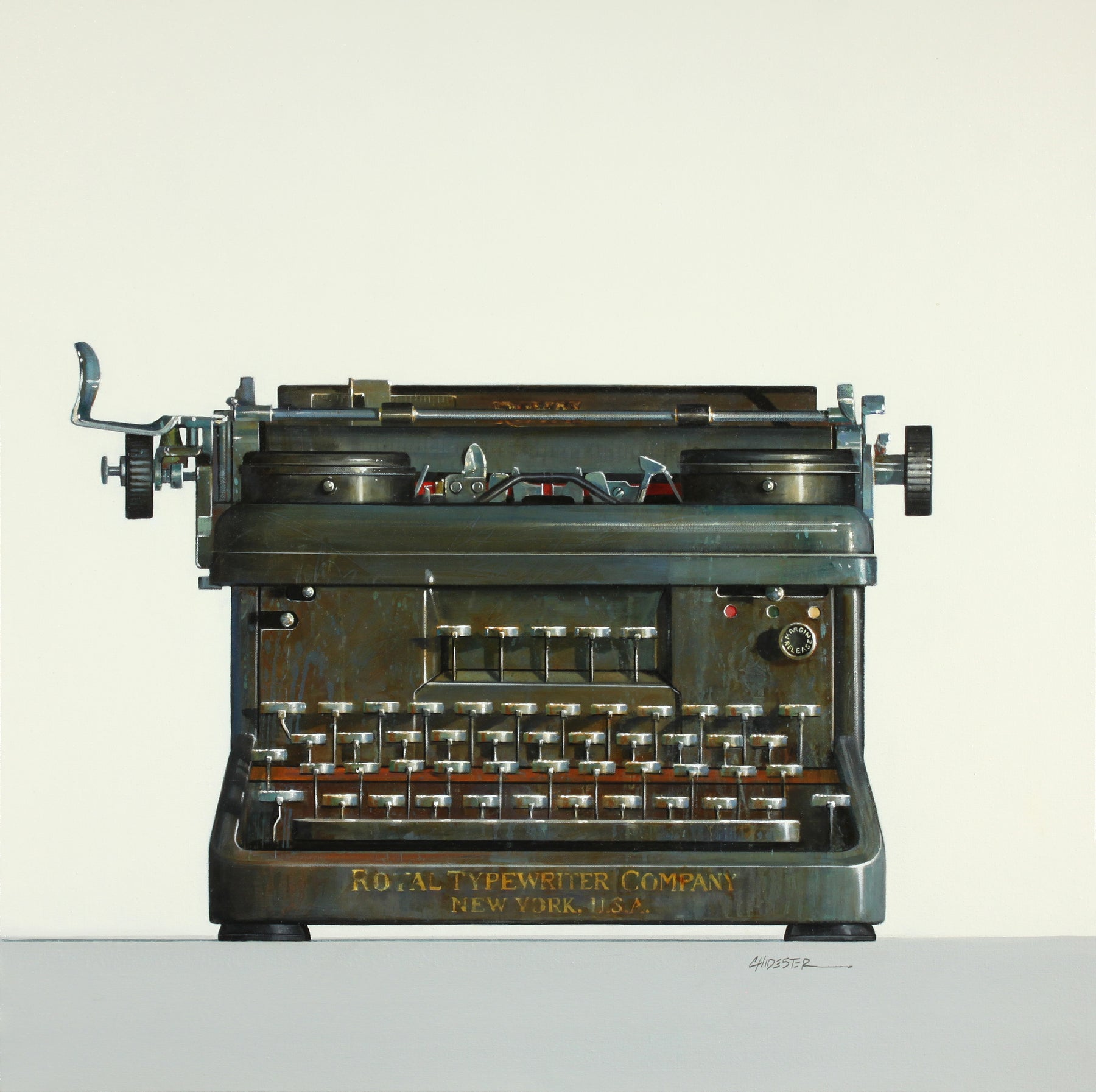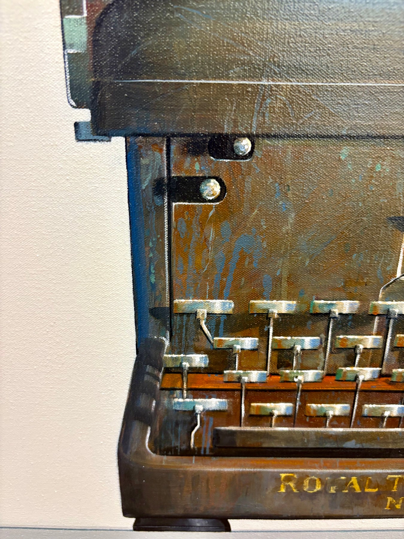Realistic painting of a vintage Royal  typewriter. 30"x30" oil on canvas. Minimalist off white and grey background.