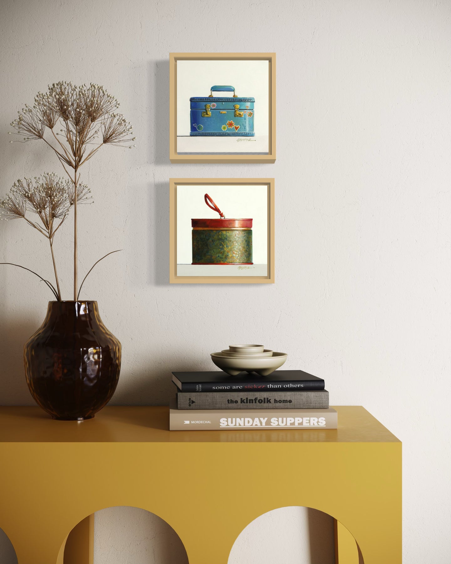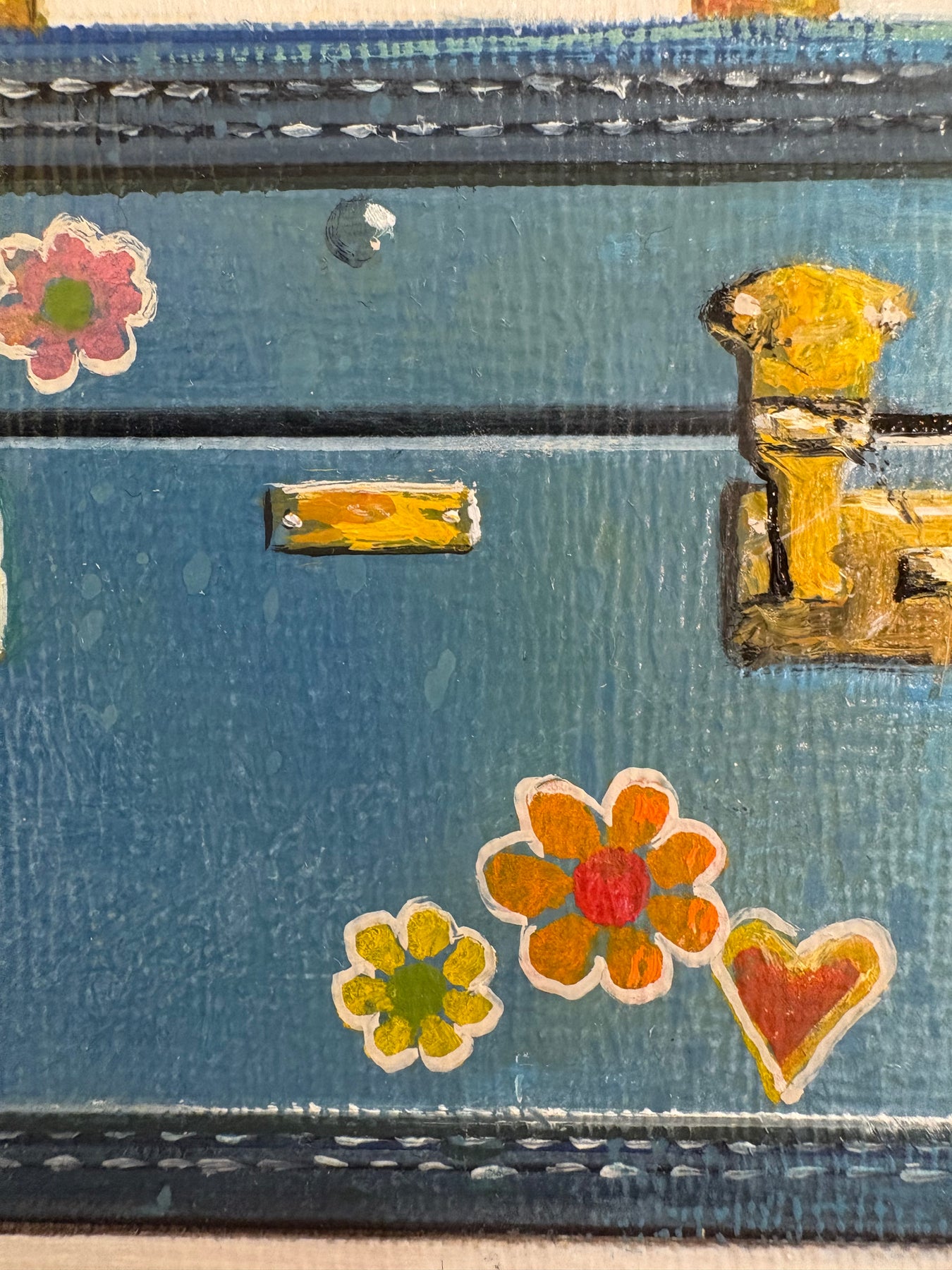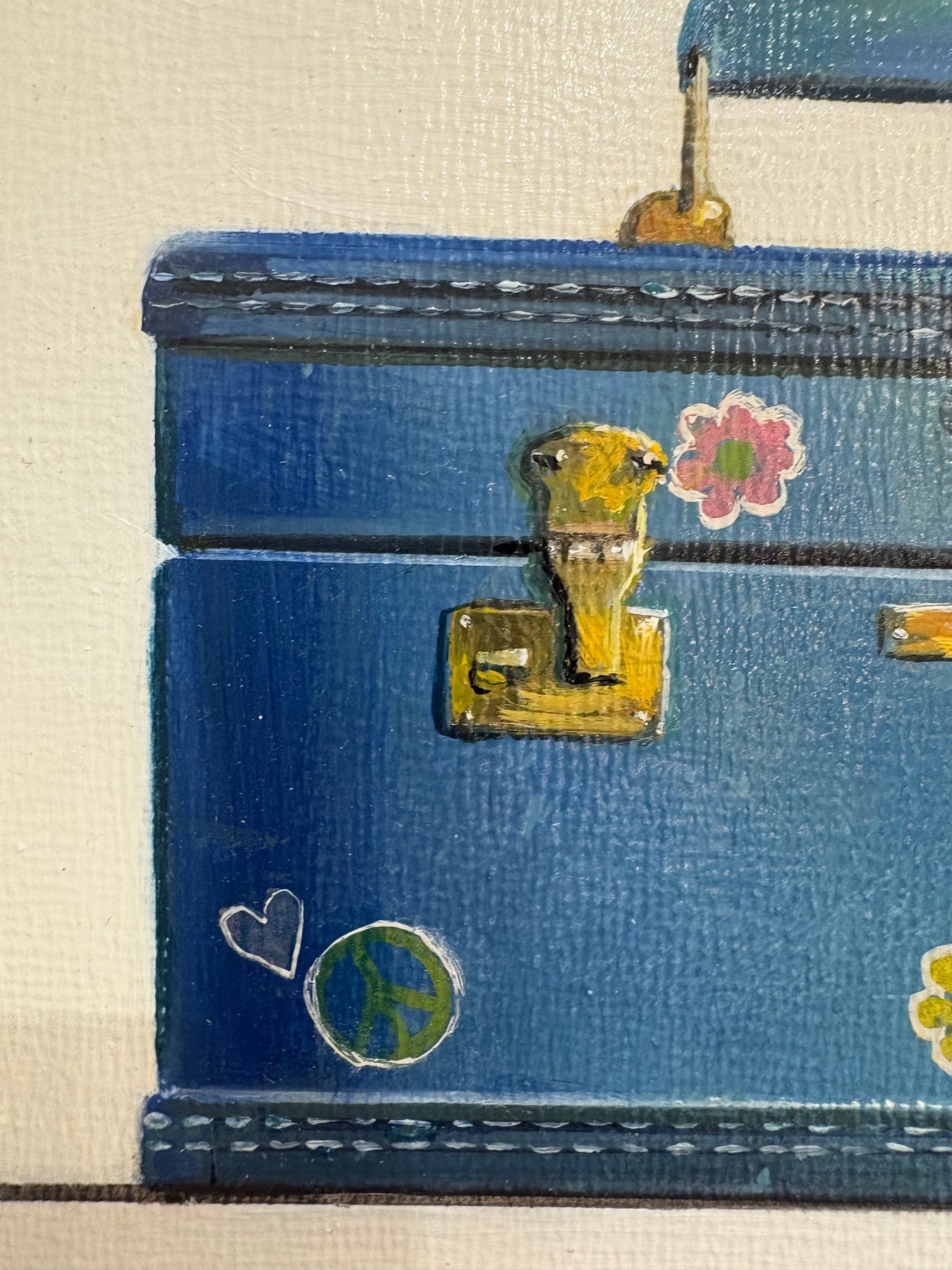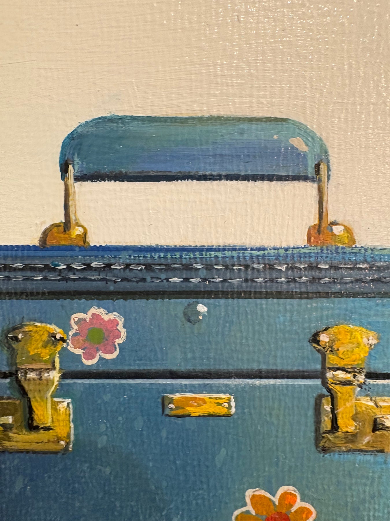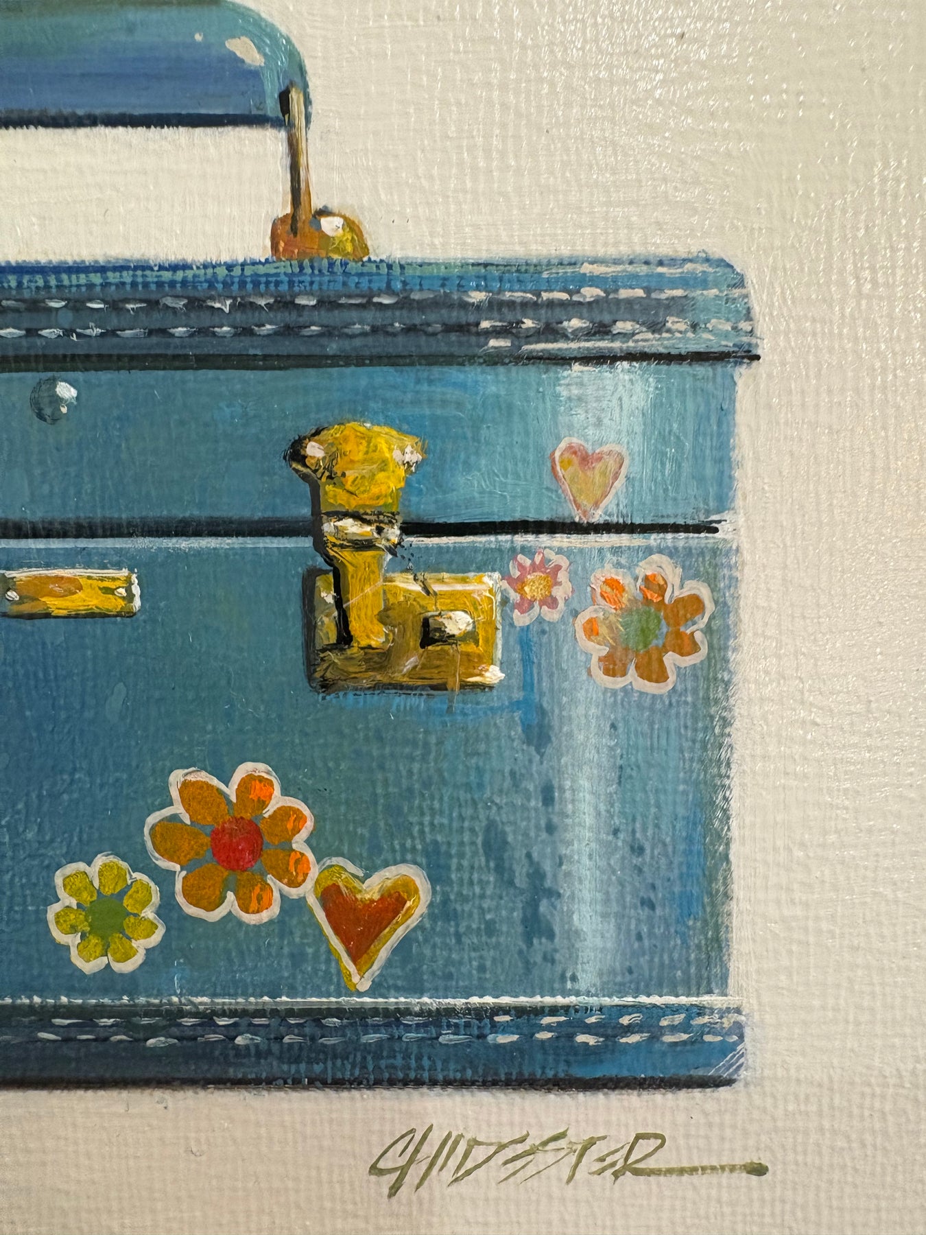 Realistic painting of a vintage blue train case with flowers. 6"X6" oil on canvas. Minimalist off white and grey background.