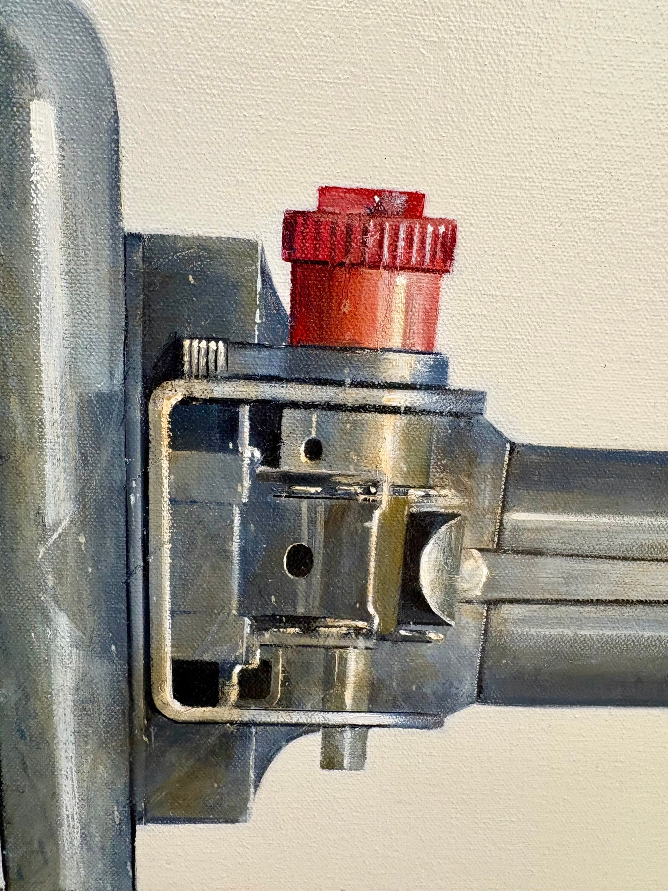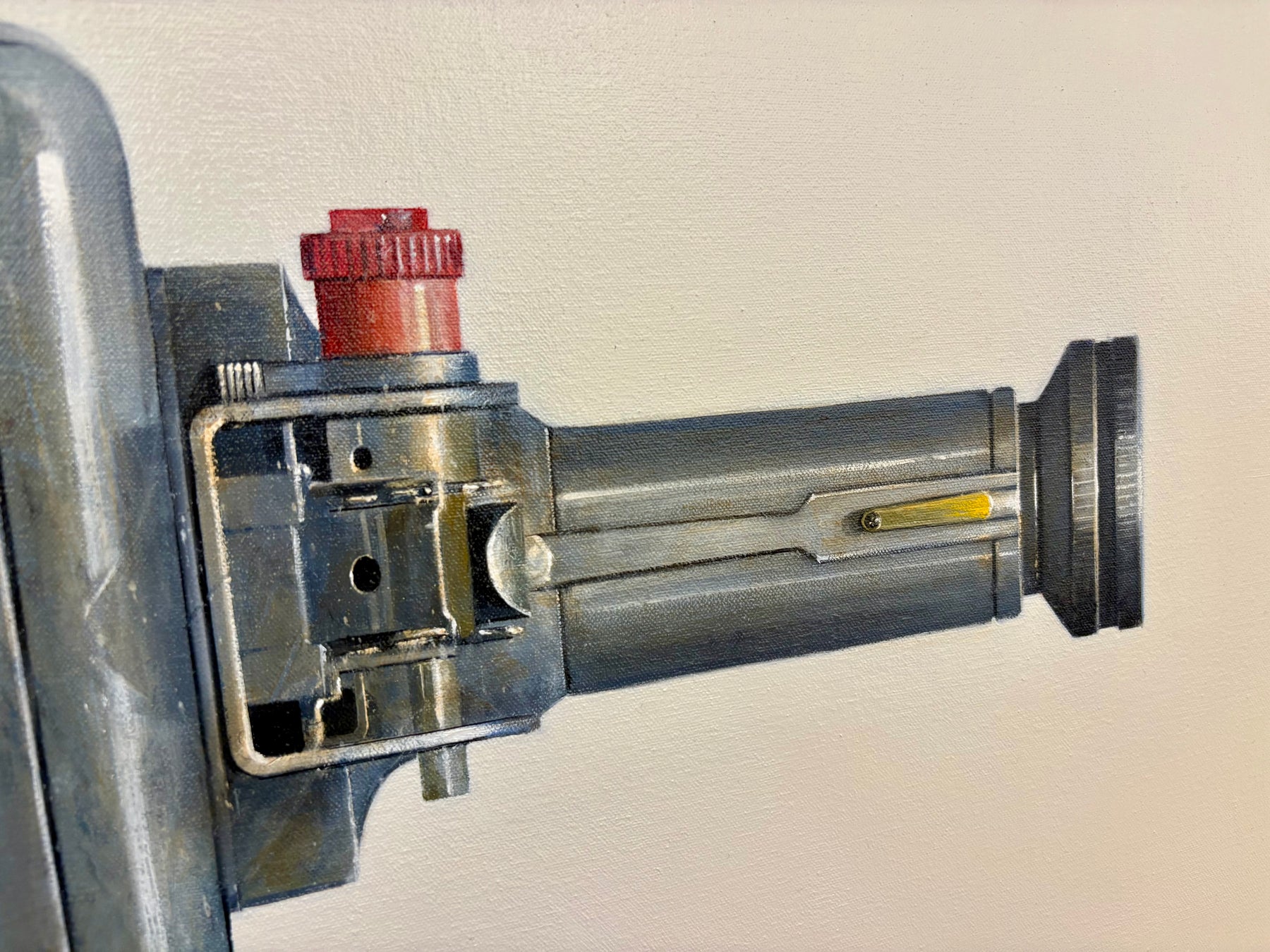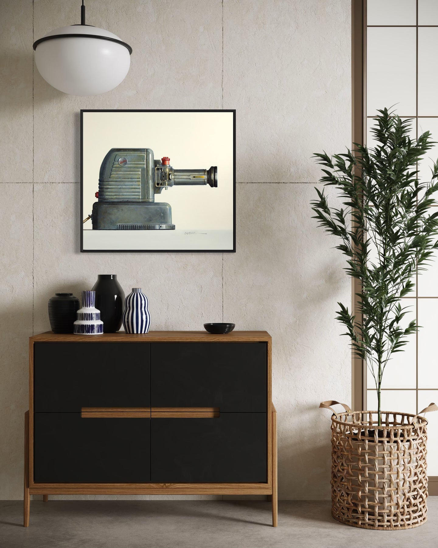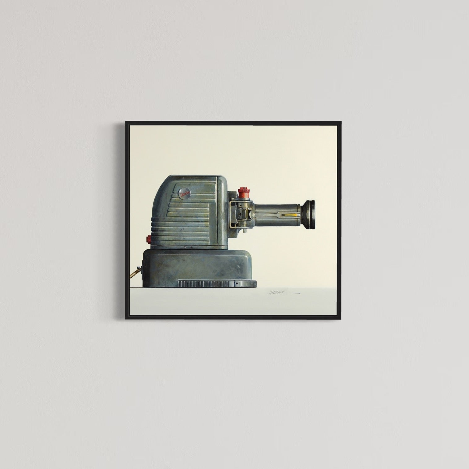 Realistic painting of a vintage Viewlex  projector. 26"x24" oil on canvas. Minimalist off white and grey background.