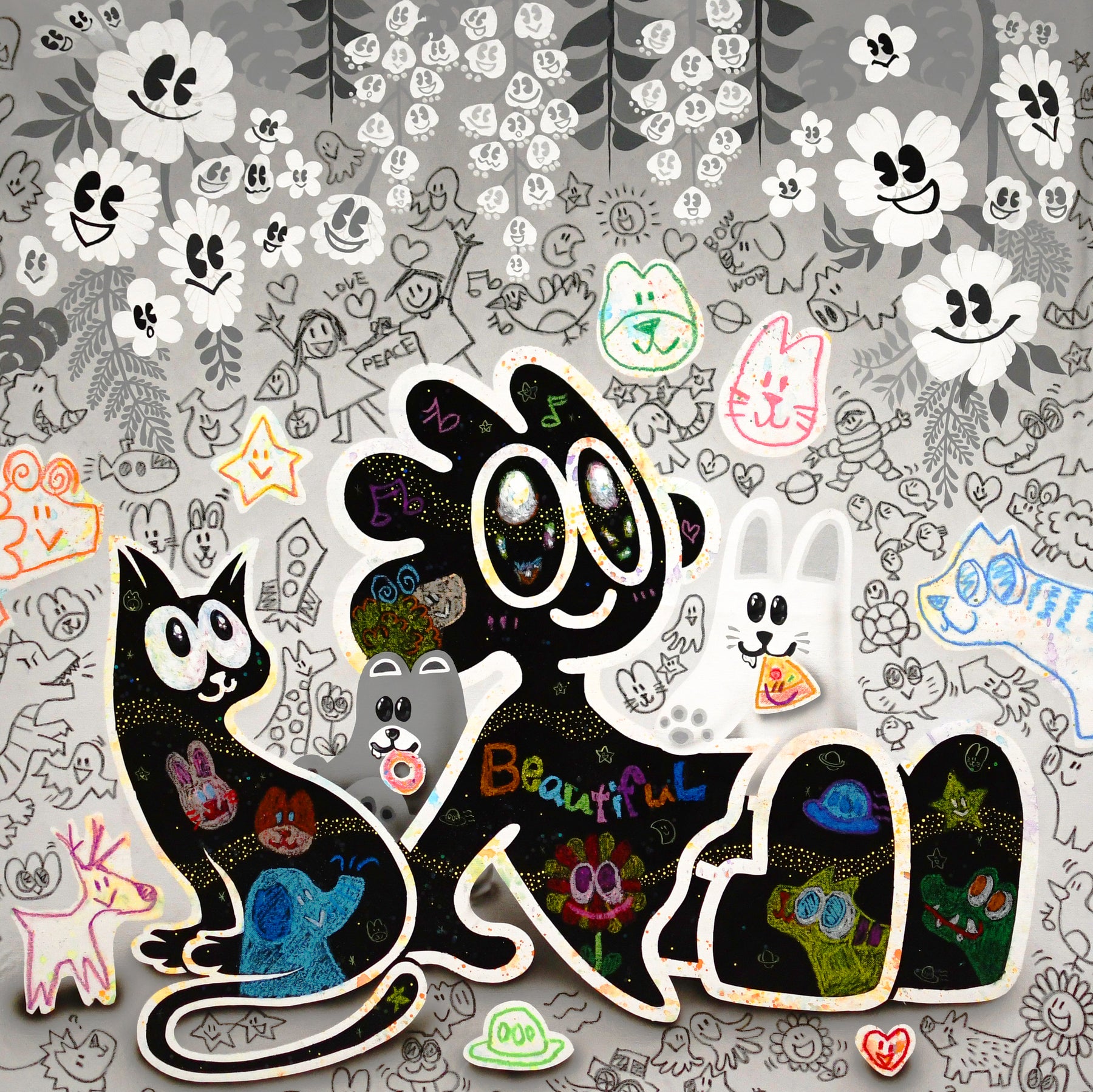 Yusuke Toda - YUM and Friends Viewing Flowers, black and white, multicolor contemporary painting. Acrylic and oil stick on 35.4" x 35.4" canvas