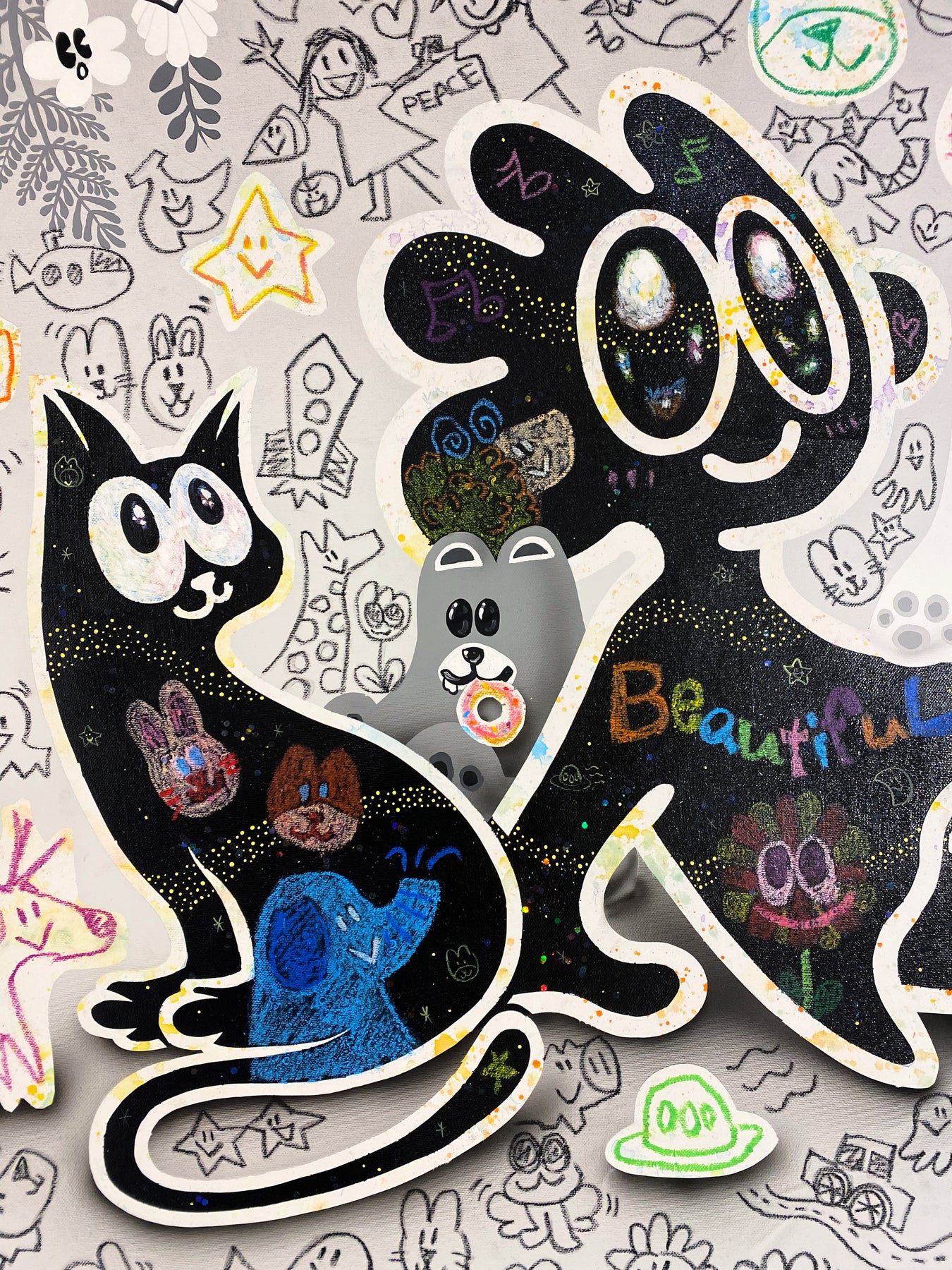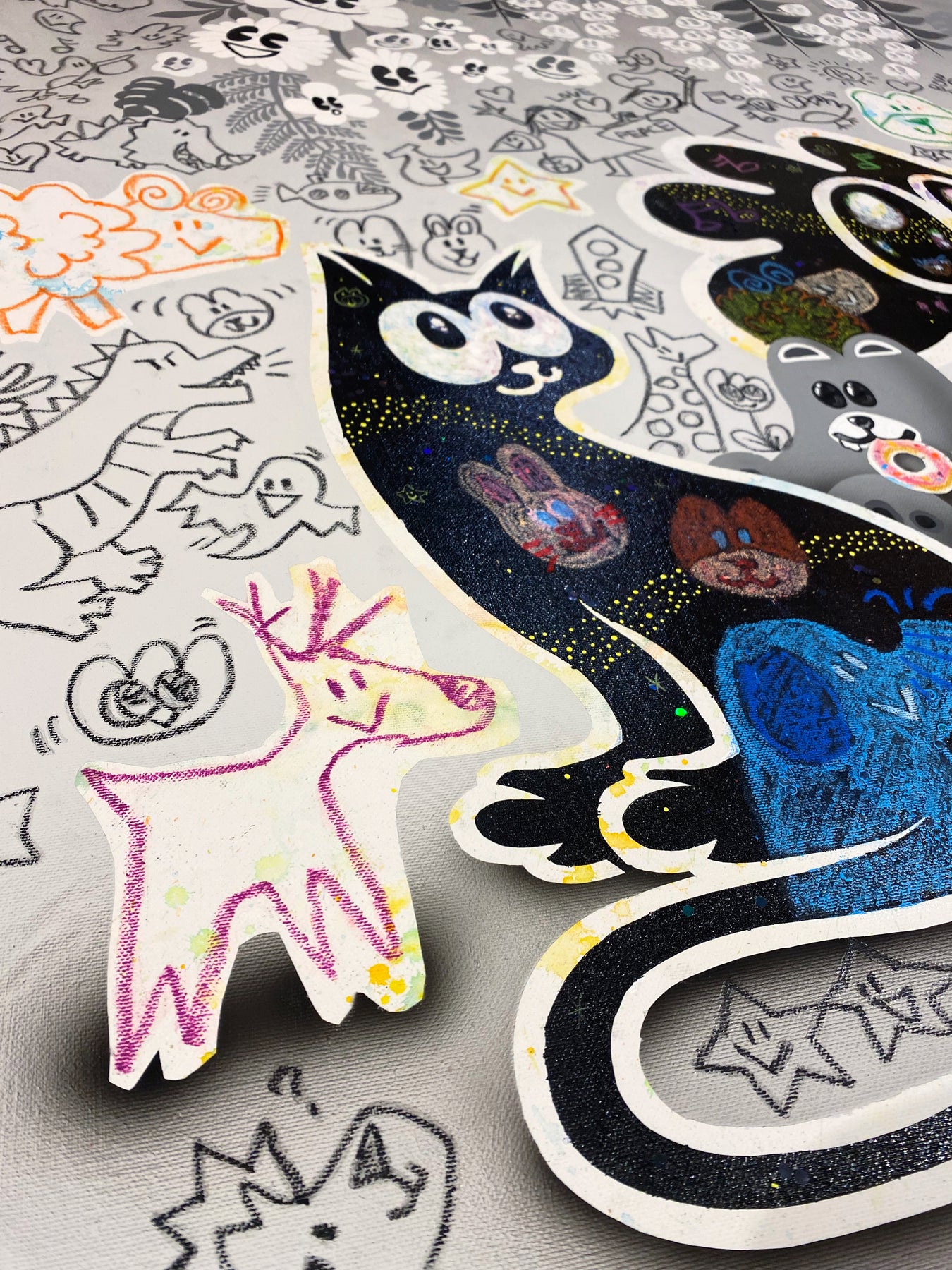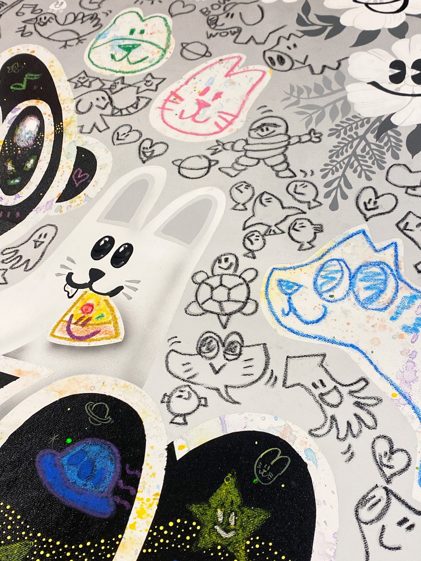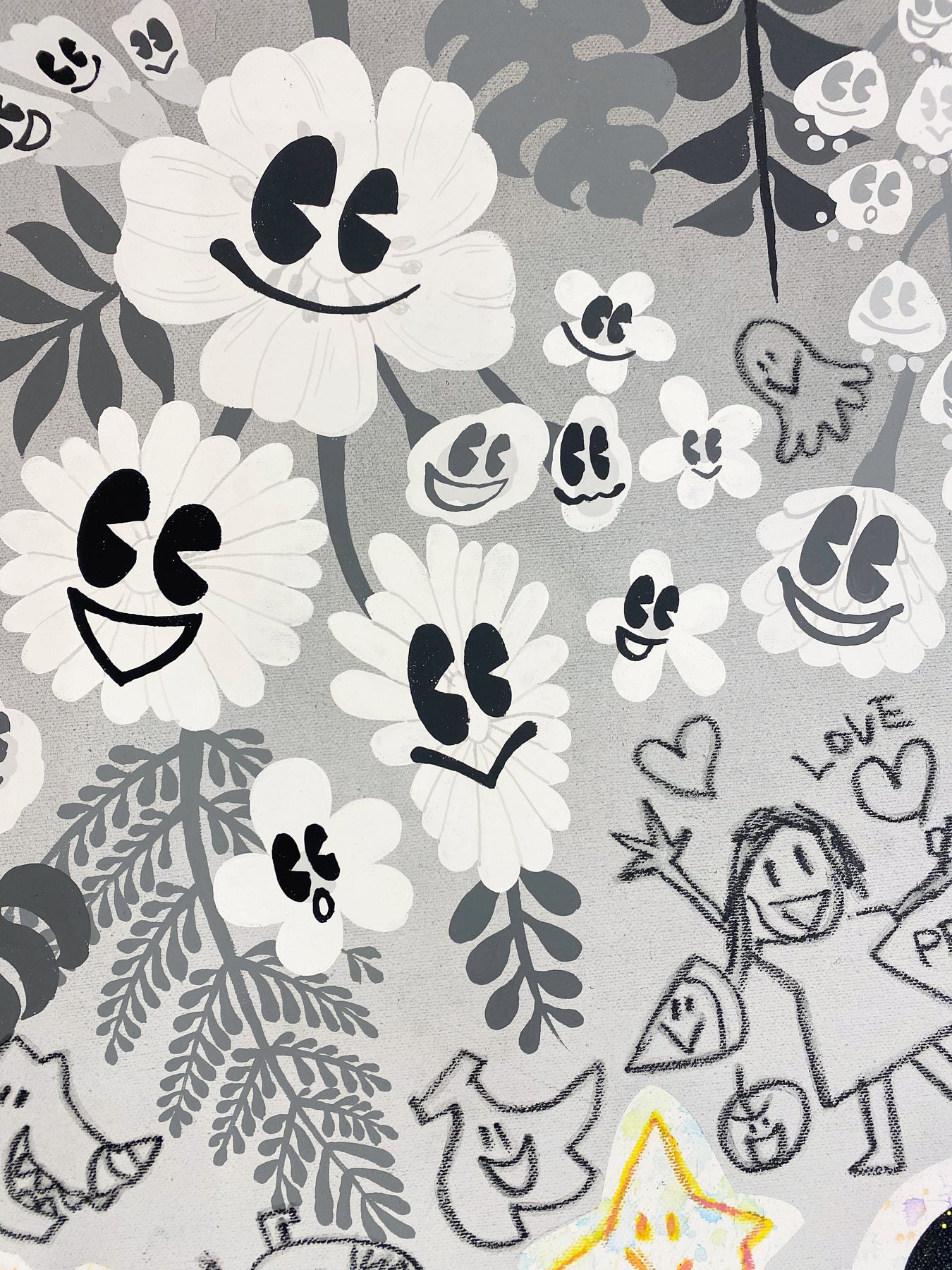 Detail of Yusuke Toda - YUM and Friends Viewing Flowers, black and white, multicolor contemporary painting. Acrylic and oil stick on 35.4" x 35.4" canvas