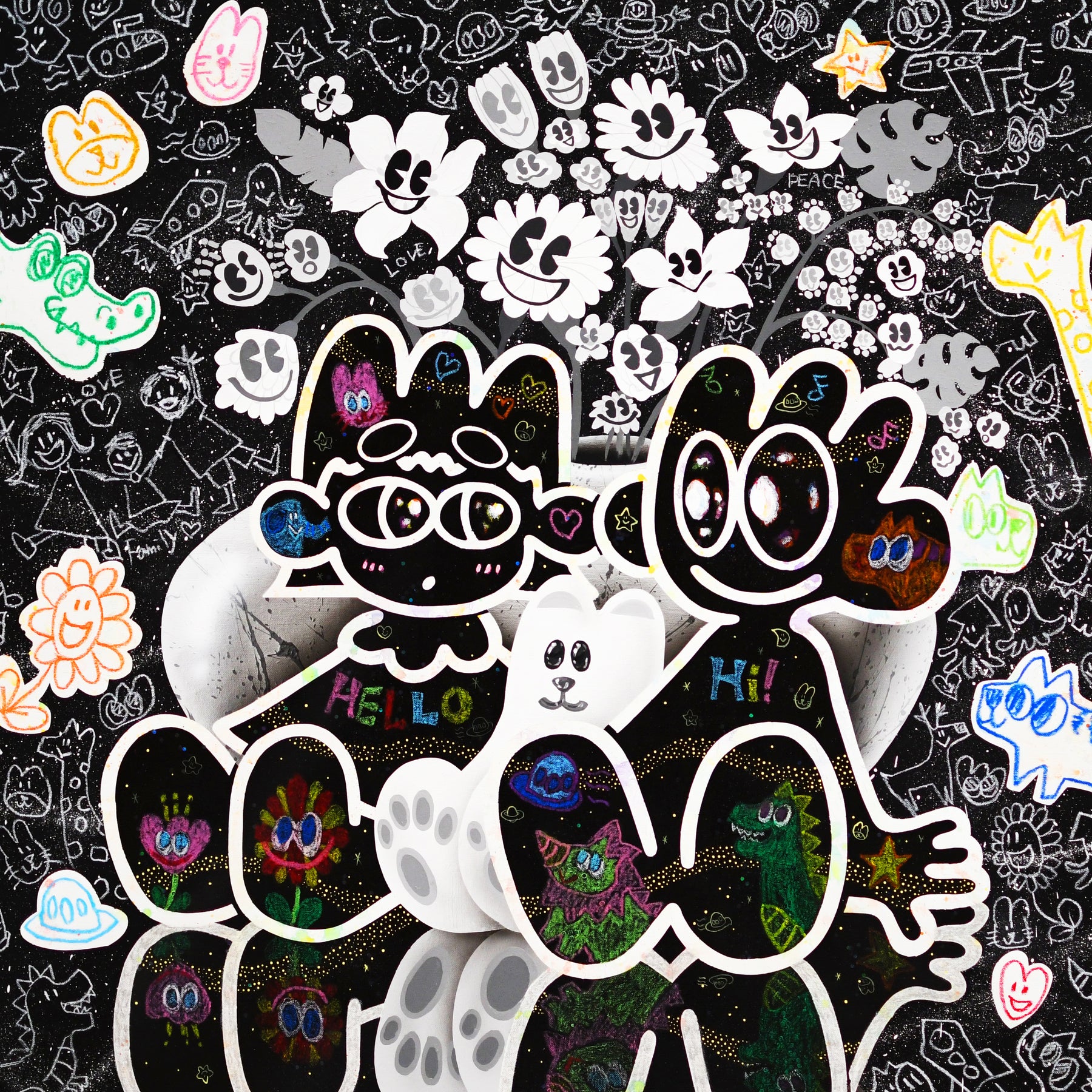 Yusuke Toda - YUM and RIN, black and white, multicolor contemporary painting. Acrylic and oil stick on 35.4" x 35.4" canvas