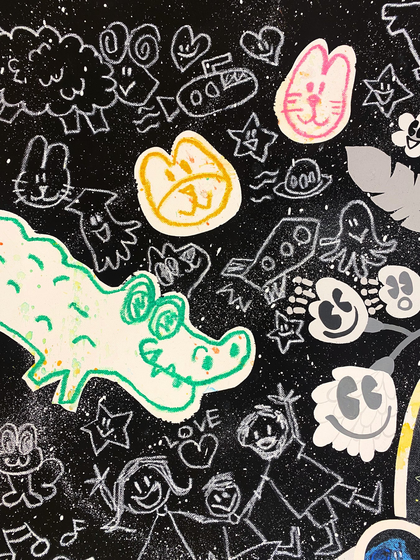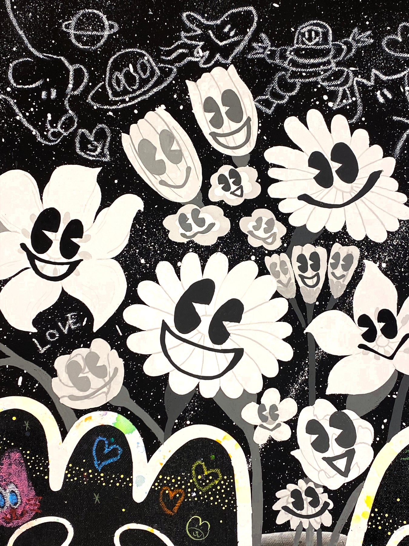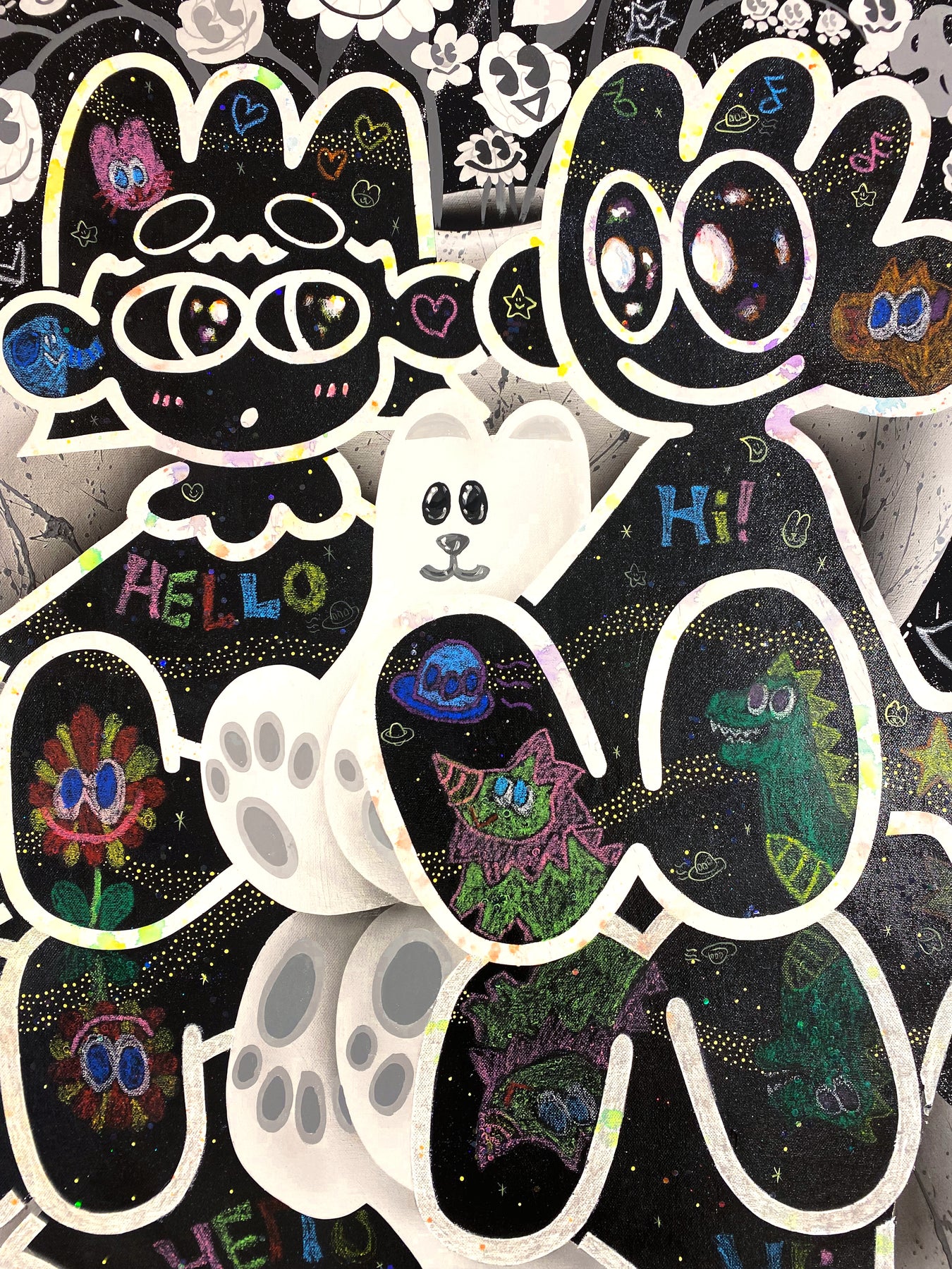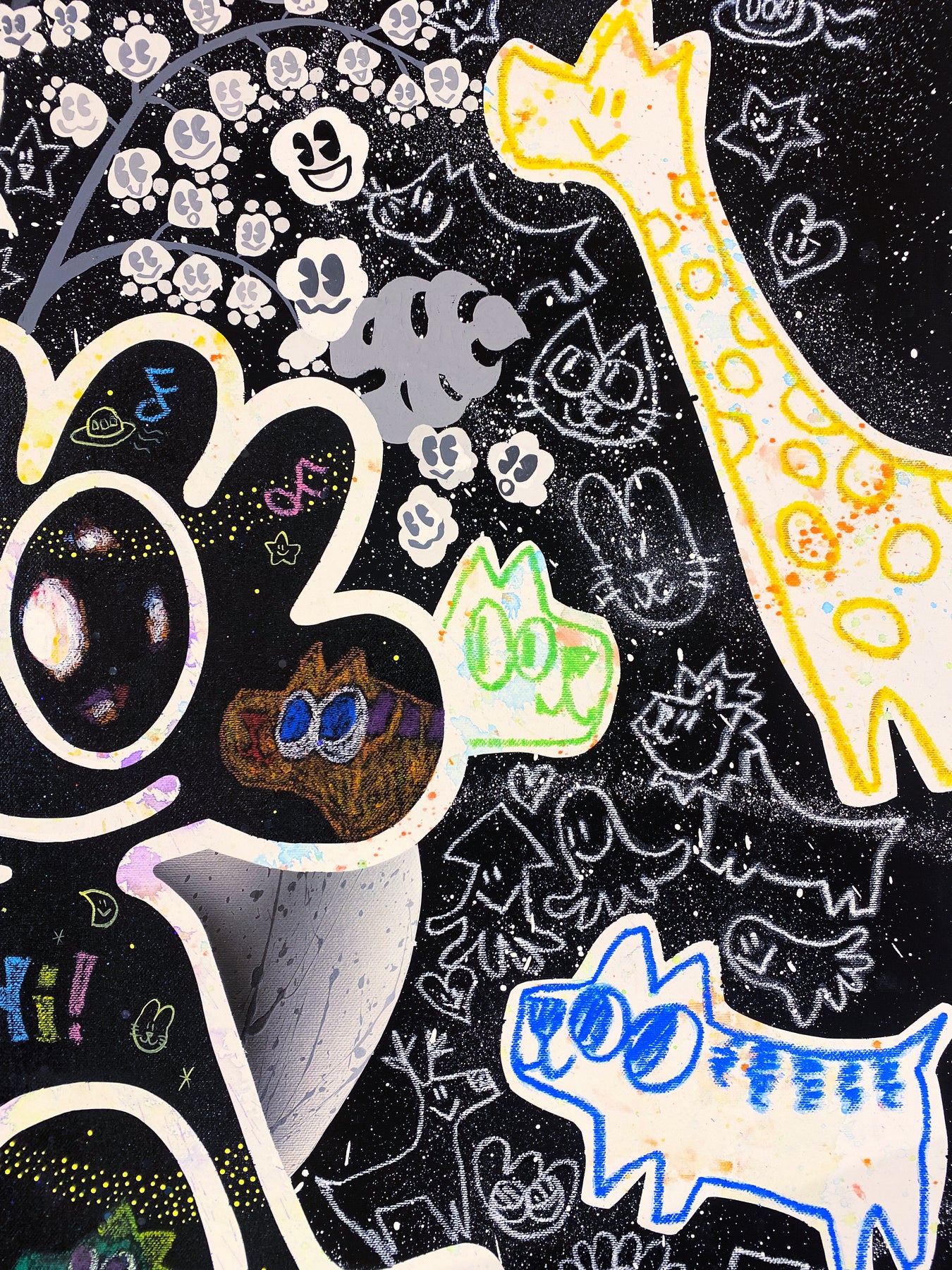 Detail of Yusuke Toda - YUM and RIN, black and white, multicolor contemporary painting. Acrylic and oil stick on 35.4" x 35.4" canvas