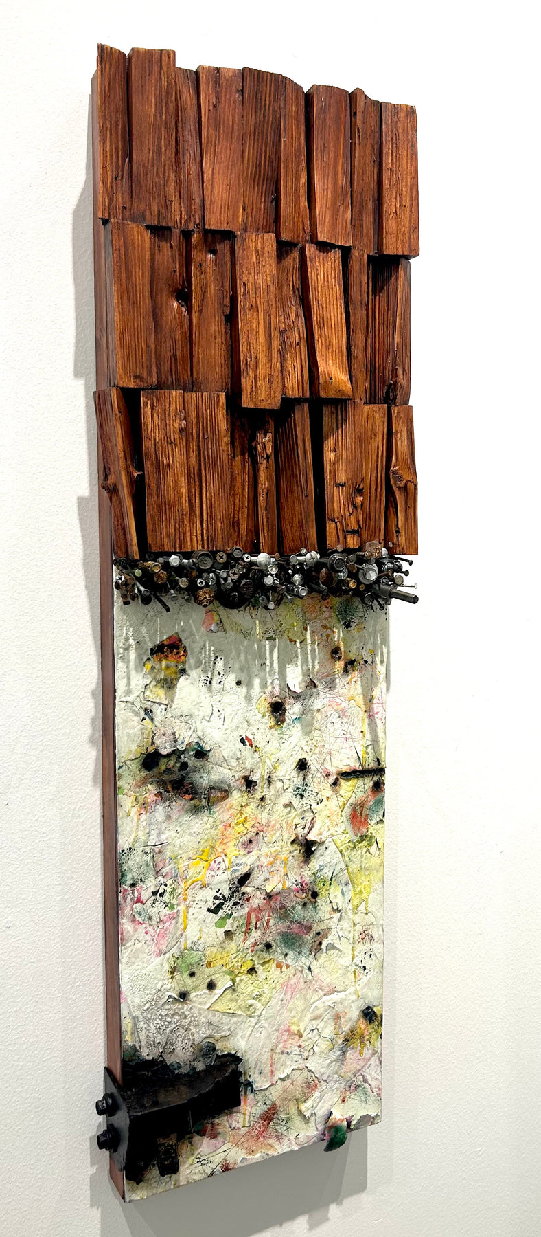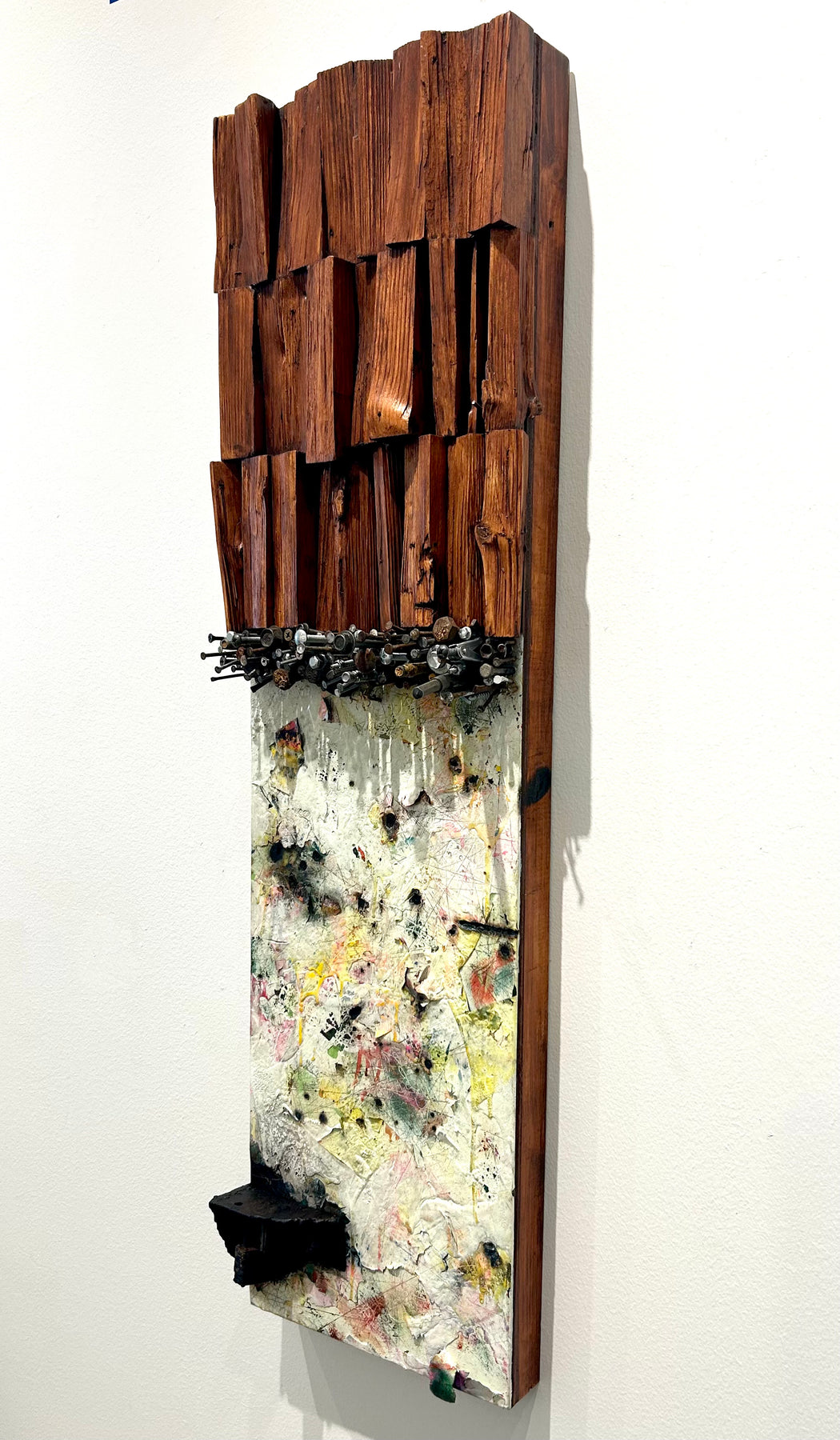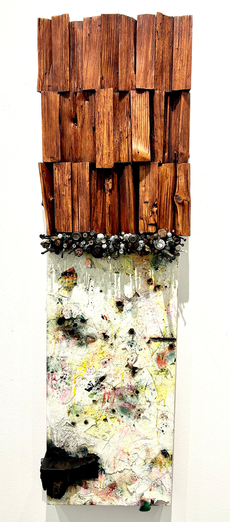 Spray paint, latex paint, acrylic marker, metal, nails, pine, plywood