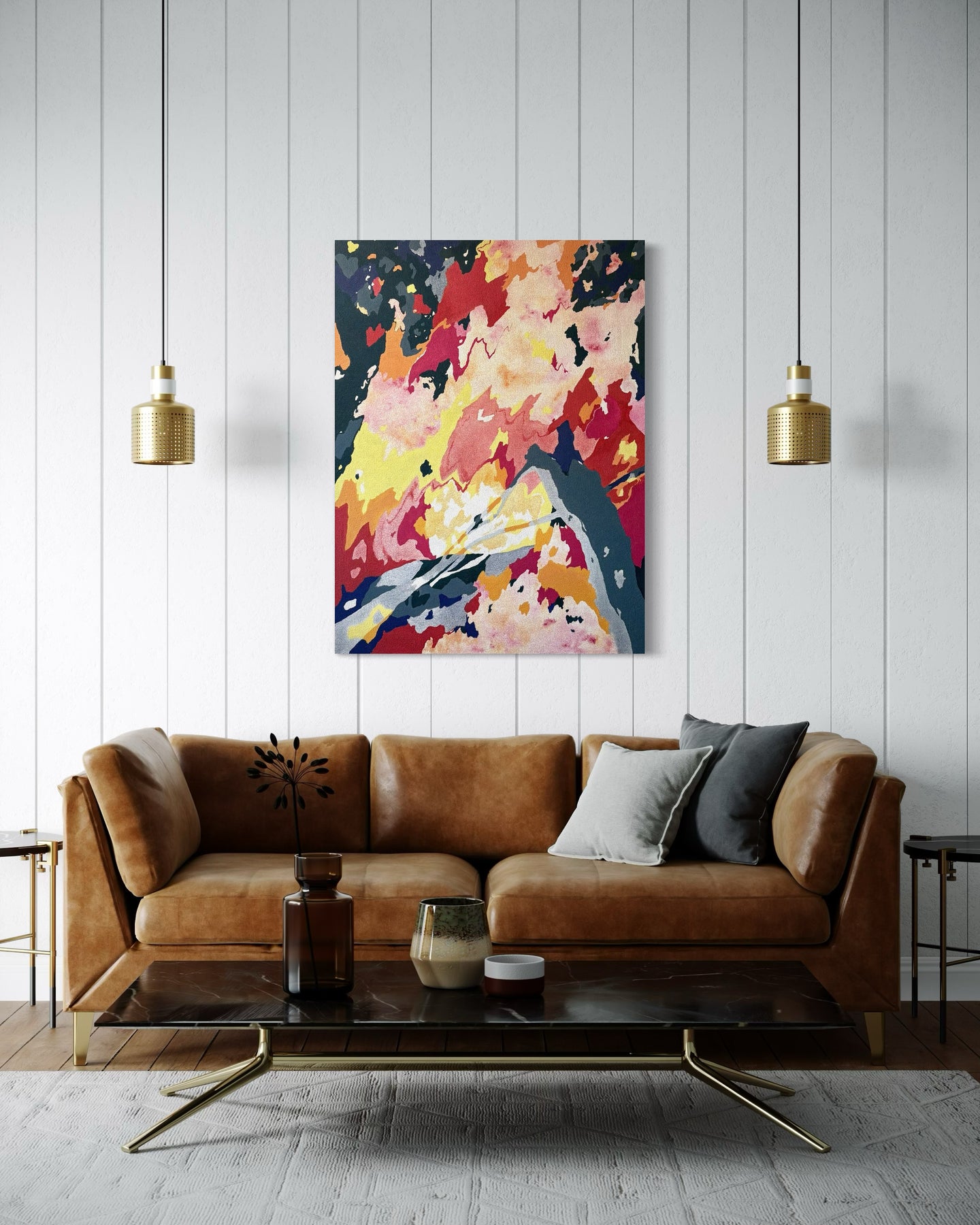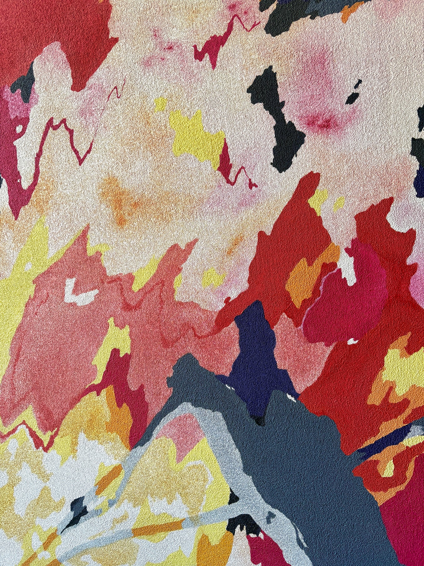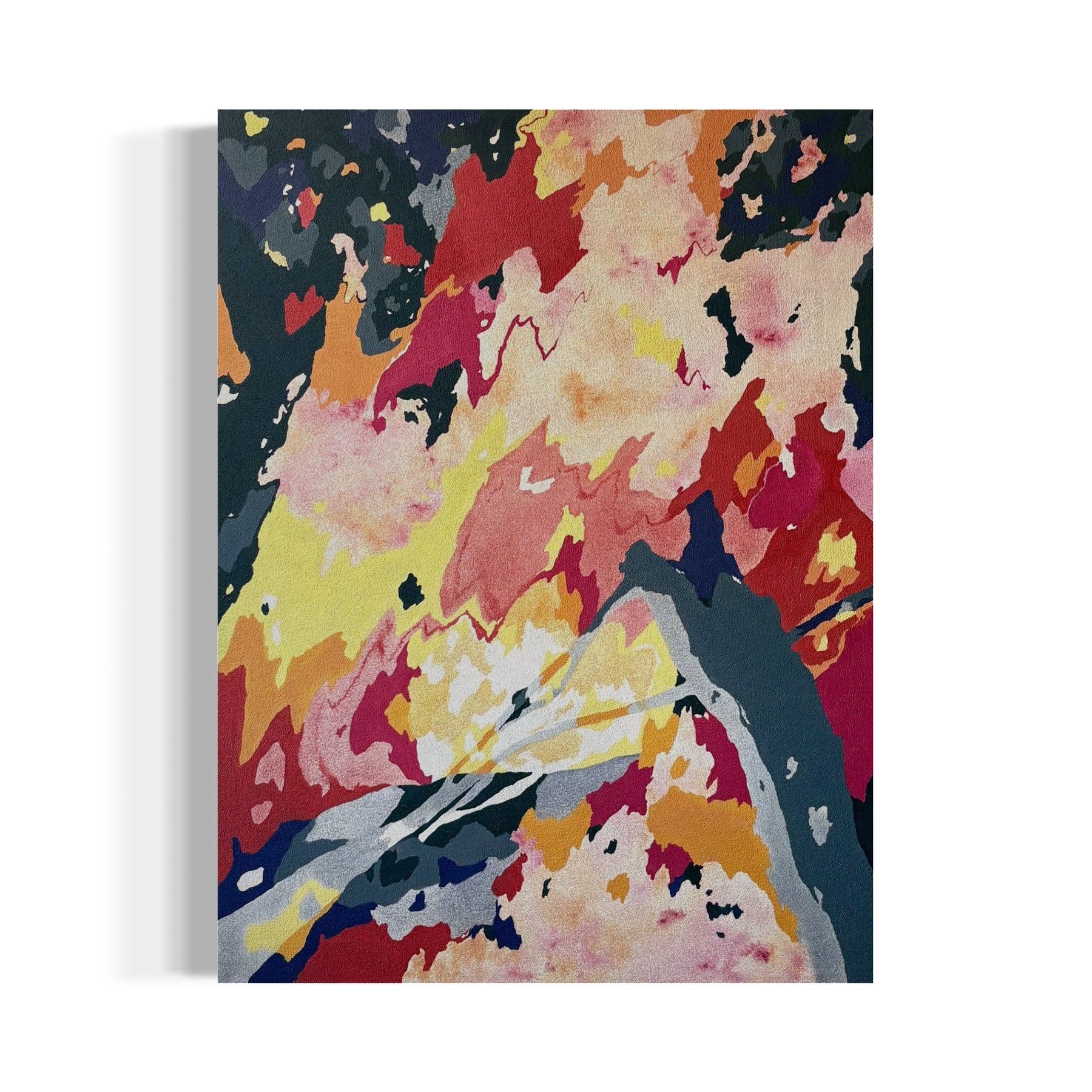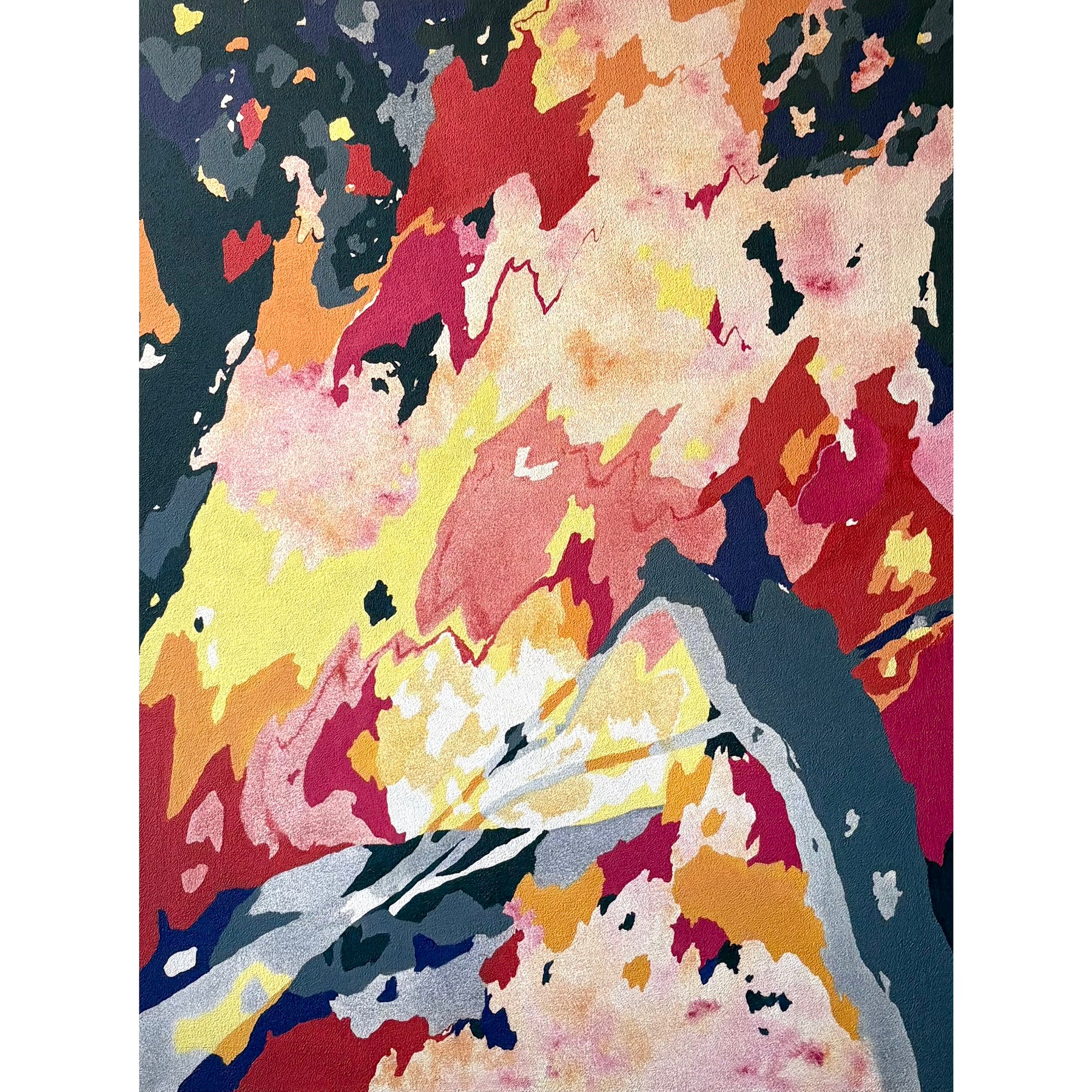 abstract fire bonfire logs with gradient pink and orange color and red blue shapes in opaque oil paint layering transparent organic shapes