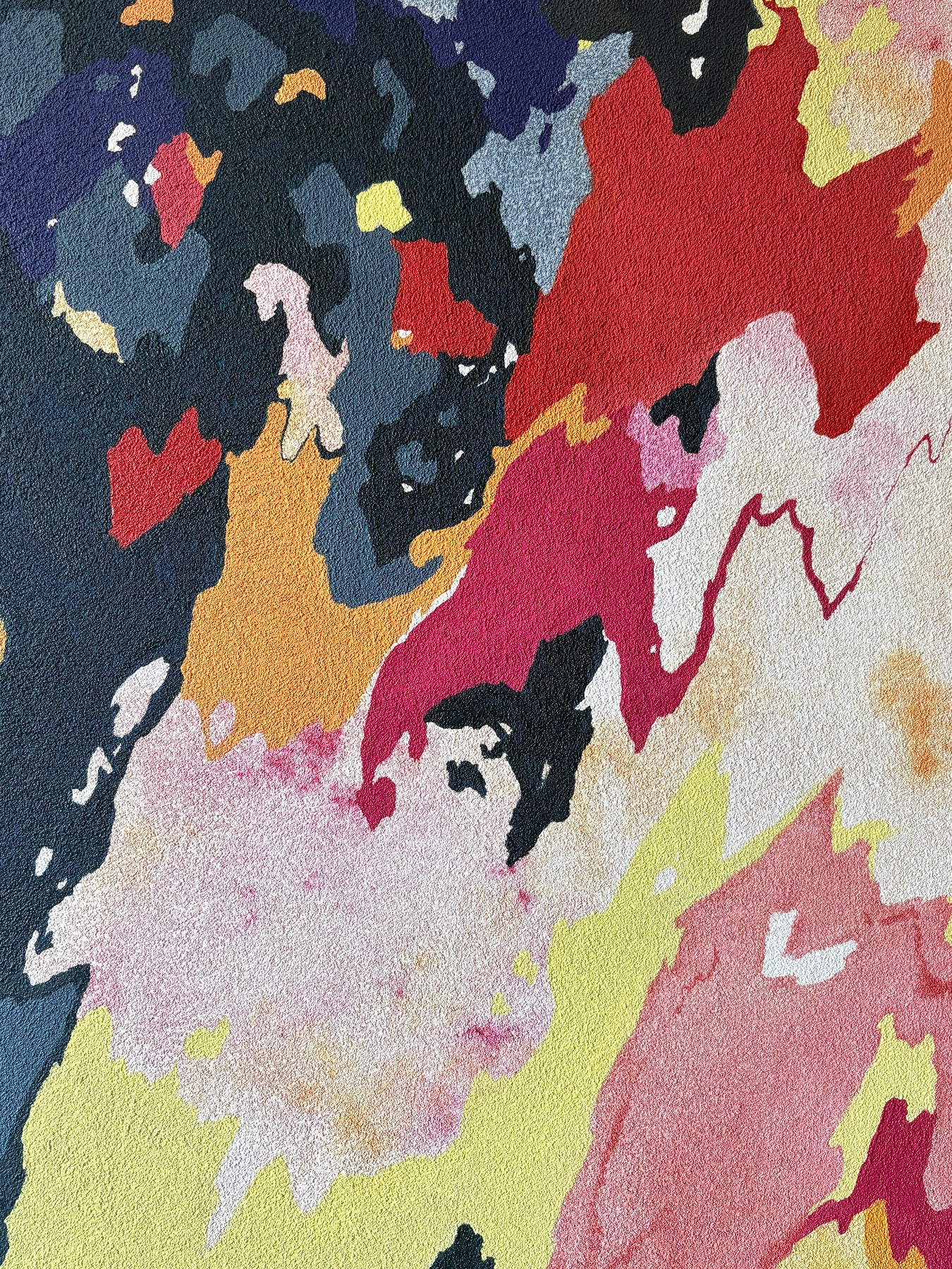 Erin Touey’s work straddles the line between abstraction and representation in her new series of pumice-primed canvas oil paintings. Touey utilizes fluid shapes, variation of line weight, non representational color, distortion of perspective, and in this series, the texture of the pumice primed canvas to bring her often tangible subject matter into the abstract realm. With a limited palette consisting only of Phthalo Blue, Cadmium Yellow, and Quinacridone Magenta, Touey challenges herself to mix all of her colors. The white of the canvas is preserved deliberately, the negative space making shapes that sometimes jump forward or fall back.