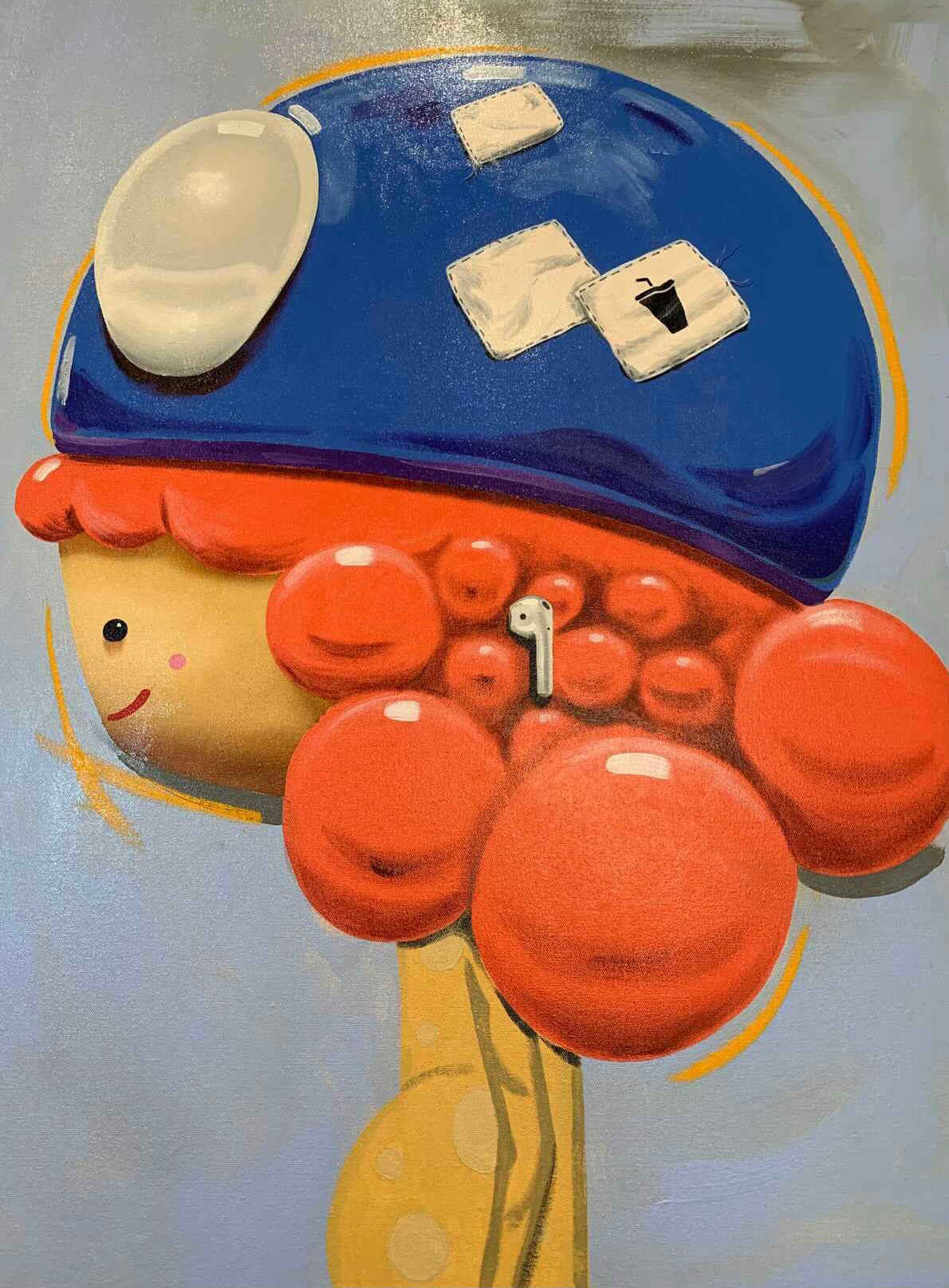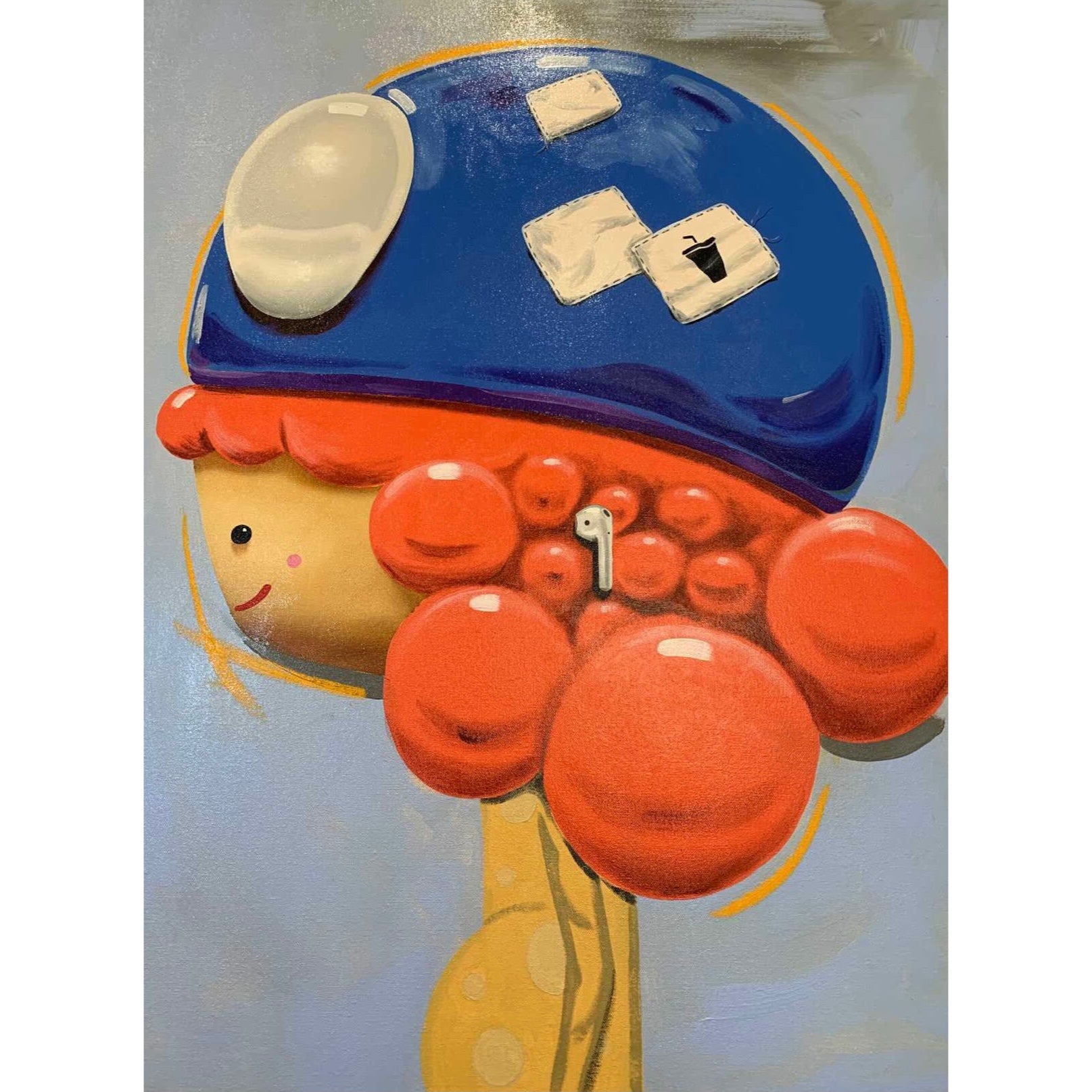 David’s paintings explore the connection between childhood, innocence, and adult trauma, tying together his boyhood love of cartoons and his experience in the military as a young man. Each piece of David’s is ingeniously unique and particular, with a set of clues, facial expressions, objects, and colors that work together to tell a story of our inner child facing adult experiences, utilizing a mixture of realistic and cartoonish elements. His characters all wear a helmet with big glossy spheres, simple smiles or frowns on their faces, and an object or two, such as a burger or a child’s toy, that reflect emotions both blatantly and in a way that is hidden, not escaping the nuance of human experience. He is interested in the ways in which childhood experiences can shape our adult lives, often dealing with issues such as fear, loss, and grief, while also offering a message of hope and resilience.