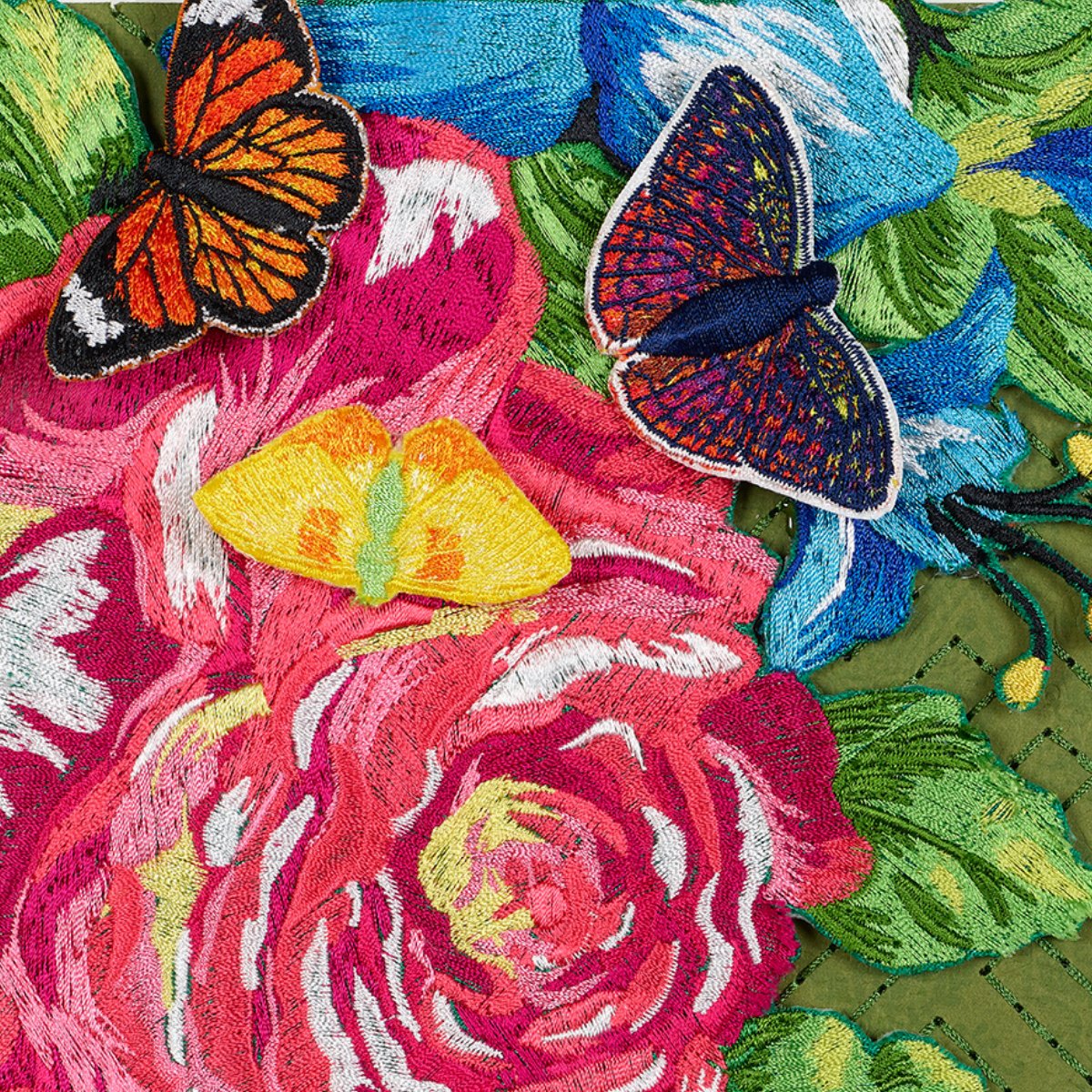 The floral corners start with an embroidered luxury box or bag. The embroidery is stitched directly through the box using tonal thread to create an intriguing background. The flowers in the corners are designed, embroidered and added to the background as a collage. The butterflies are also embroidered in the studio and add to the box as a final step. Each box or bag is a fusion of art and fashion, truly a one-of-a-kind masterpiece. Delivery time for a custom Floral Corner is 4 weeks.