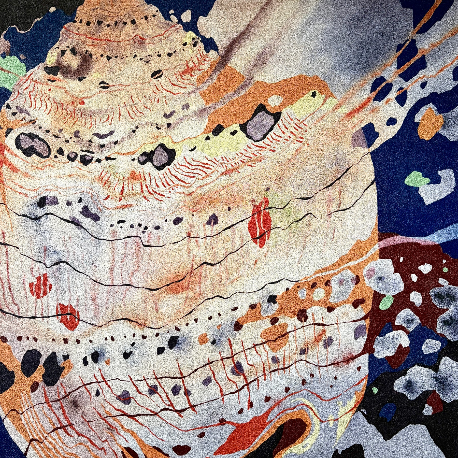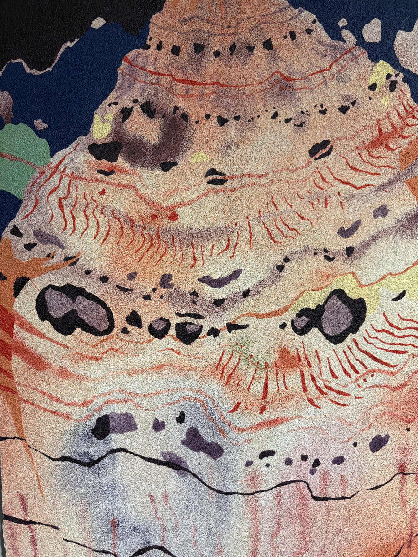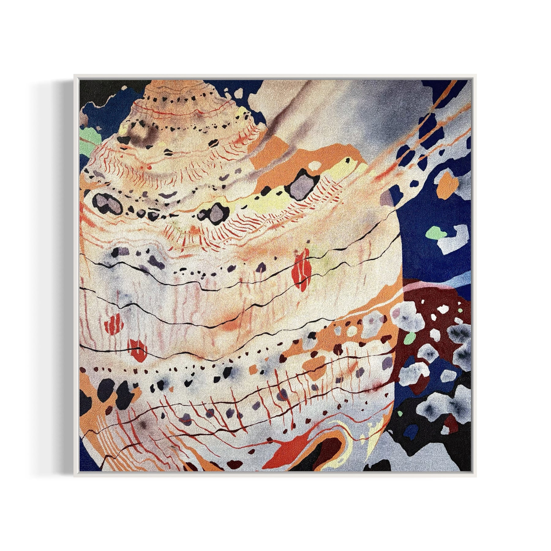 pumice primed canvas textured with rough rock surface in oil paint creating abstract paintings inspired by natural patterns in nature organic shapes gradient background opaque color blocking line work weight  sea shell in pink peach tones by local artist Erin Touey