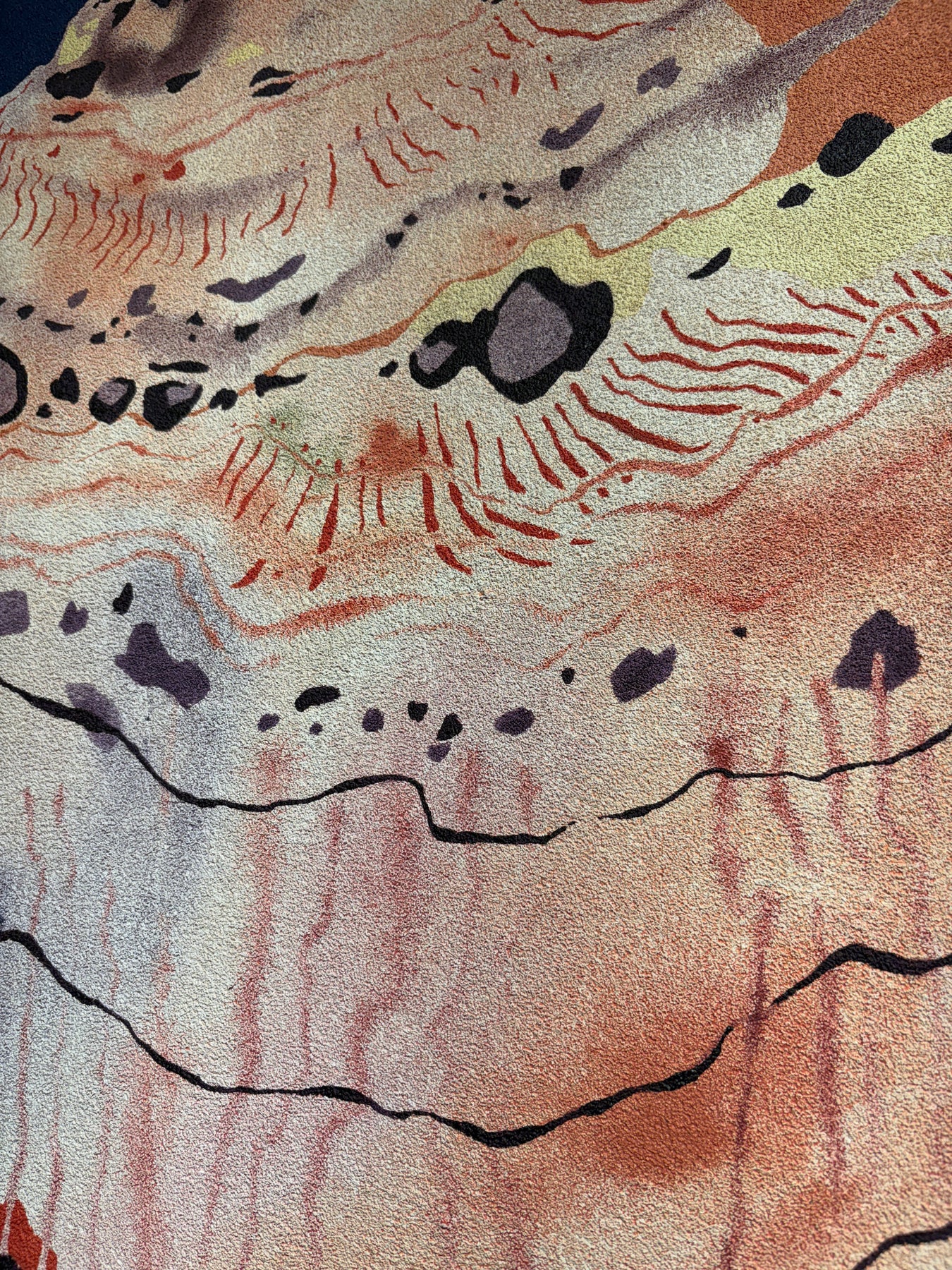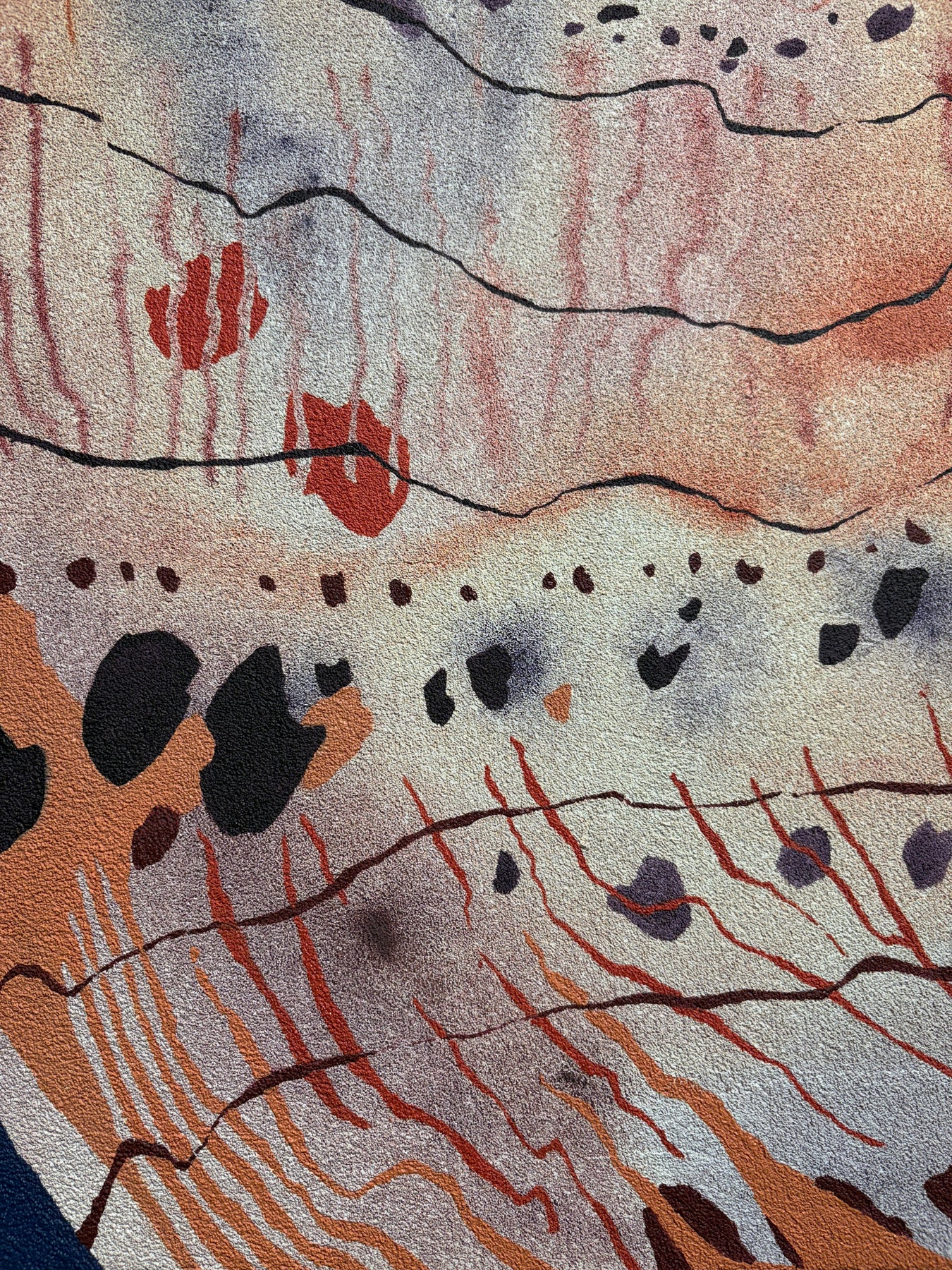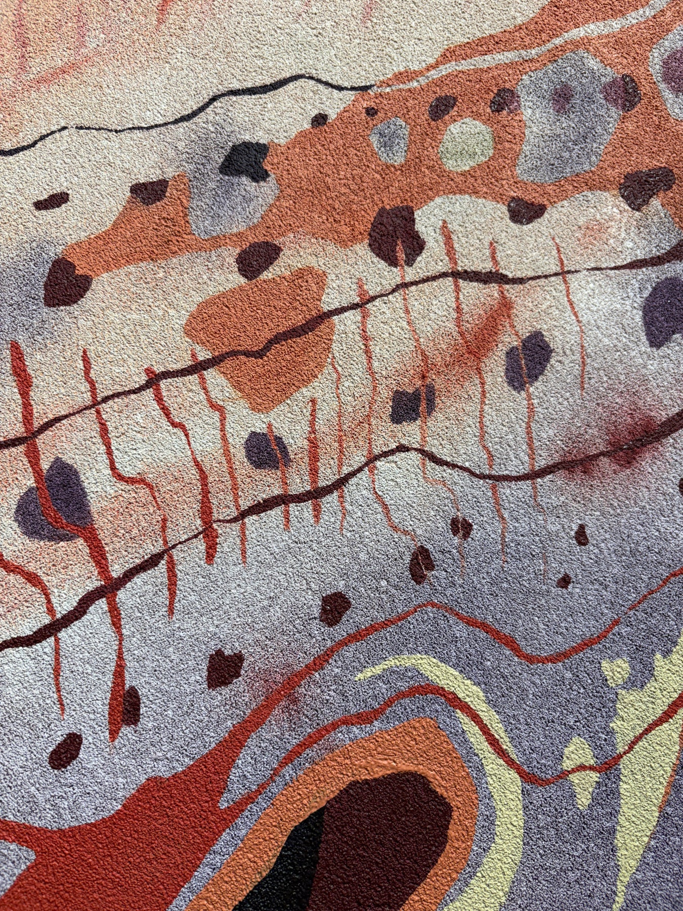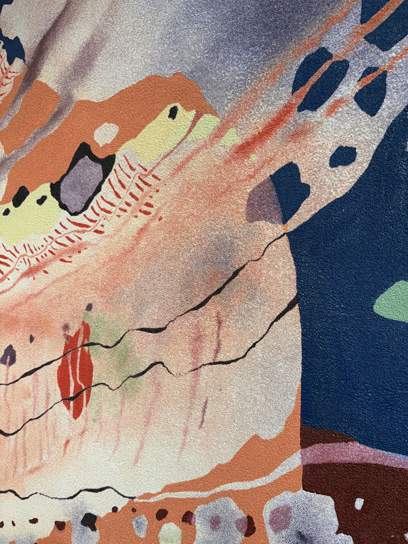pumice primed canvas textured with rough rock surface in oil paint creating abstract paintings inspired by natural patterns in nature organic shapes gradient background opaque color blocking line work weight  sea shell in pink peach tones by local artist Erin Touey