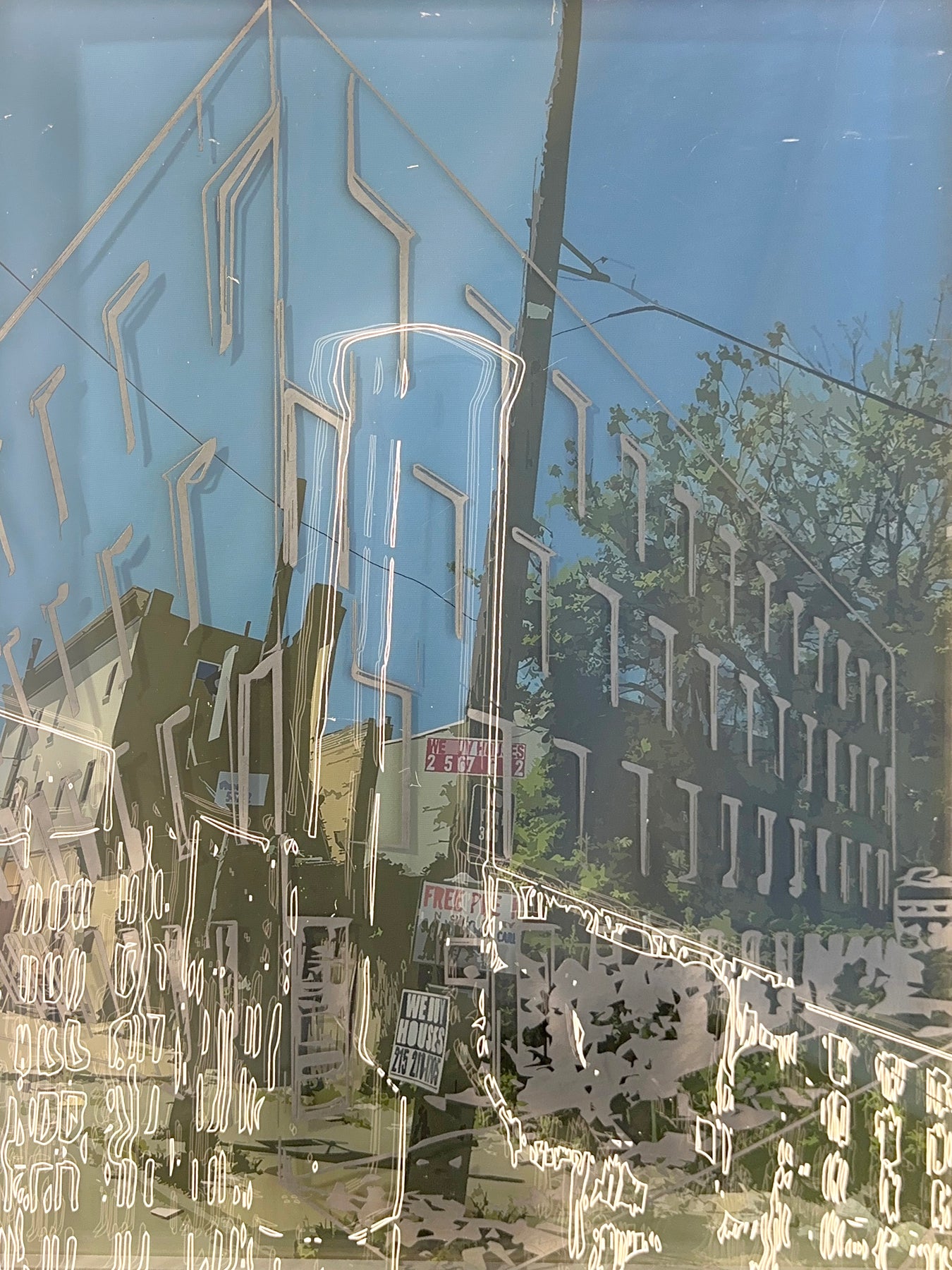 street post with electrical wires and street signs and corners of houses in Philadelphia, an overlapping doodle in white lights of a building from another perspective